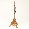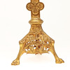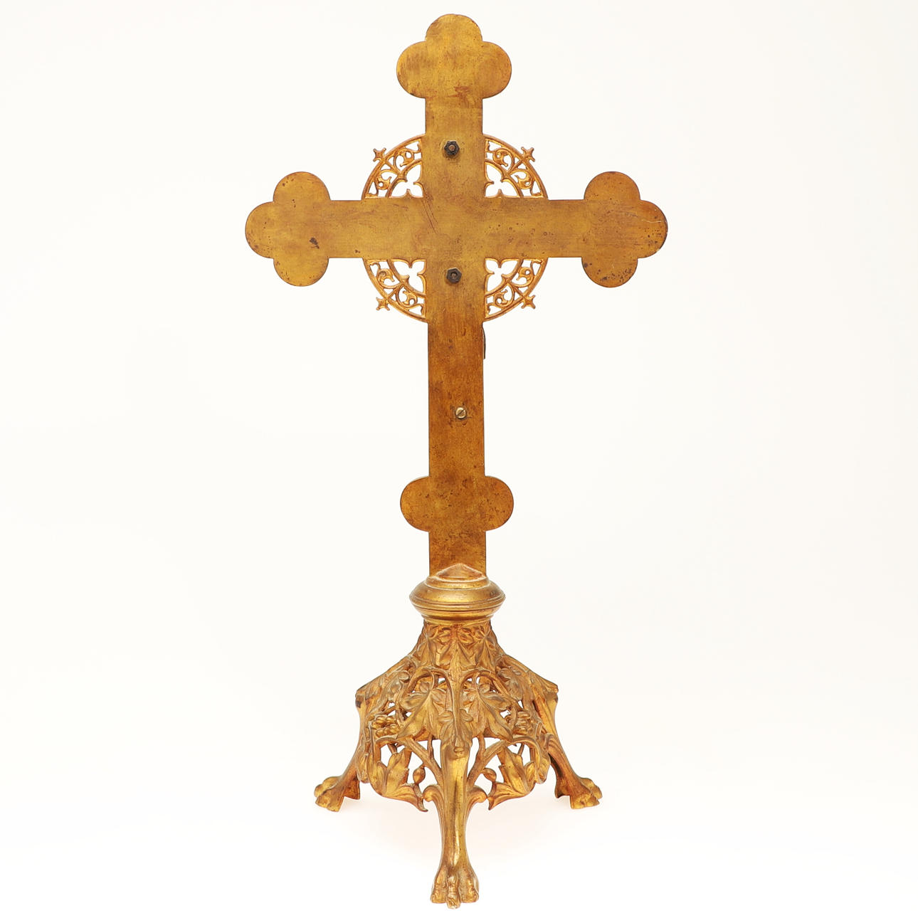 Krucifix, mässing, ca 1900. Krucifix i form av ett liljekors av prydnadsmässigt lättad och delvis perforerad mässing, som visar den korsfäste Jesus, stående på en trigonal och tendril bas, H.54.5cm, W.28cm, D.21cm.