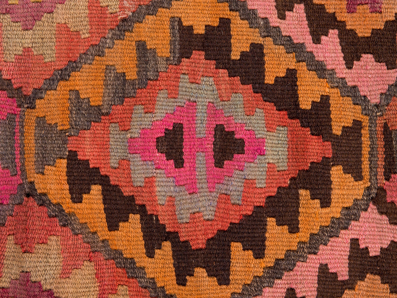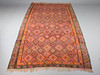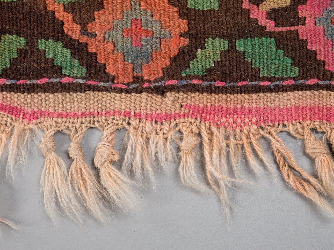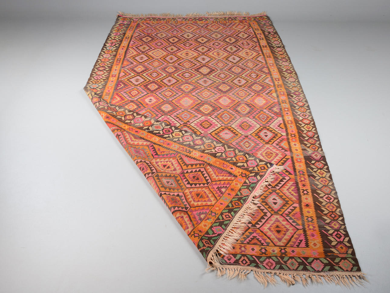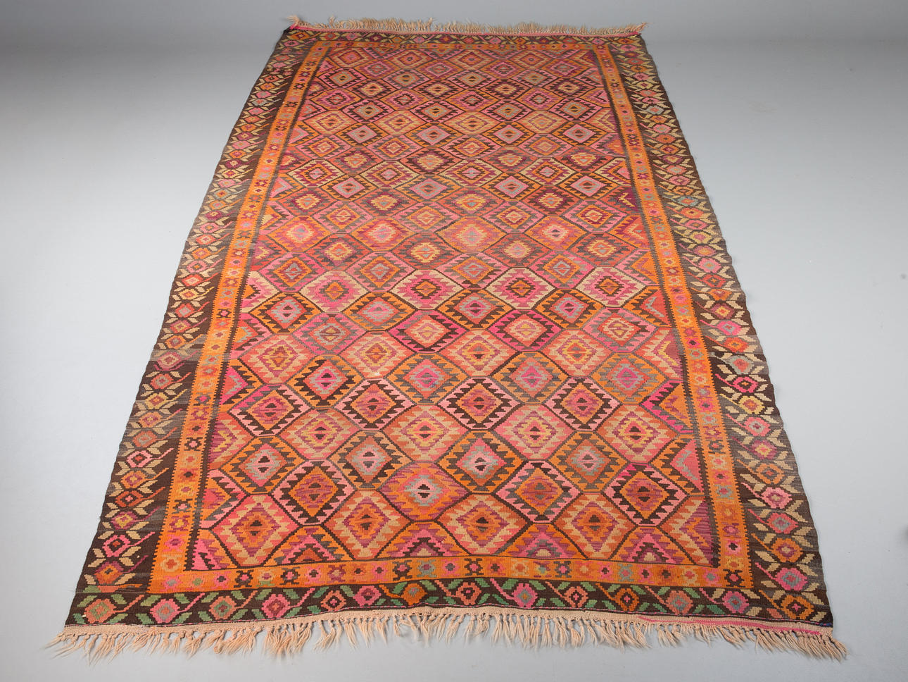 Kelim/matta, tyg. Handvävd matta av garn och tråd med geometriskt rutigt mönster i polykroma färger, kantad på långsidorna, 200x400cm.