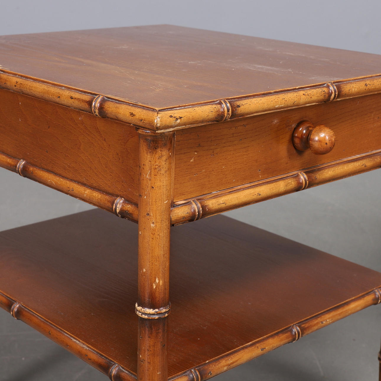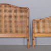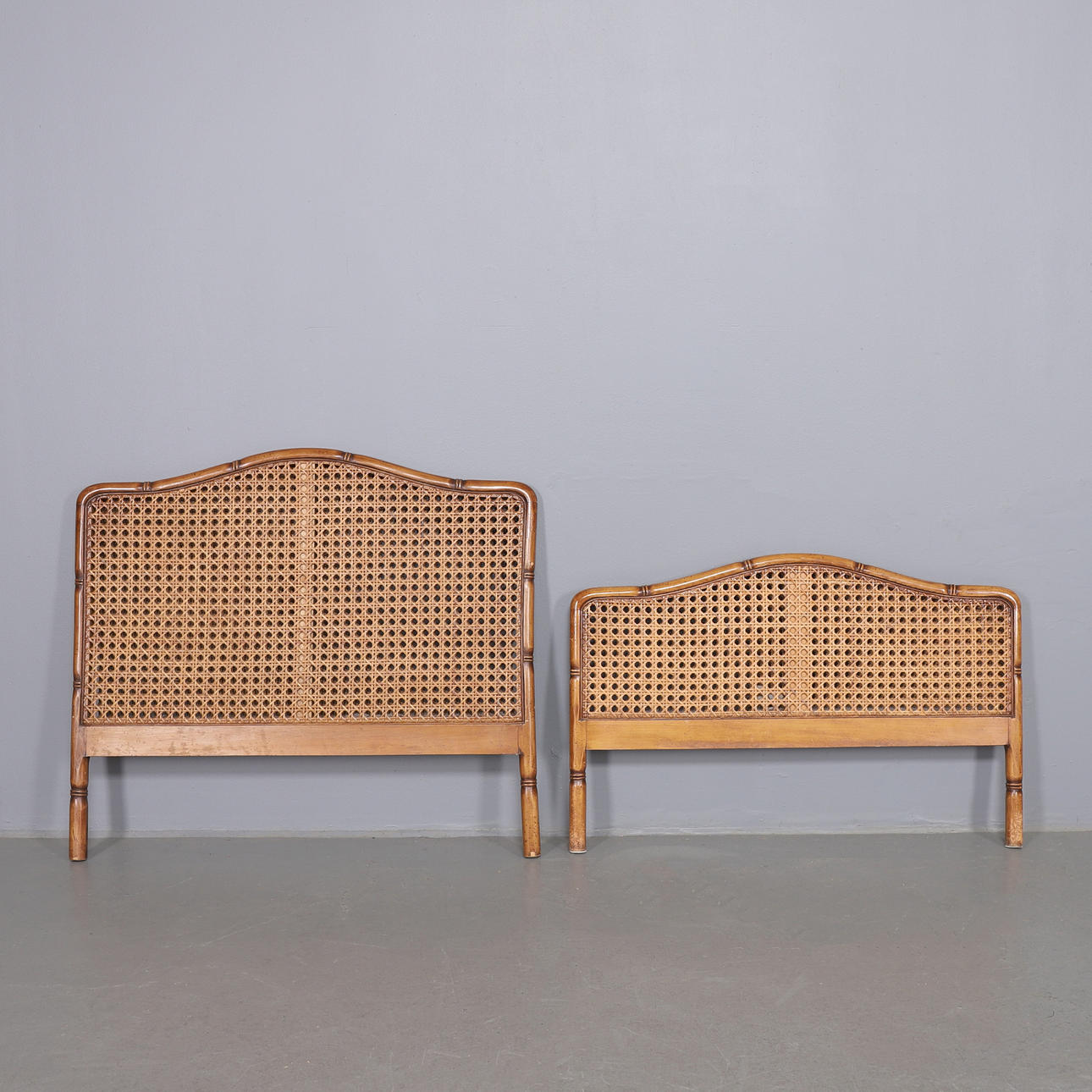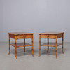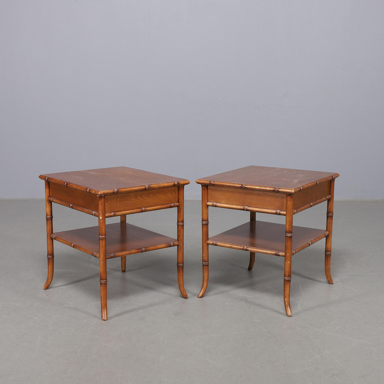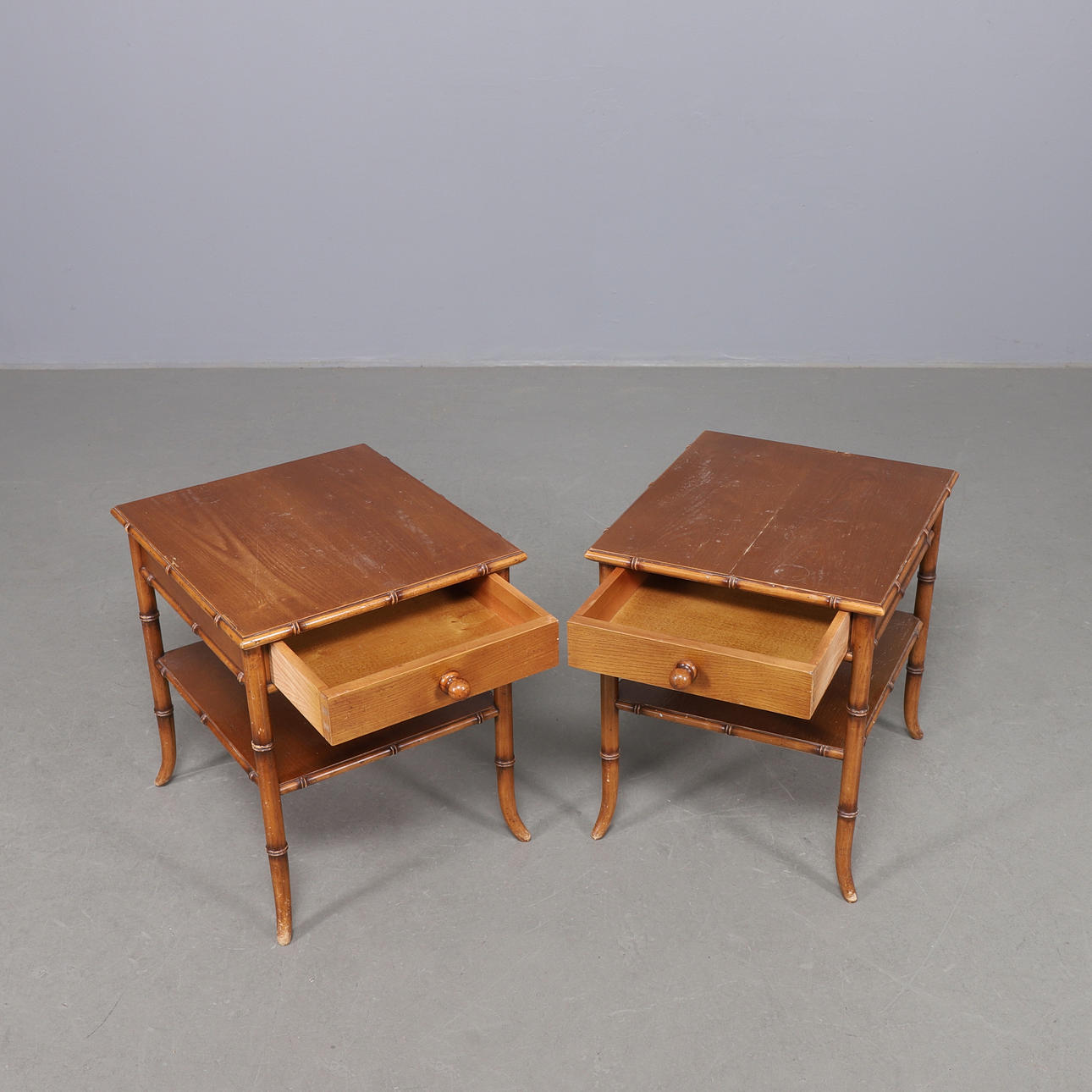 Sänggavlar för två sängar, fast montage på resårmadrass med 105 cm bredd, samt tillhörande sängbord med en utdragslåda vardera.