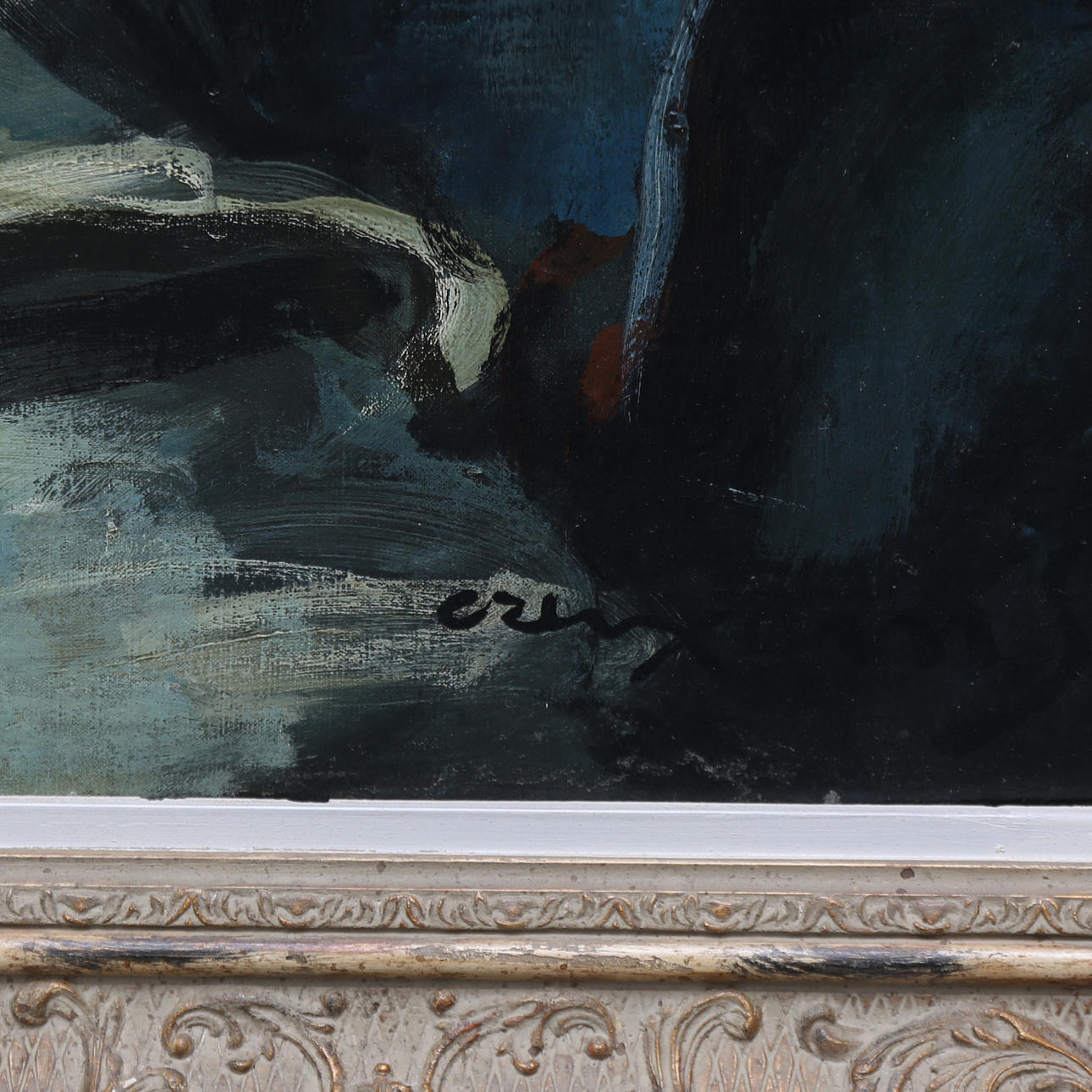 I gott skick. Lätt lossat tyg Ram i gjutet och målat trä, med skador och förlust.