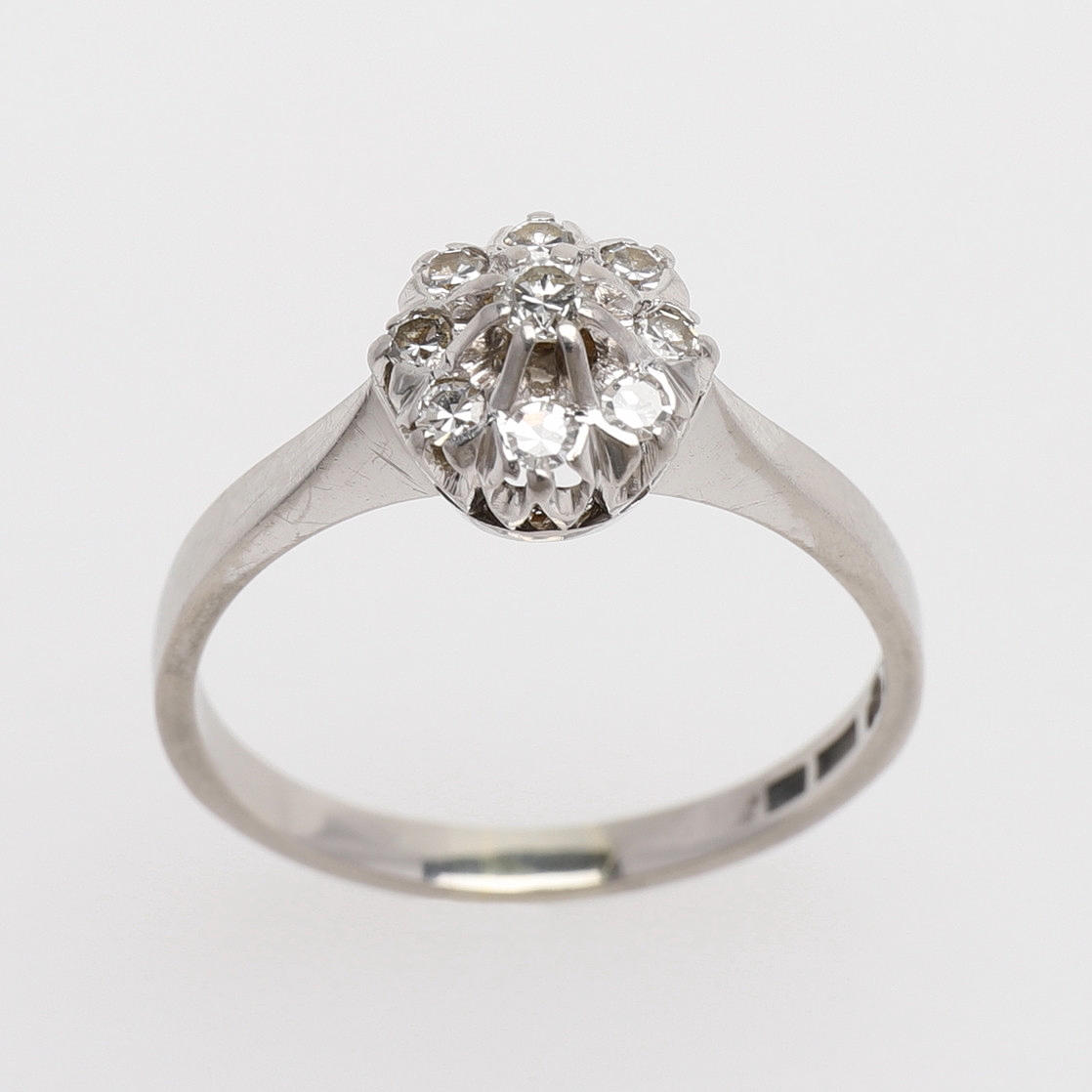 Skena av 18k vitt guld med nio diamanter om totalt 0,26 ct, stämplad Gustaf Dahlgren, Malmö 1965, diameter 18 3/4, vikt 3,6 gram.
