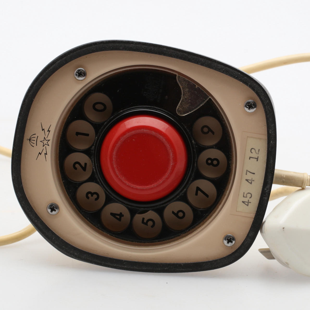 Gräddvit Ericofon formgiven av Hugo Blomberg, Ralph Lysell och Gösta Thames för LM Ericsson. Höjd 21 cm.