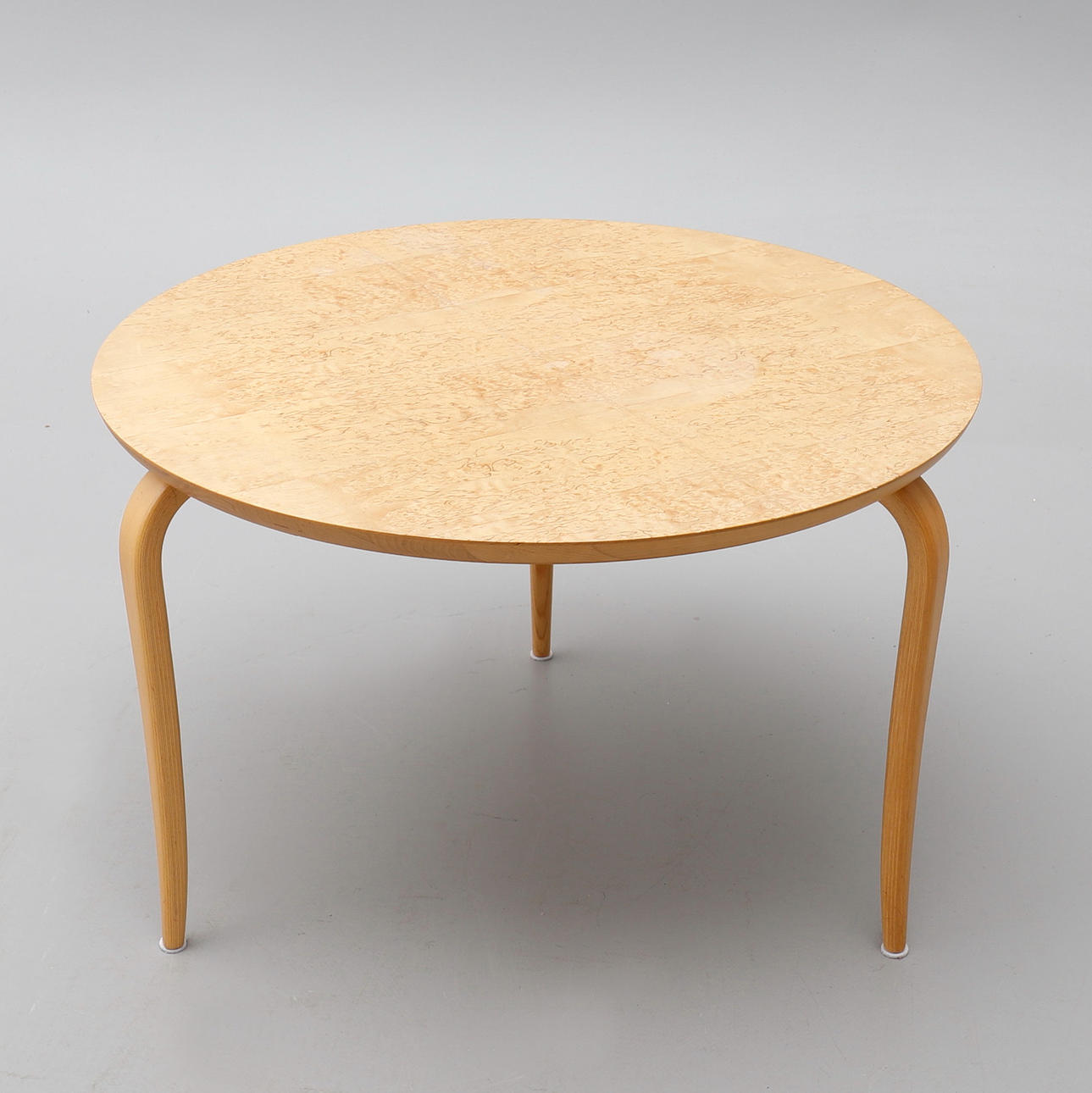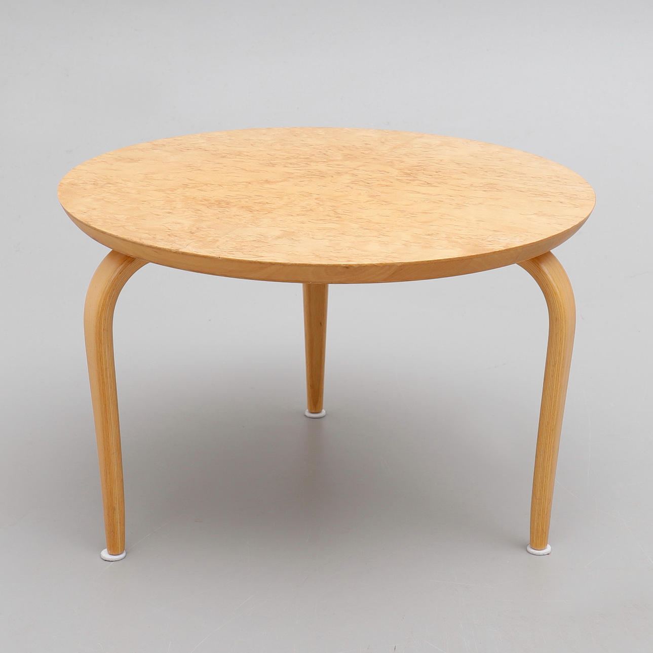 Runda skivor fanerade med masurbjörk. Tre svängda ben i bok. Diam 65, höjd 42 cm resp diam 45, höjd 29 cm.