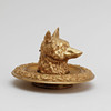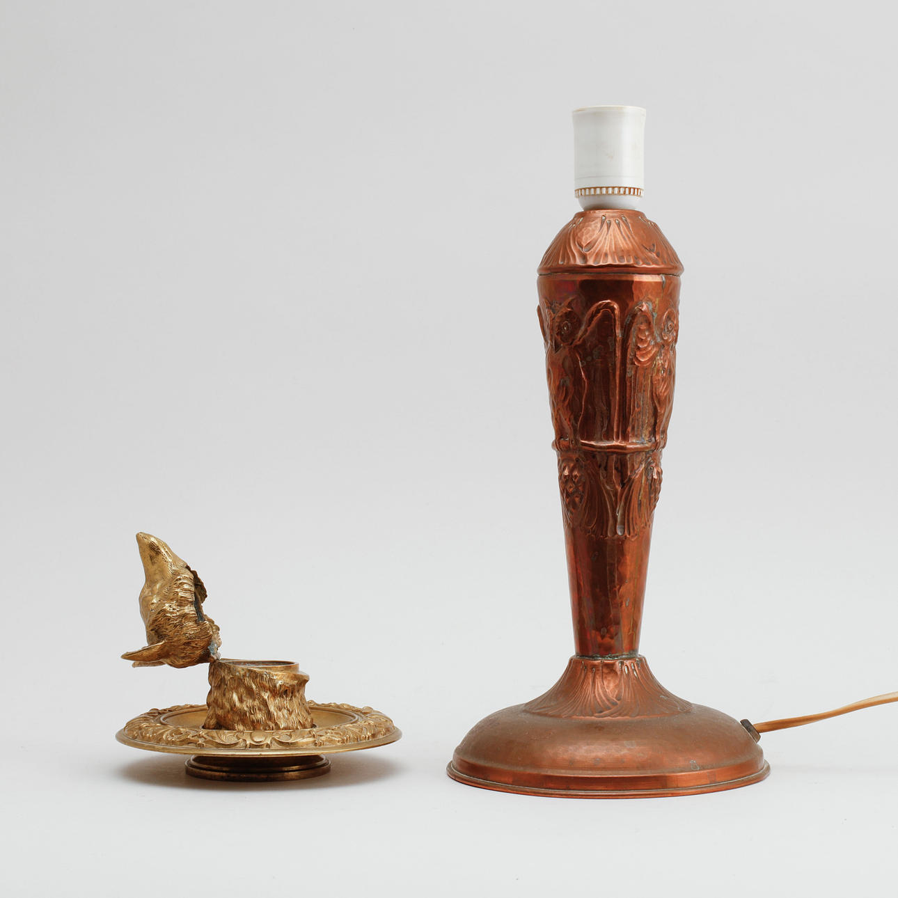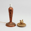 Lampfot med dekor av ugglor och kottar, höjd ca 30 cm exklusive lamphållare. Bläckställ med rävhuvud, höjd ca 10 cm.