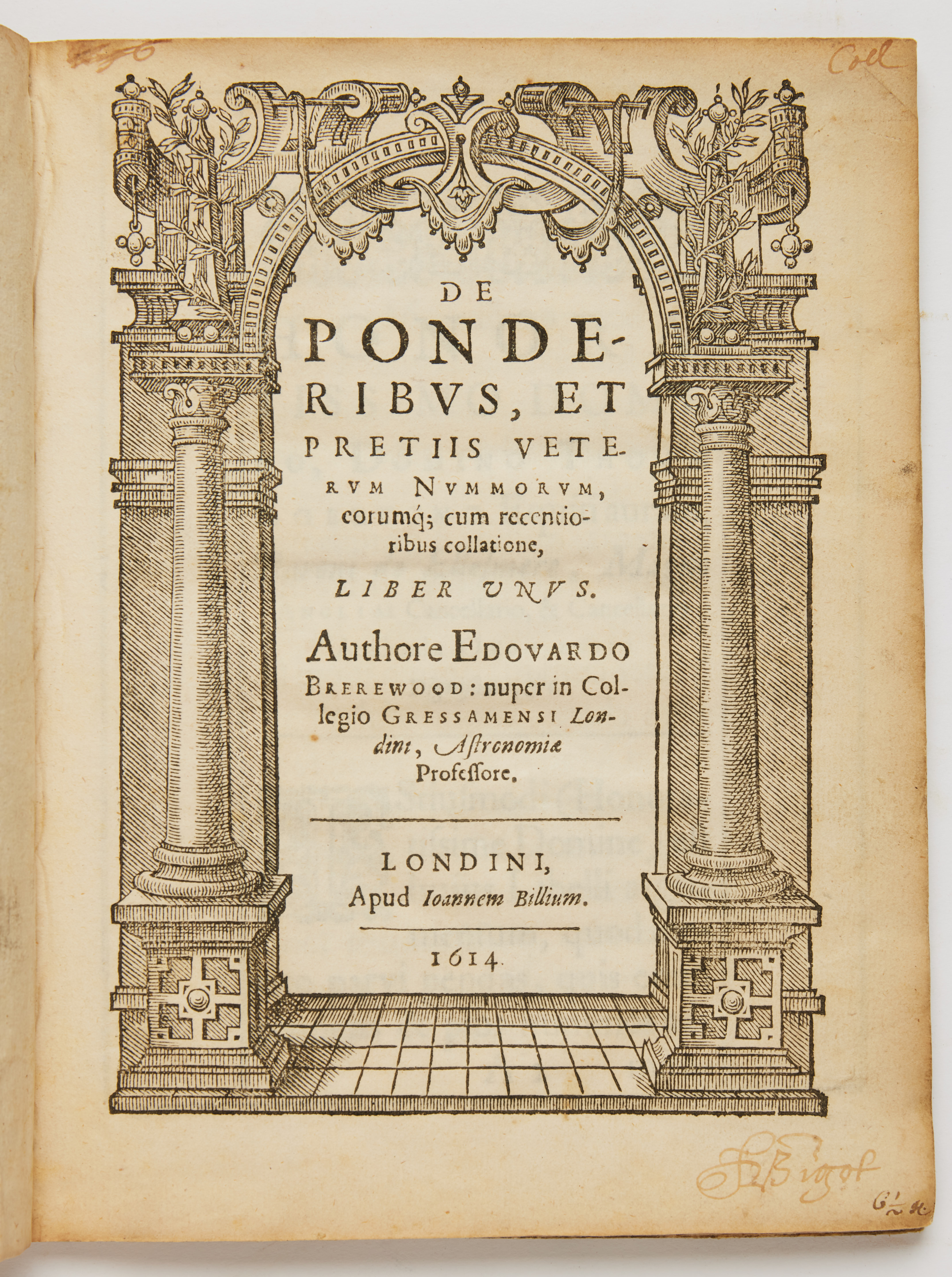 6014. 1945376. Numismatical work by Brerewood 1614.