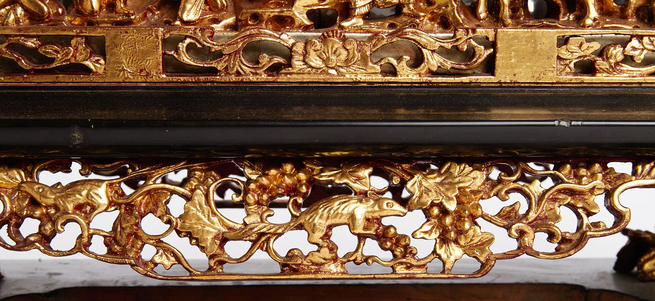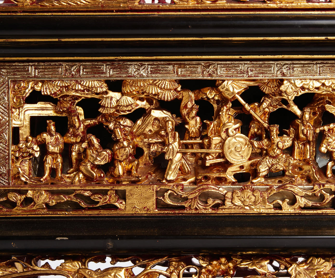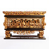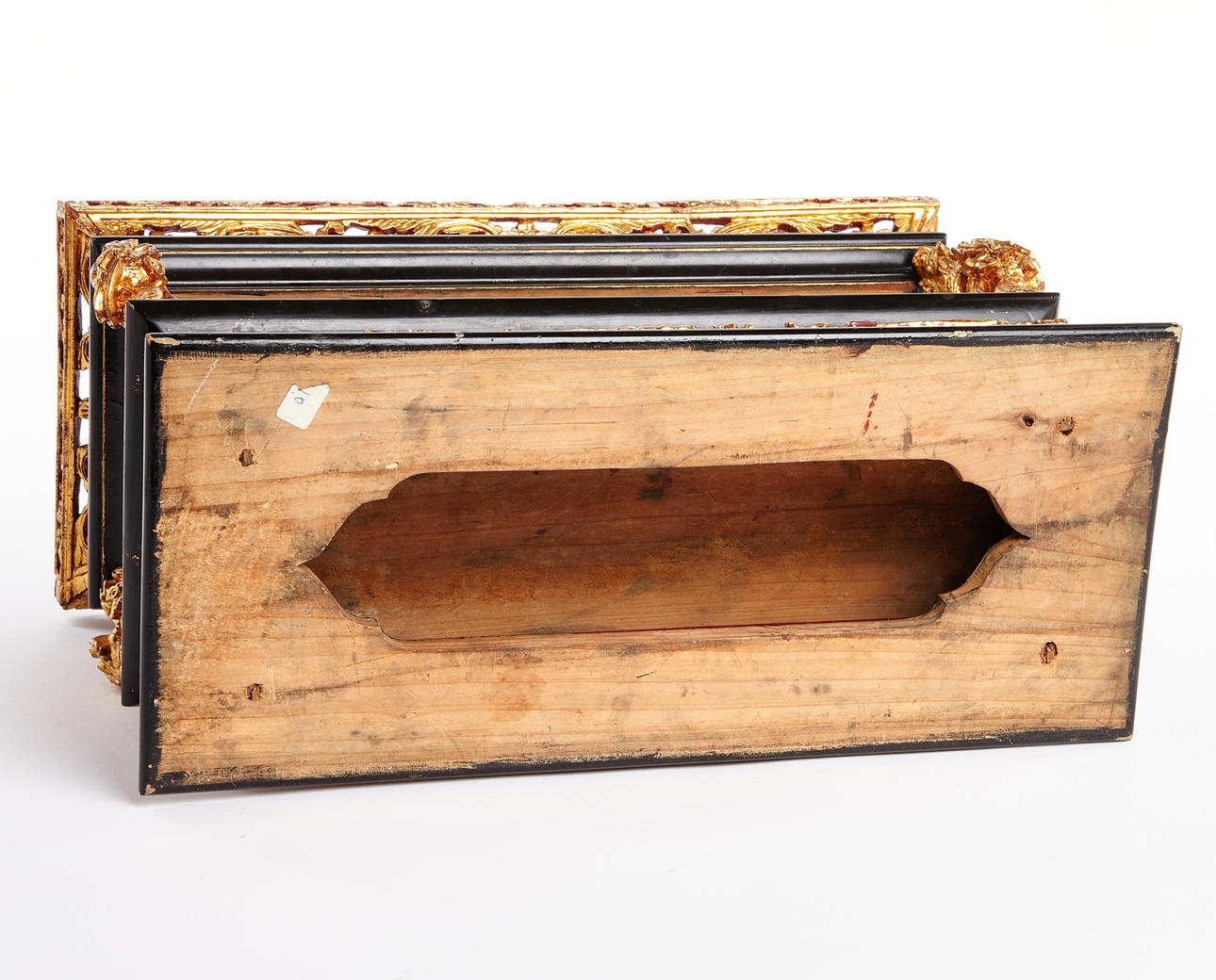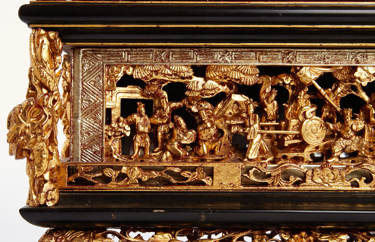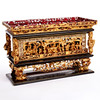 Skuren och förgylld reliefdekor med figurscener. Höjd 24,5, 38,5x18 cm.