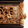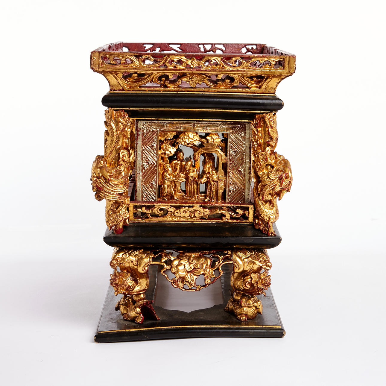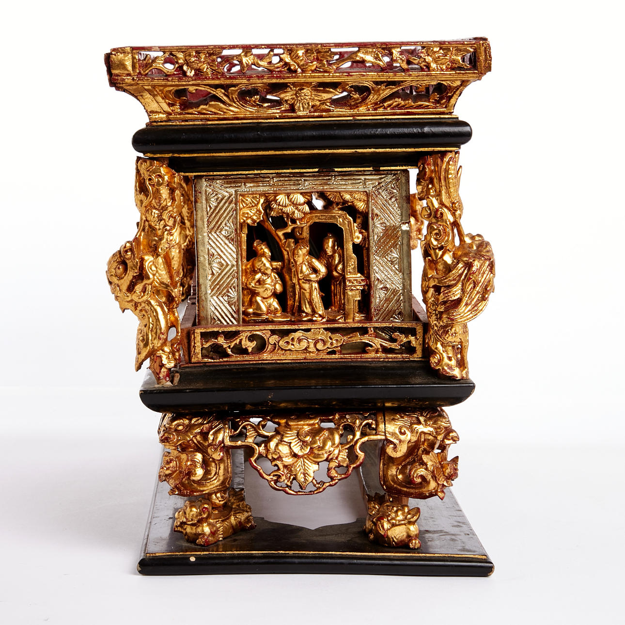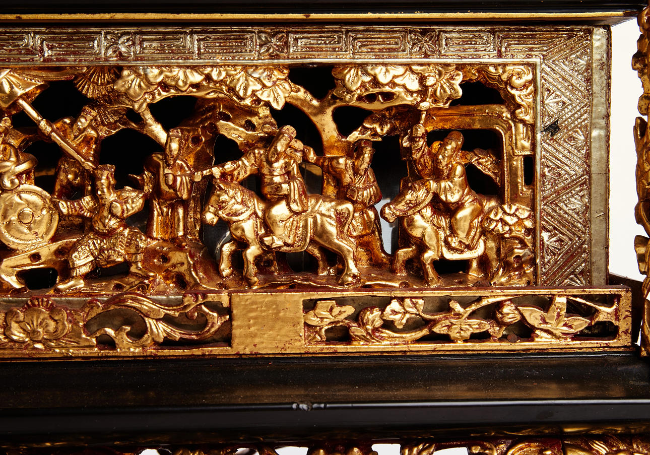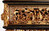 Skuren och förgylld reliefdekor med figurscener. Höjd 24,5, 38,5x18 cm.