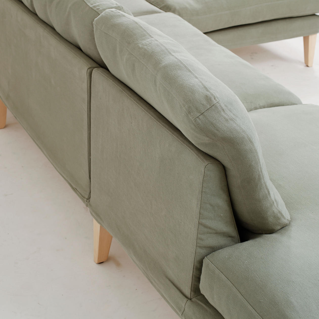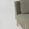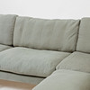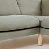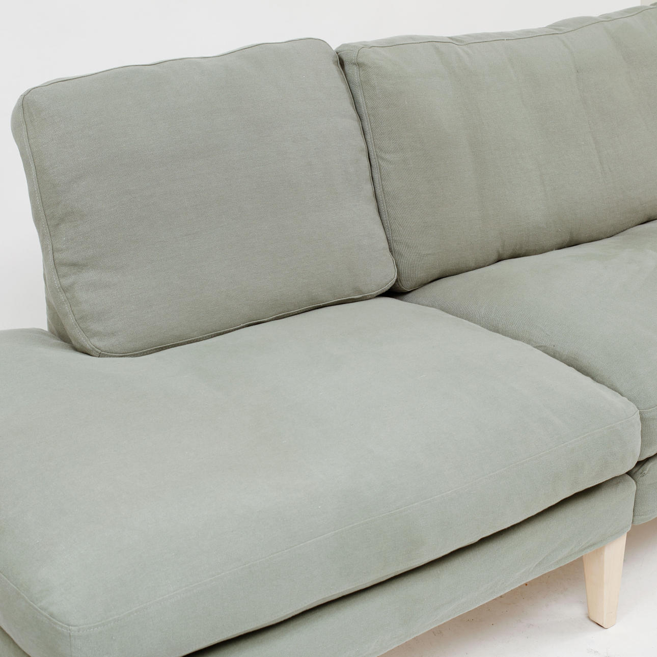Tredelad. Lösa plymåer i sits och rygg med grön linneklädsel. På ben av björk. Djup ca 85 cm. Längd 286 cm, djup vid schäslong ca 187 cm.