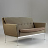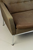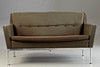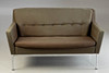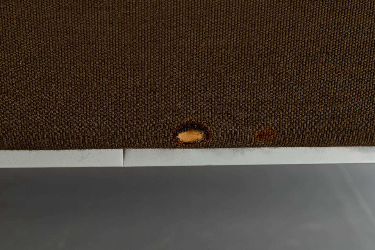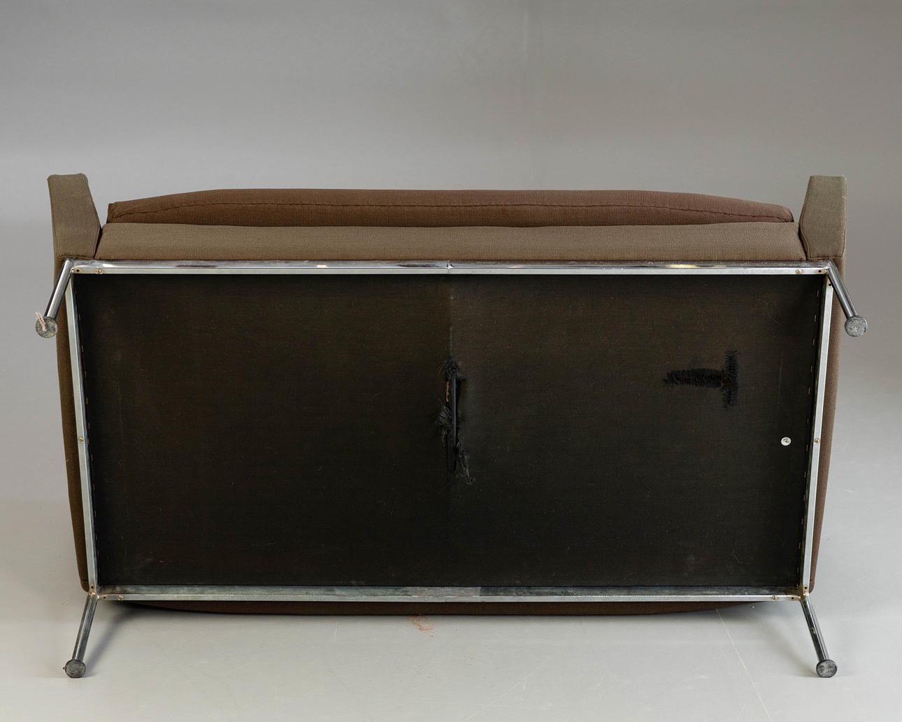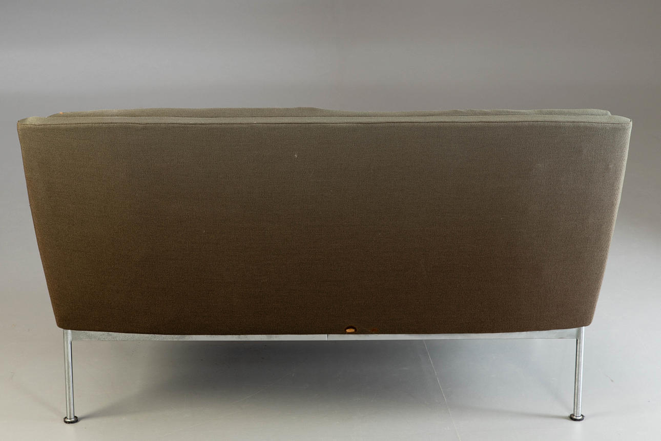 förkromad metallbas. Klädd och täckt med brungrönt tyg. Inskriven med ett märke. HxBxDxSH: 74x133x64x40cm.