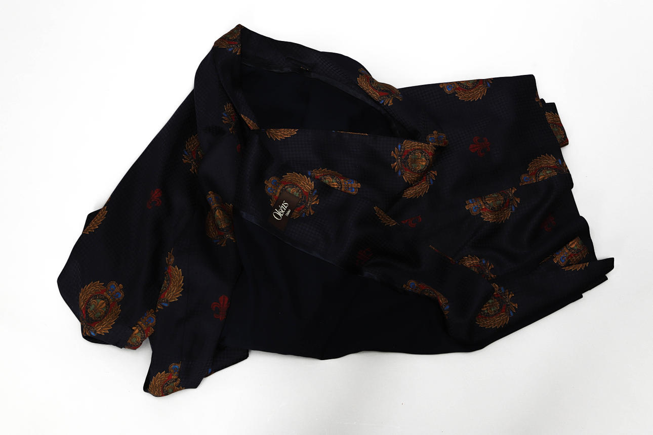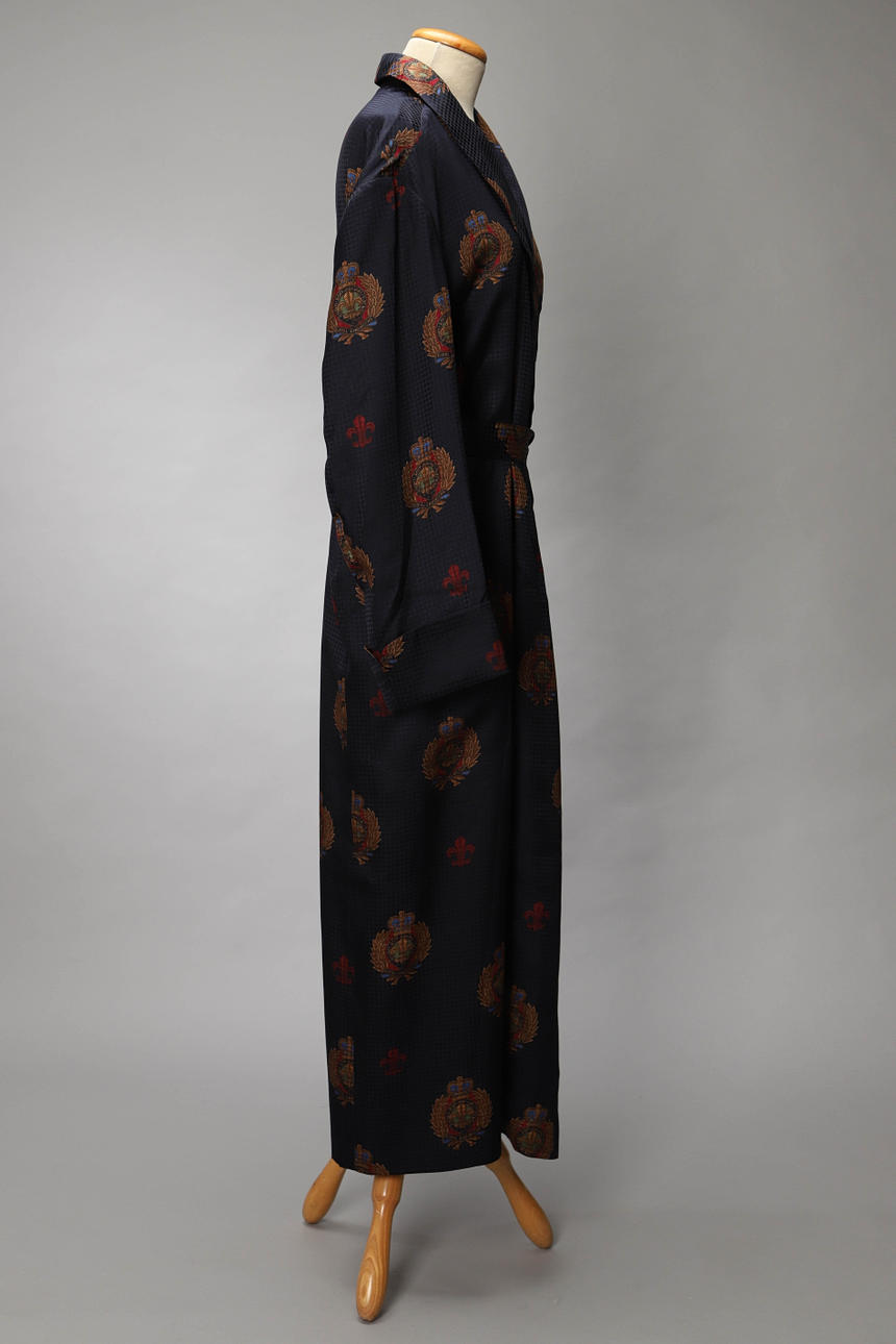 Fodrad, bröstficka, två utanpåfickor, ärmar med uppvik, skärp, rygglängd 133 cm.