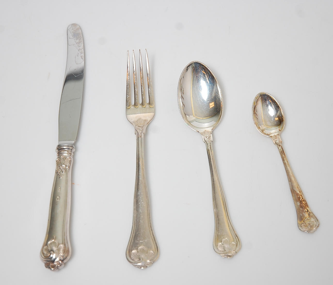 8 Gafflar, längd 18 cm 8 st Knivar, 22 cm 8 st Dessertskedar, 15,5 cm 12 st Teskedar.