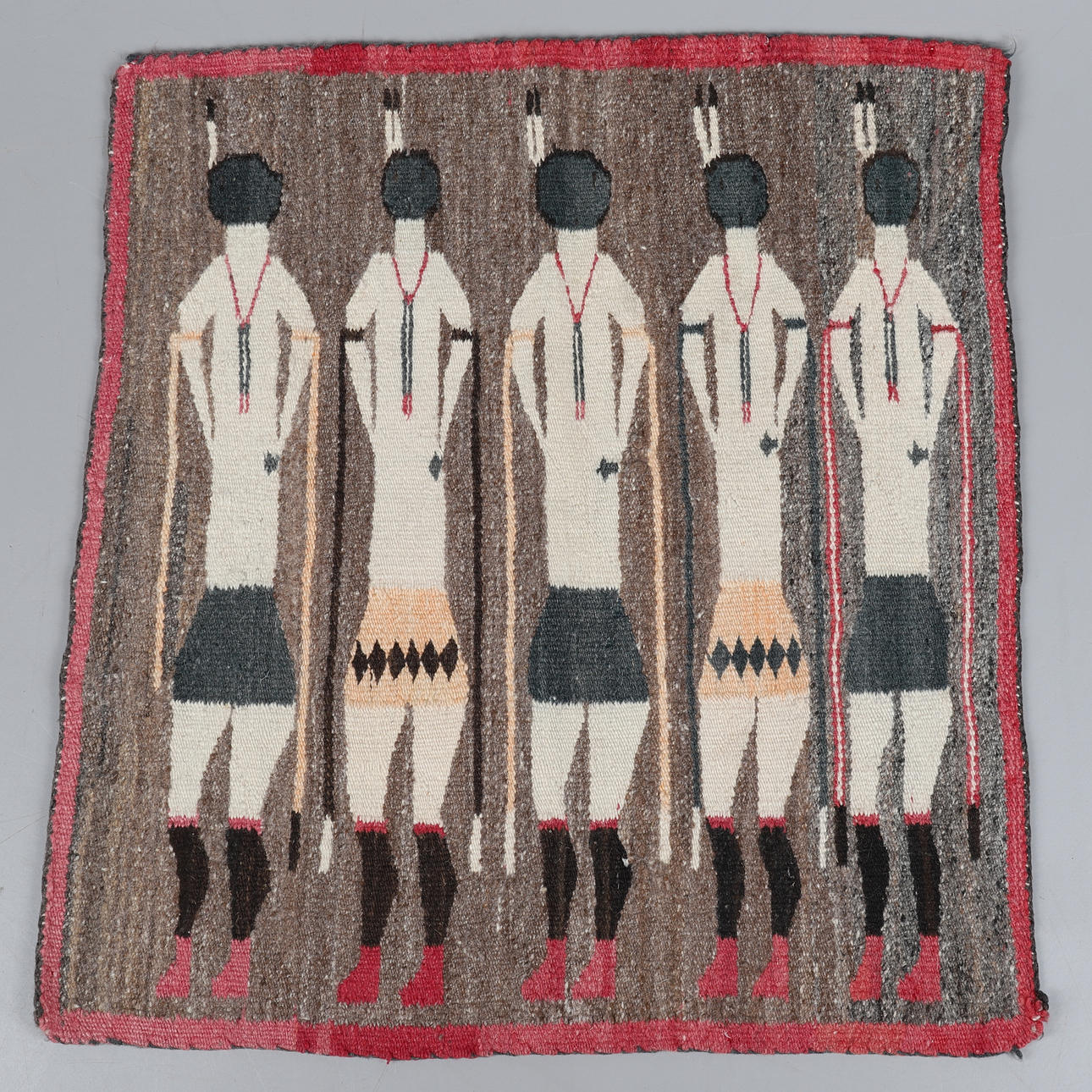 omkring 1930, med fem stående figurer mot en havregrynsfärgad bakgrund med röd bård,