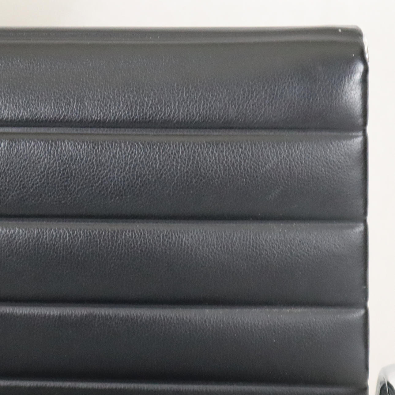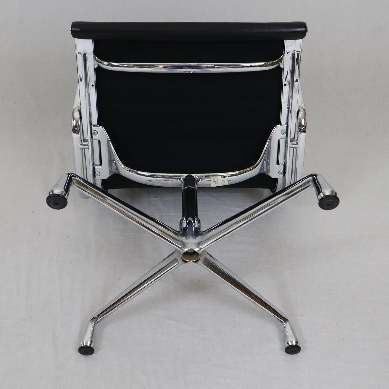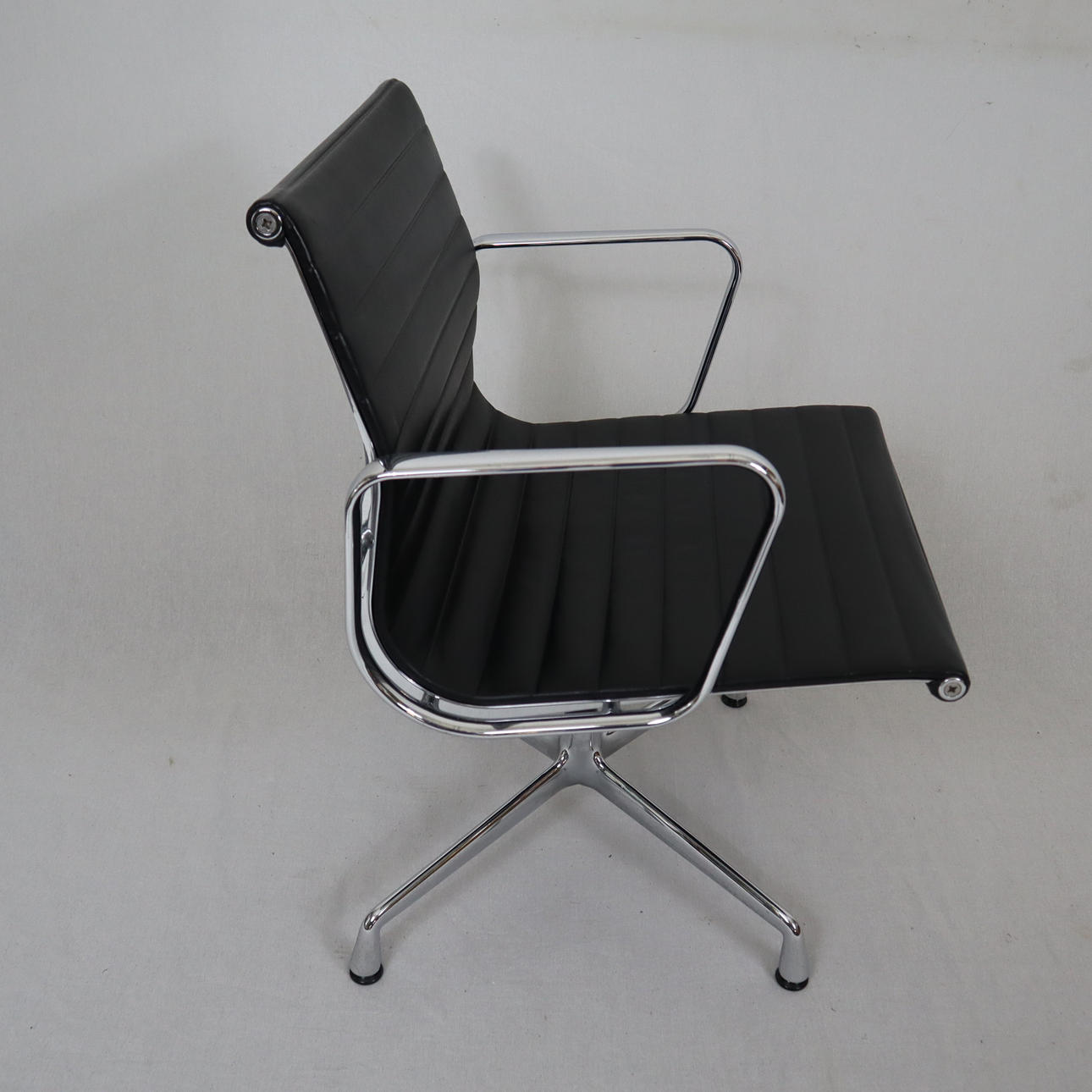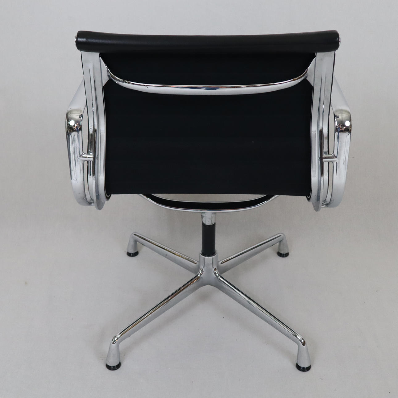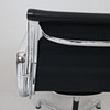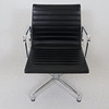Design: Charles Eames (1958), modell EA-107 ur serien 'Aluminium Group', massivt polerad aluminiumram och armstöd, svart läderfodral, rygg i svart hopsak, vridfunktion, höjd ca 83 cm, sitthöjd ca 48 cm.