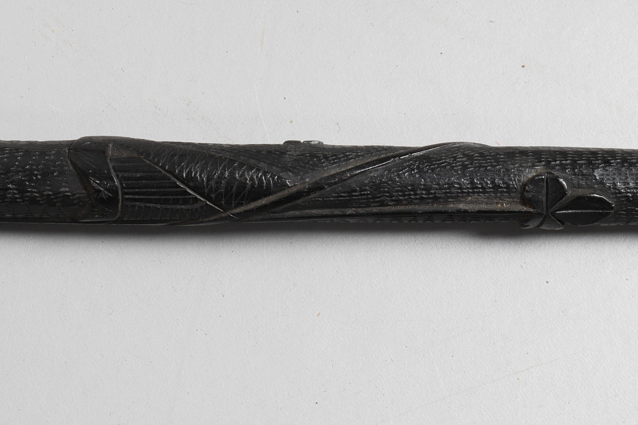 en i polerat lövträ med rullningssnidade pommel handtag, 82cm,
