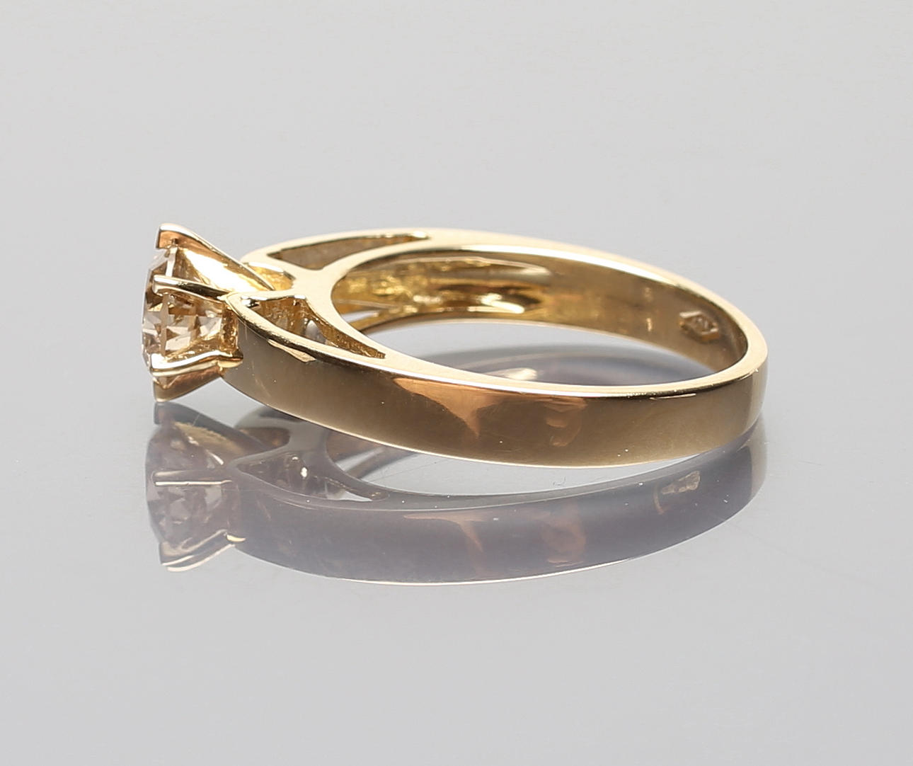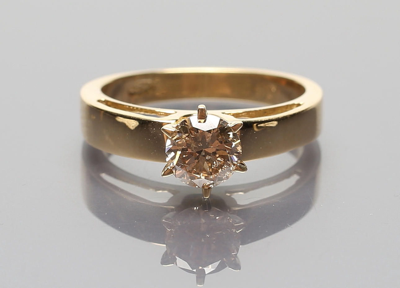 750/000 GG, brutto 44,7 g. Med briljantslipad diamant, 0.92 ct., pi. RW 54.
