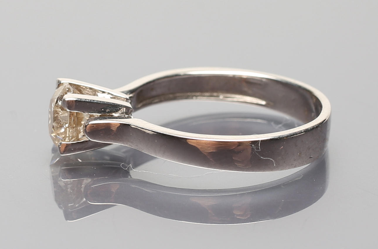 750/000 WG, brutto 3,6 g. Set med briljant, 1.13 ct., cape/pi. Lättad ring axlar. RW 55.