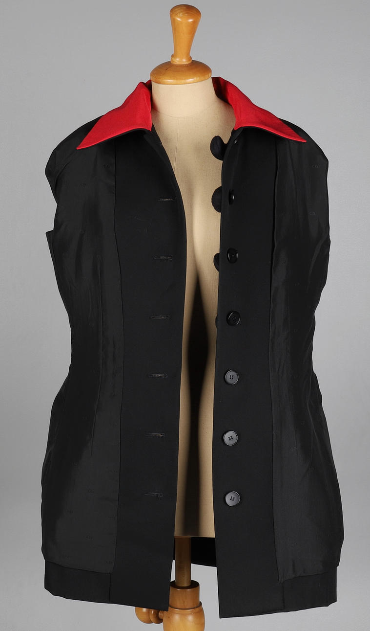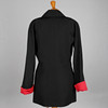 svart ull, åtsittande design med raglanärmar med axelvaddar, spetsig röd fodrad krage och manschetter, stora cirkulära fodrade knappar och två fickor, märkta Christian Dior Boutique Paris, svart acetat foder, baklängd 76cm, byst ca 90cm, arm 45cm.