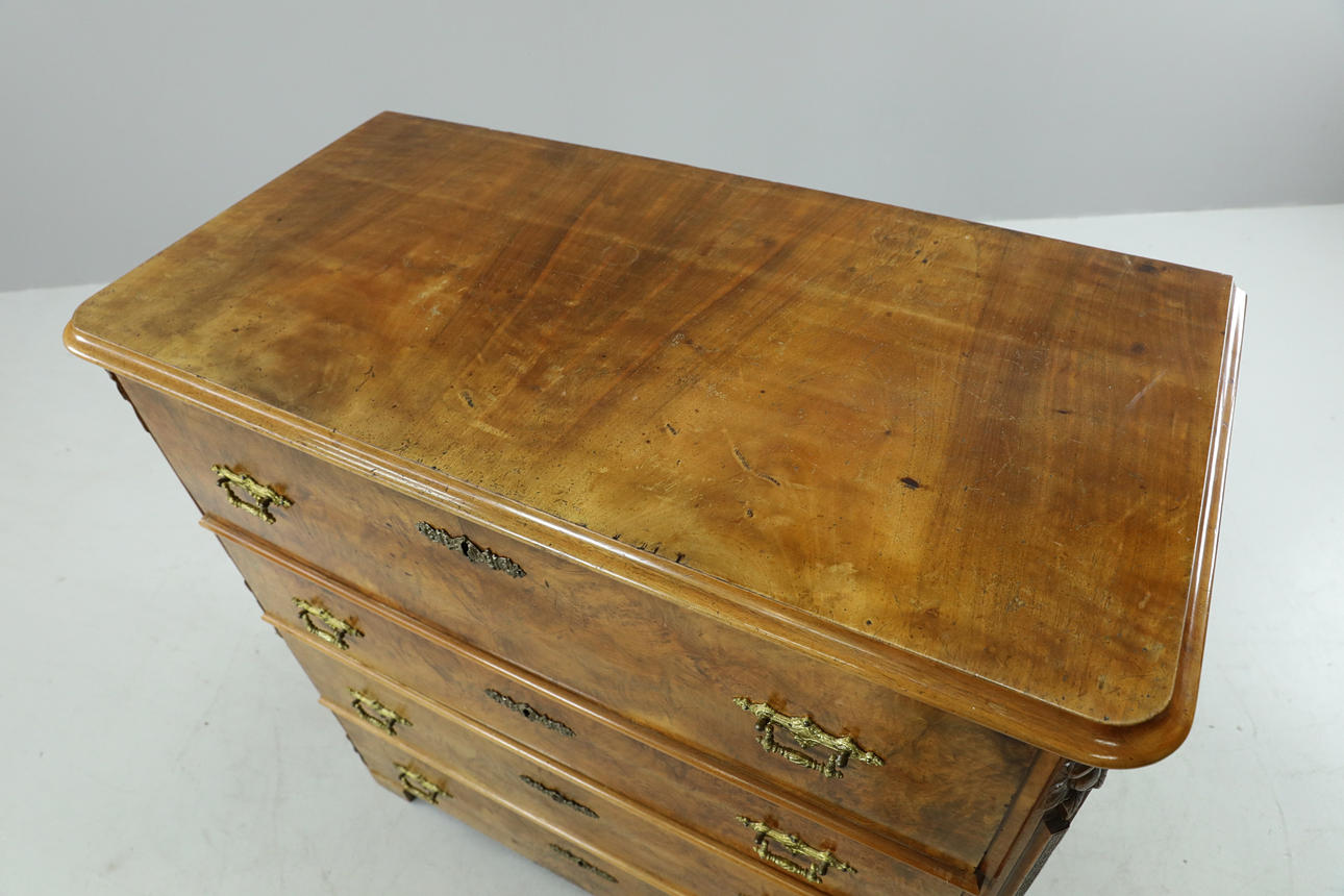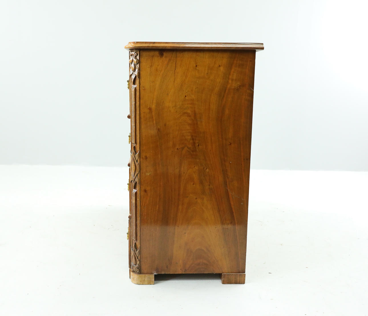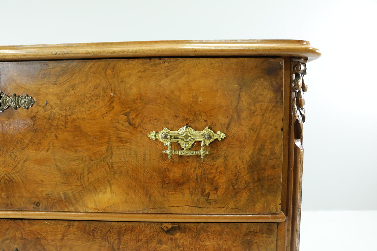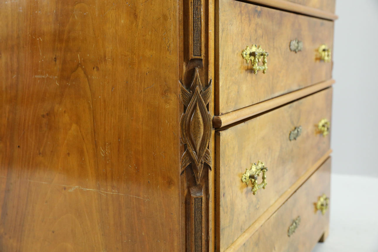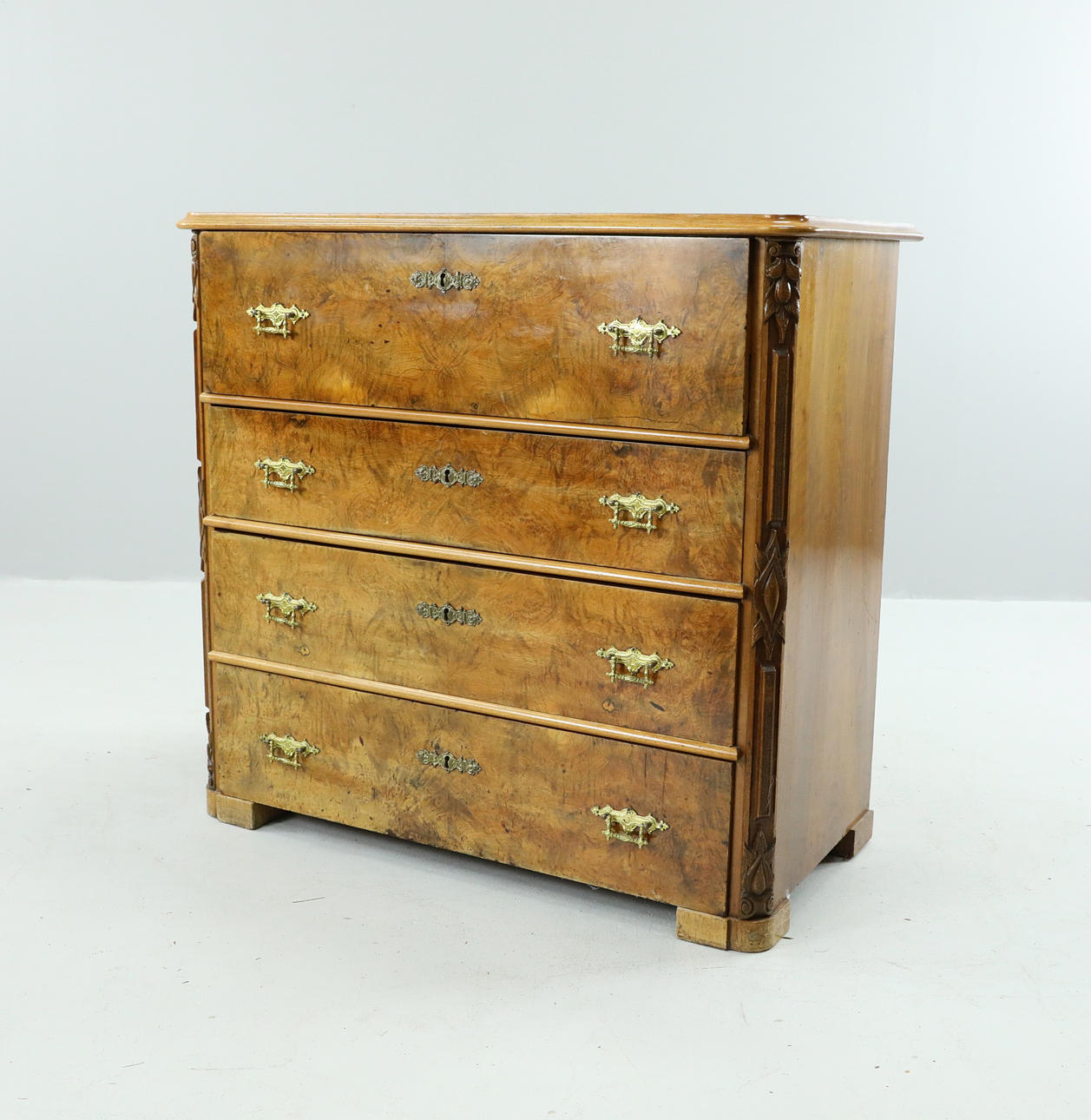 Skuren dekor. Beslag i mässing. 4 st draglådor, övre draglåda med klaff och bakomliggande fackinredning. Höjd 97 cm Bredd 102 cm Djup ca 51 cm.