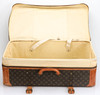 Resväska i monogramcanvas med ljusbruna skinndetaljer. Beslag i mässing. Foder i tyg. Invändigt två fickor med resår samt avdelare/ panel. Längd 79, Bredd 52. Djup 25 cm.