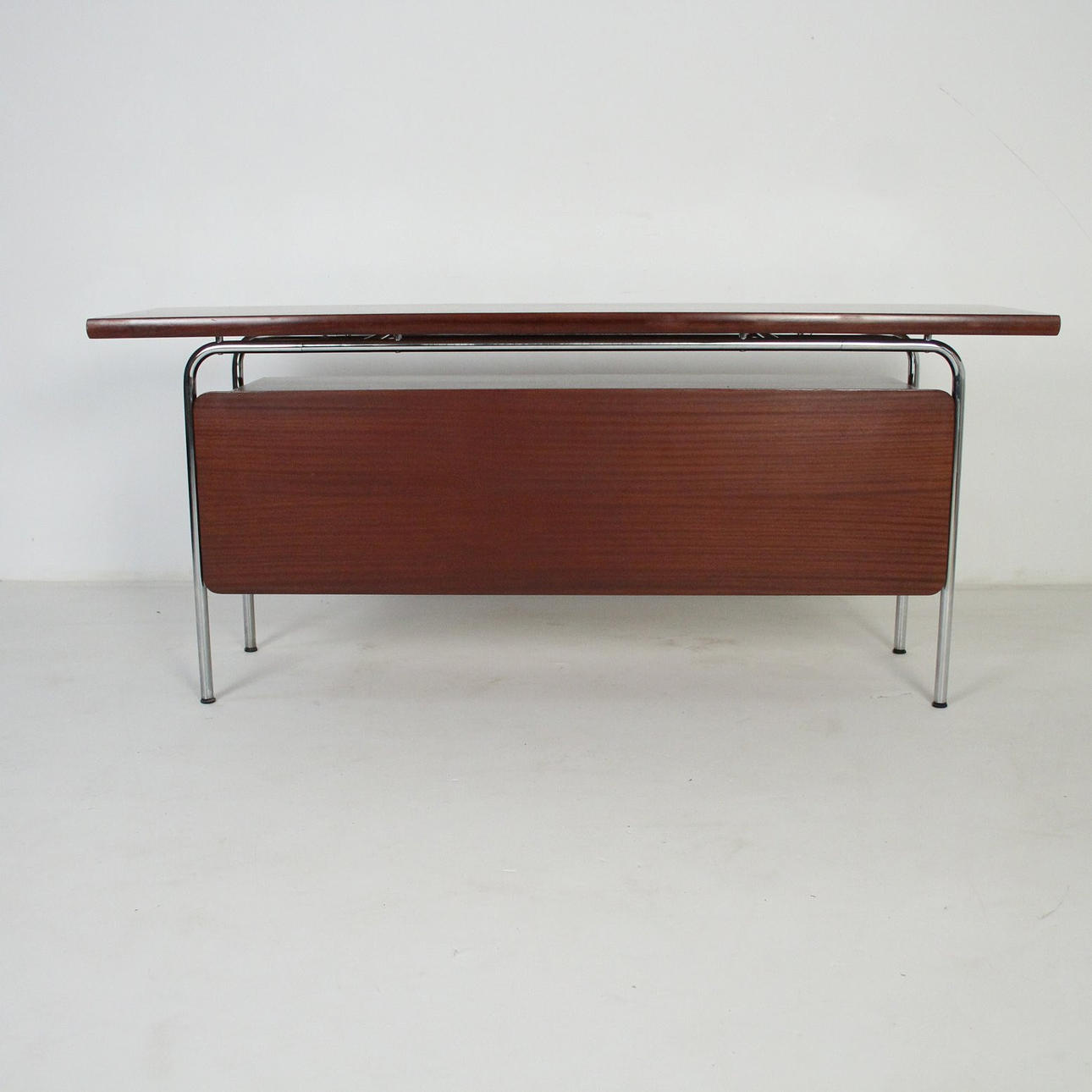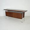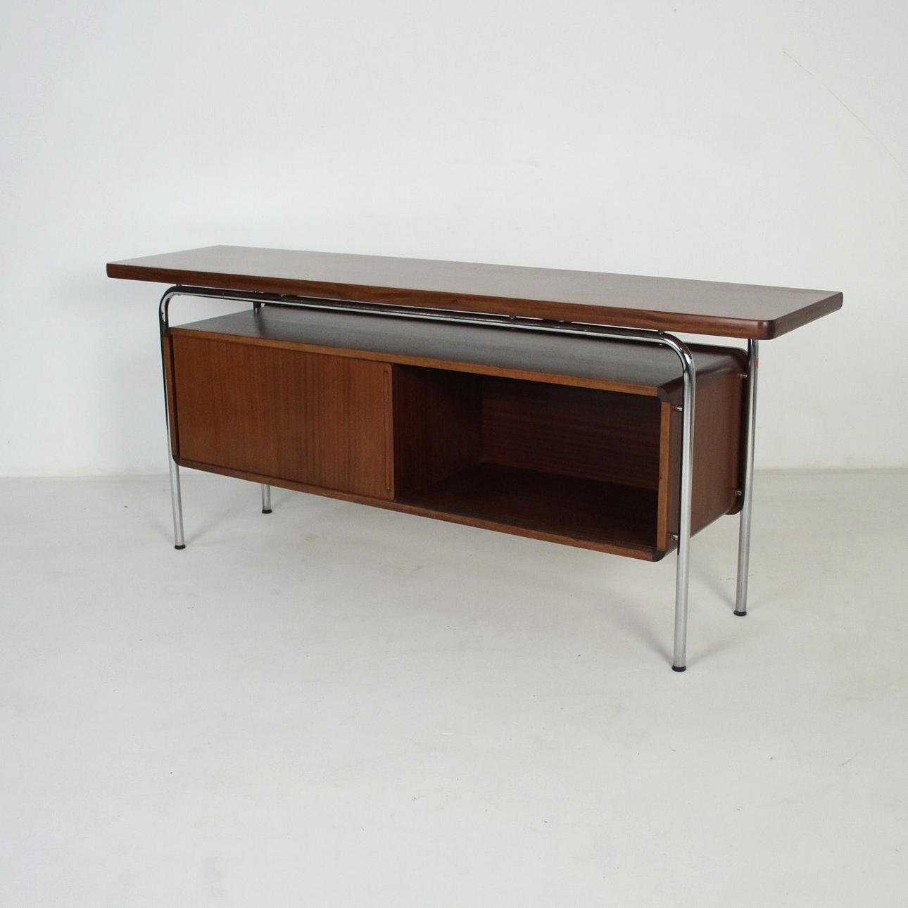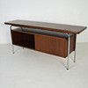 Skänk från 1960/70-talet, teak, konstruktion med bas, kroppen har två lådor, kromad metallram. Mått: ca. H. 77 cm, B 180 cm, djup 45 cm.