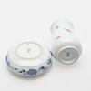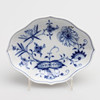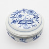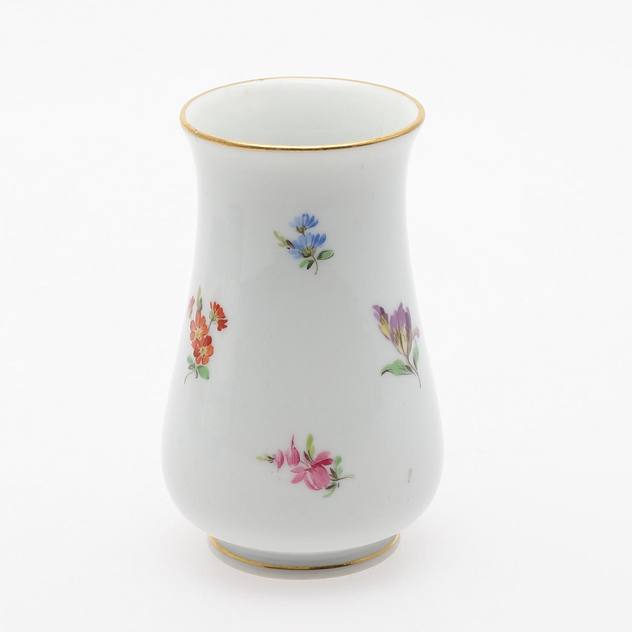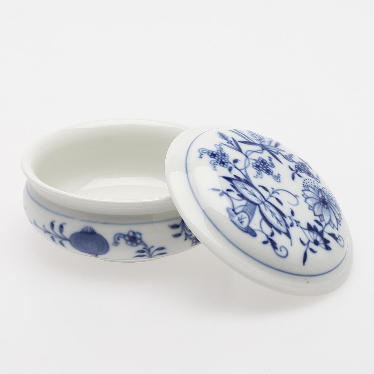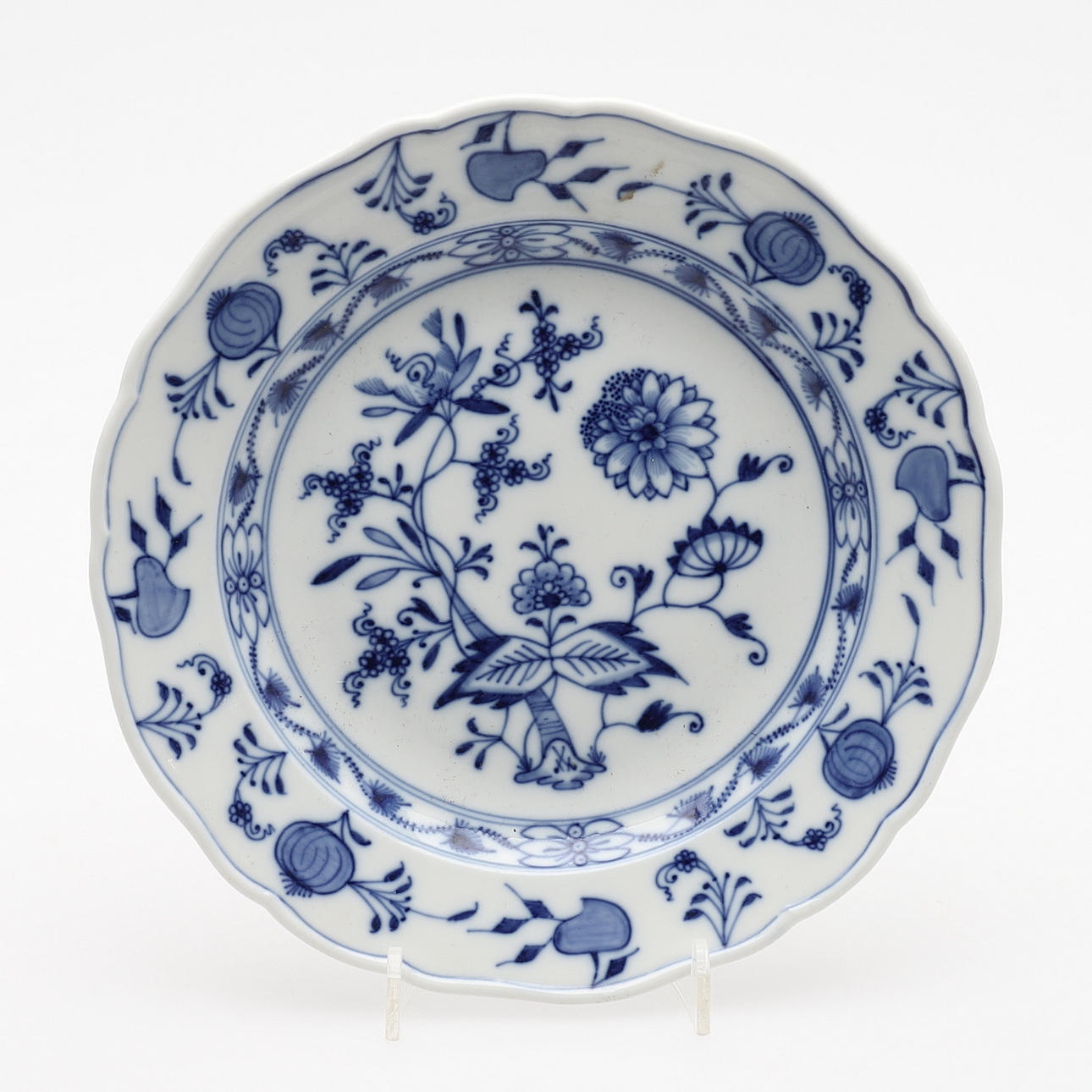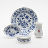 1 Vas med dekor av målade blommor i färger, höjd 10 cm samt 1 dosa, 1 skål och 1 tallrik med lökmönster, diameter 9, längd 12 och diameter 19,5 cm.