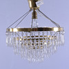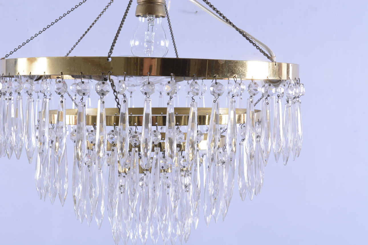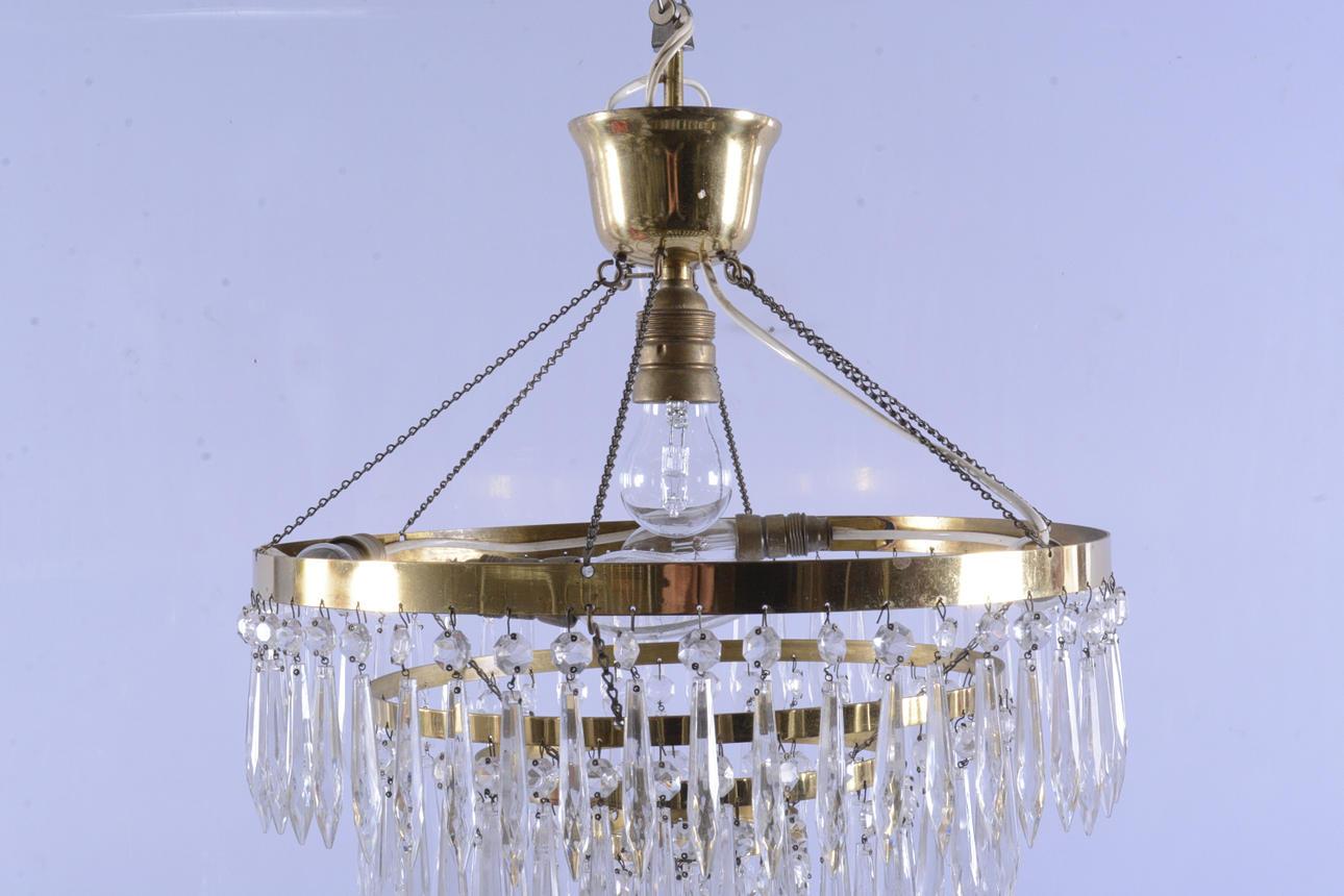 Omarbetad. Tidigare kristallkrona. Diameter 40 cm. Höjd ca 50 cm. Prismornas längd ca 10 cm. 140 stycken prismor.