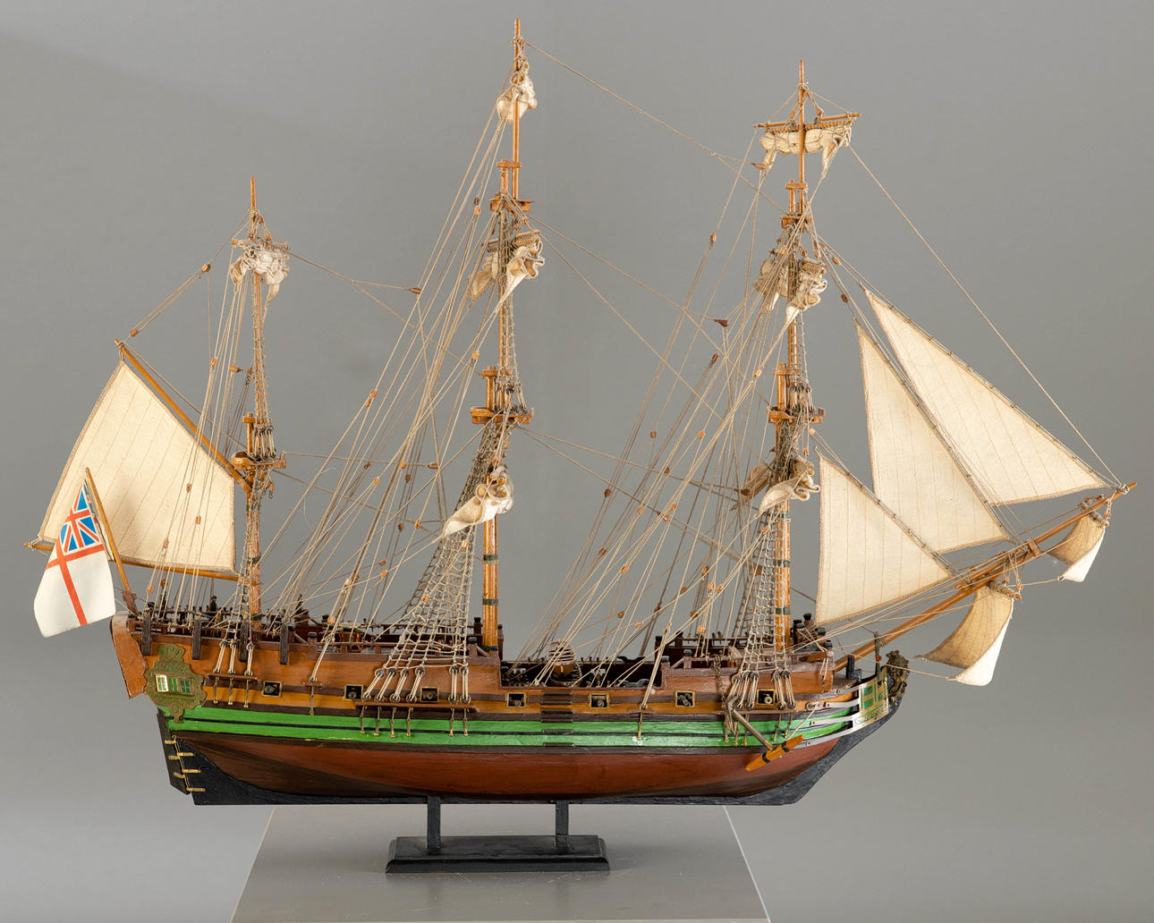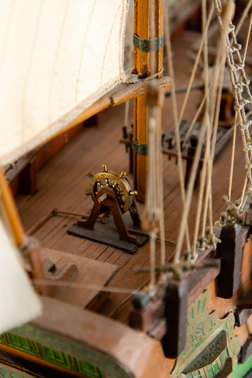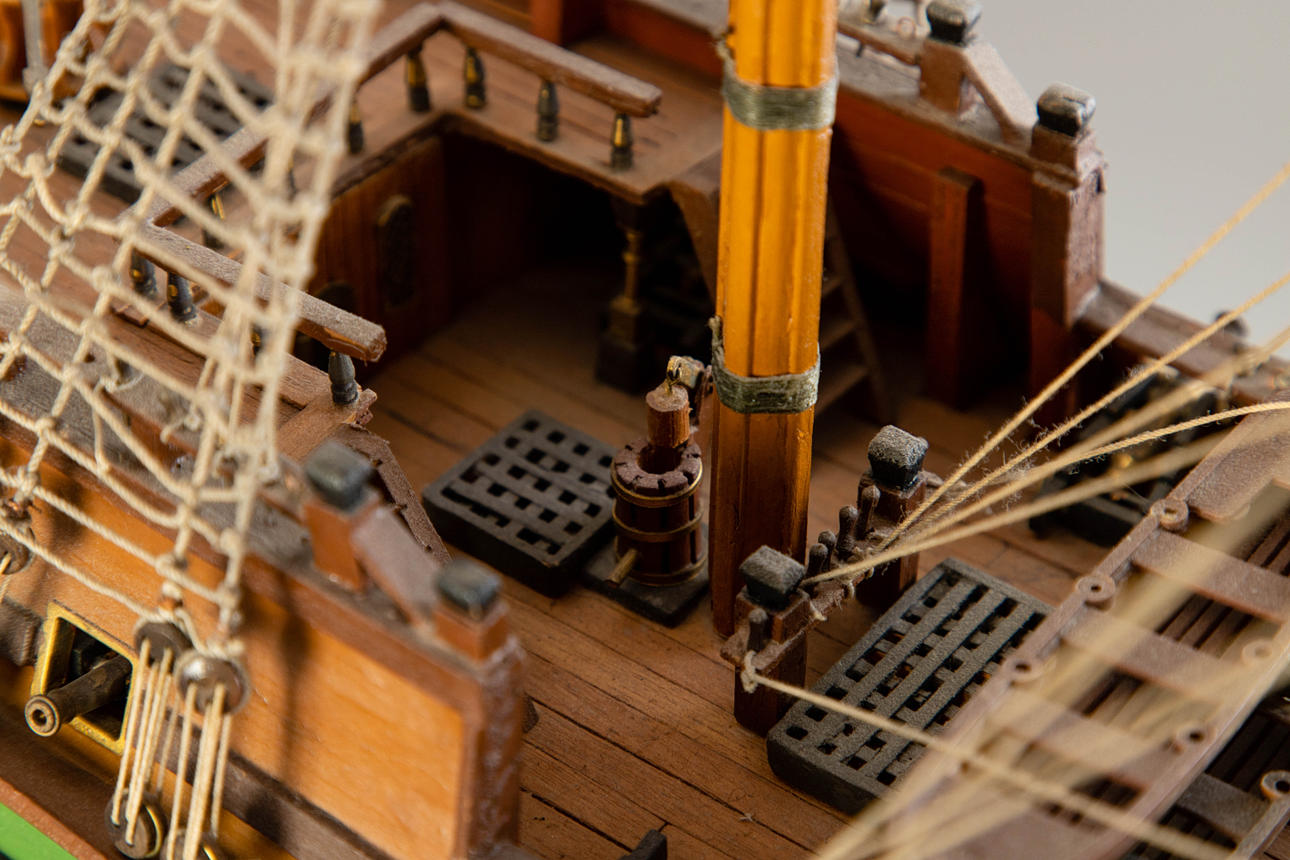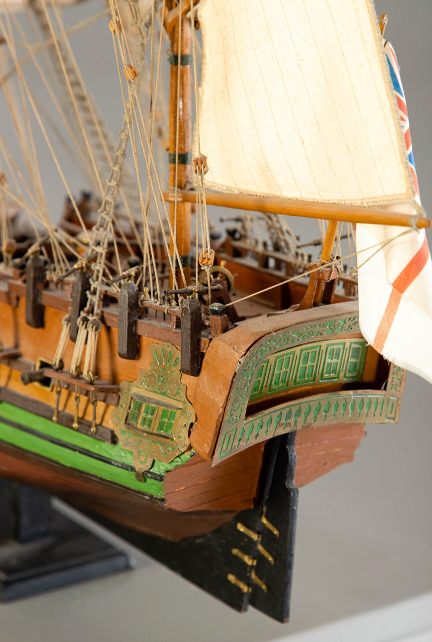 trä, delvis färgad. Målad/textil/metall/band. Uppdrag av Royal Navy som ett sjätte klassfartyg (fregatt, utrustad med 20 vapen) byggt runt 1700 på Sheemess Dockyard. Används som en kunglig yacht bytt namn till HMS Carolina/Royal Caroline från 1716 och 1733. År 1749 fungerade fartyget som HMS Peregine fram till 1761 för Royal Navy. HxB: 66,5 x 92 cm.