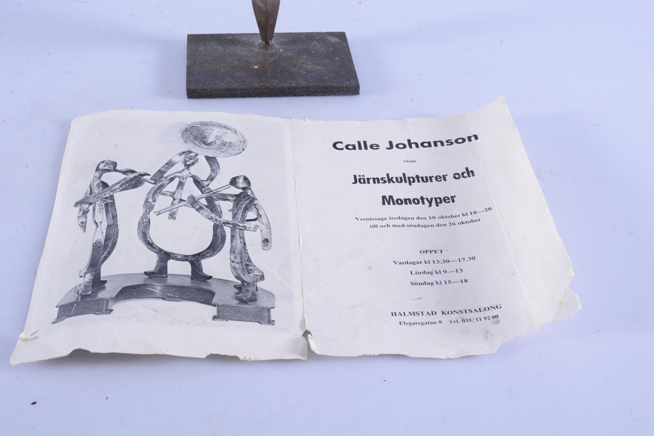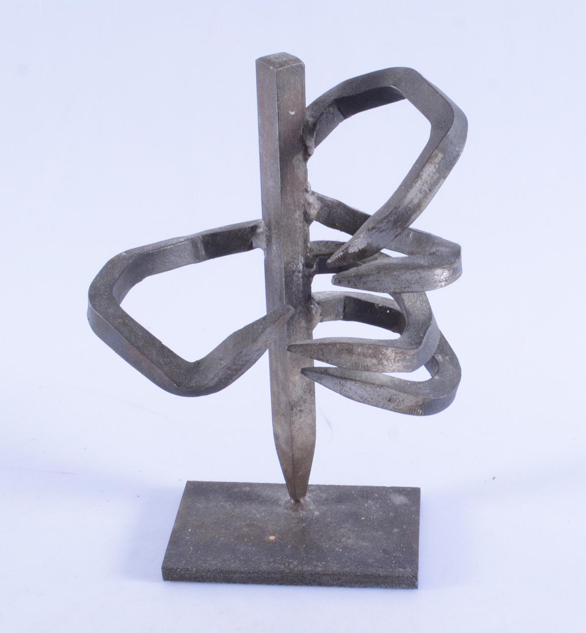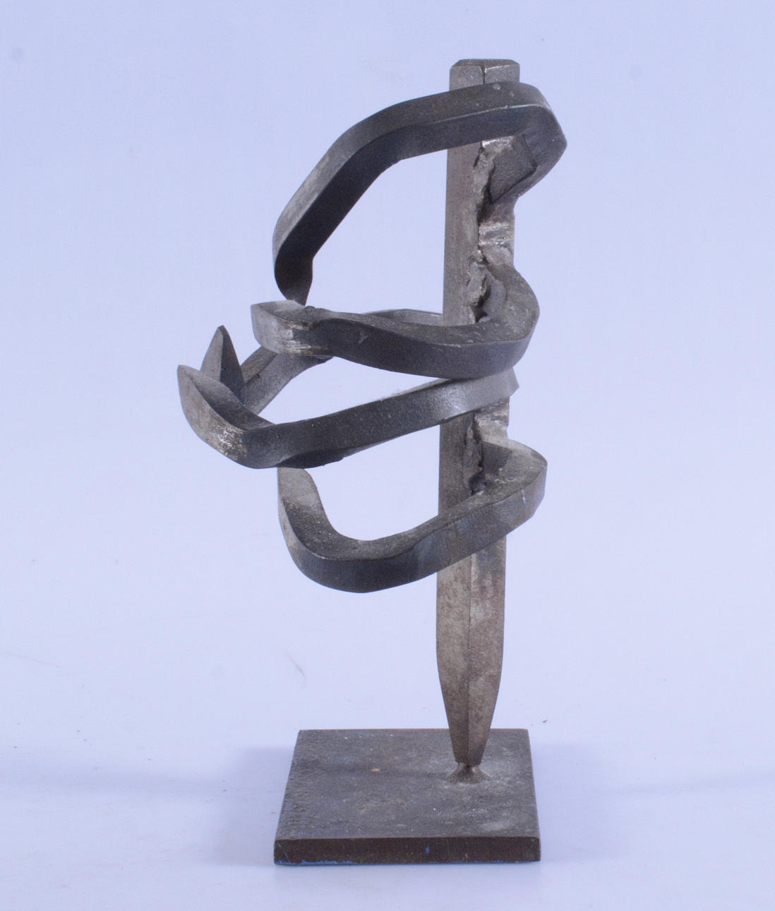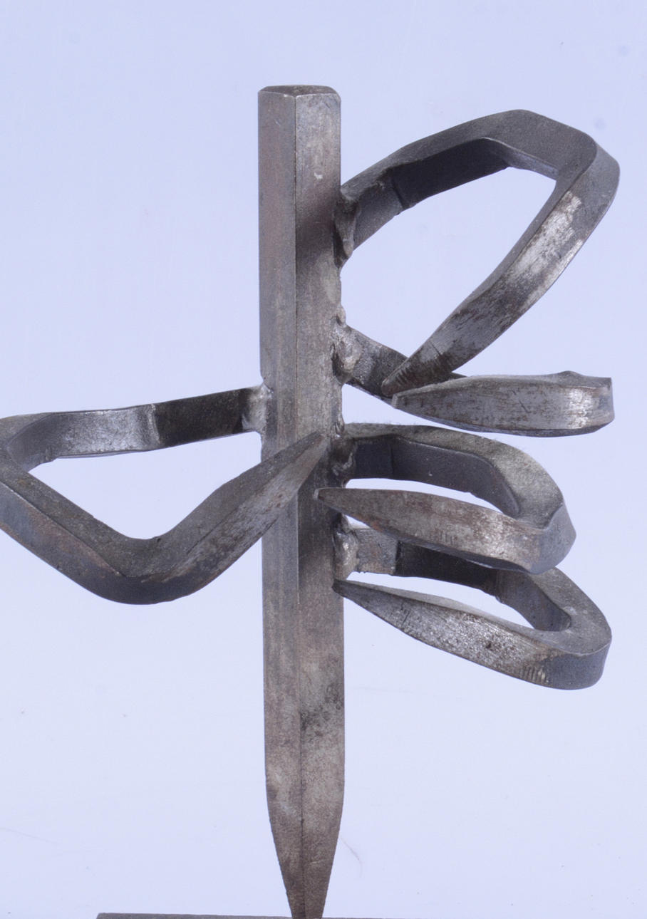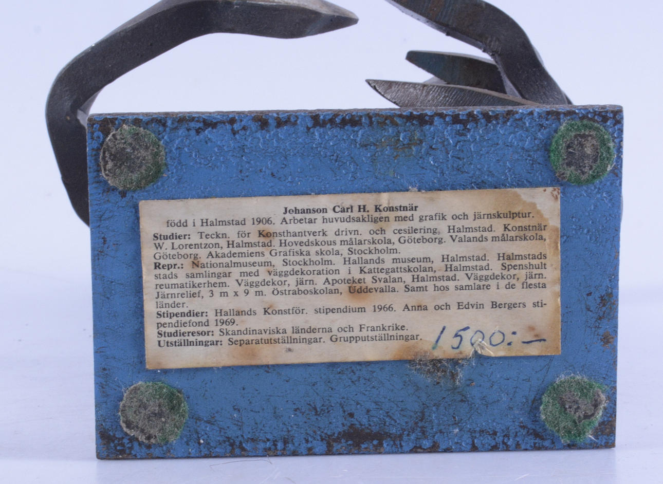 Höjd 24 cm. Tillverkad av rälsspik från gamla Bolmenbanan Halmstad. Osignerad.