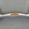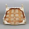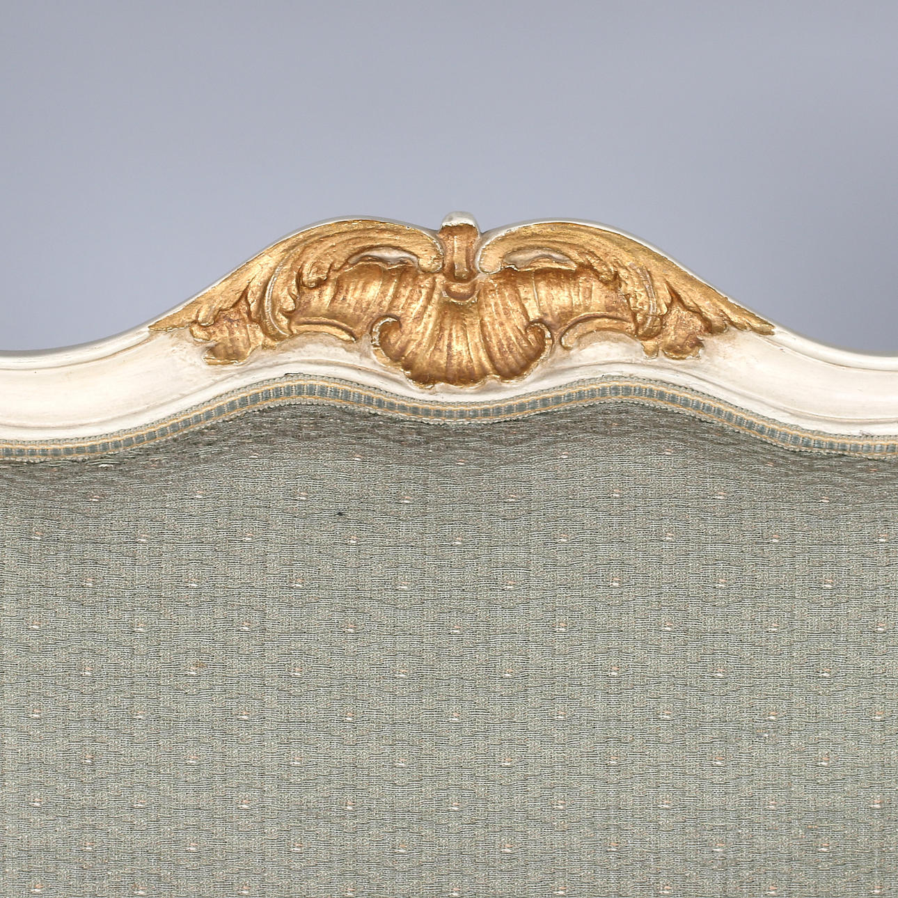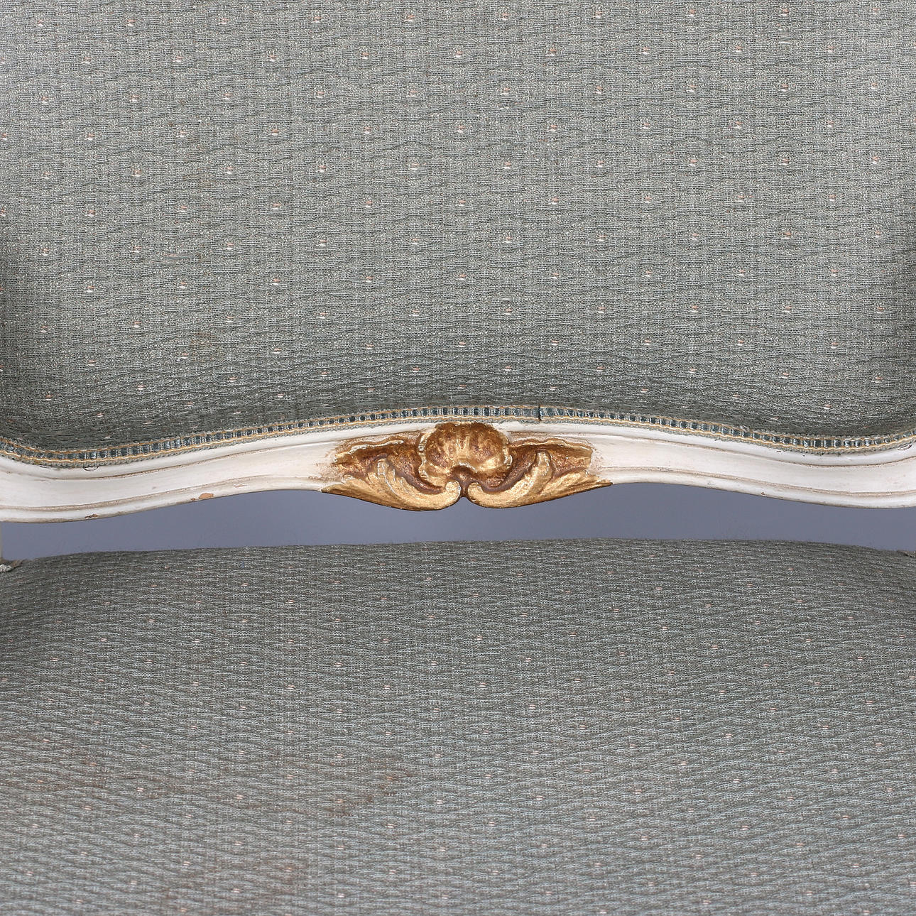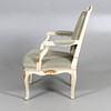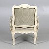 Bemålat lövträ. Skuren dekor i form av snäckor och akantusblad. Fast stoppning i sitts, rygg och armlän. Längd ca. 68, bredd 58, sitthöjd 41, rygghöjd 93 cm.
