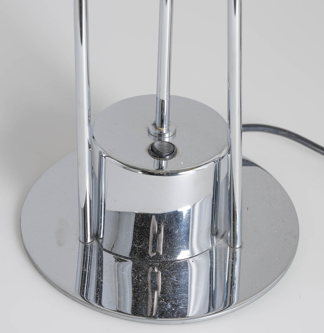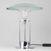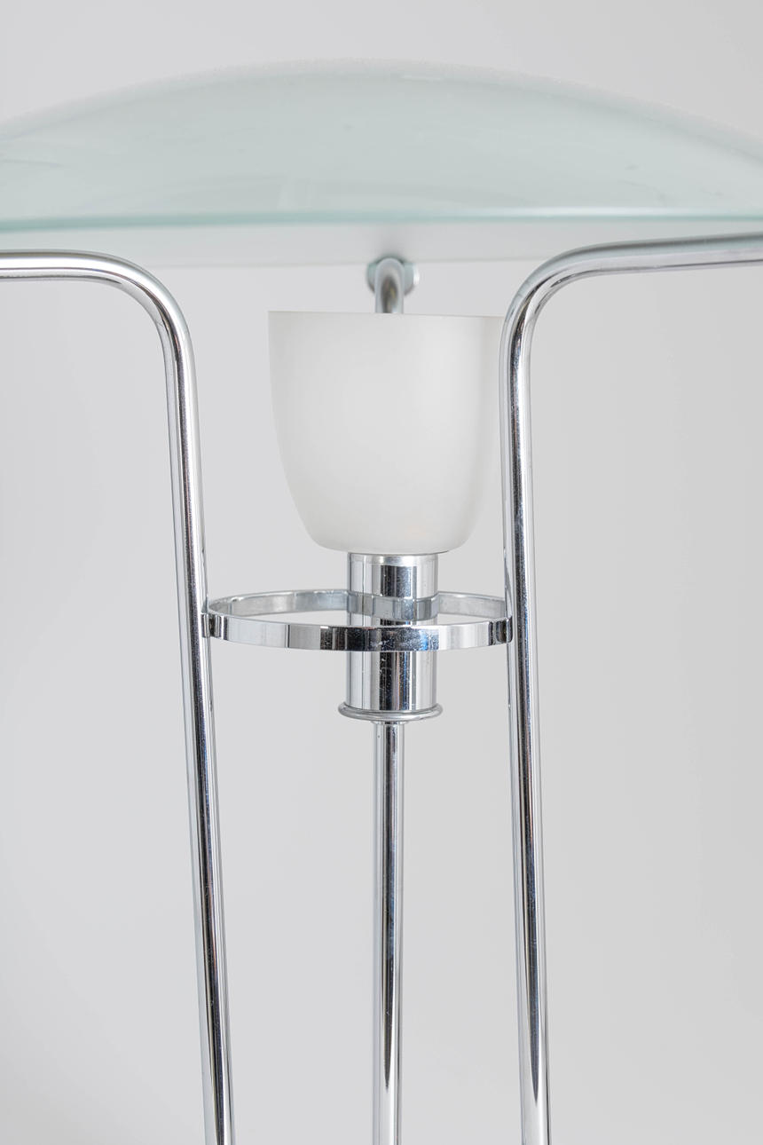 Förkromad metall I mitten med en halogenlampa och en liten glasskärm och en löst liggande glasskärm. Höjd 45 cm, diameter 37 cm.