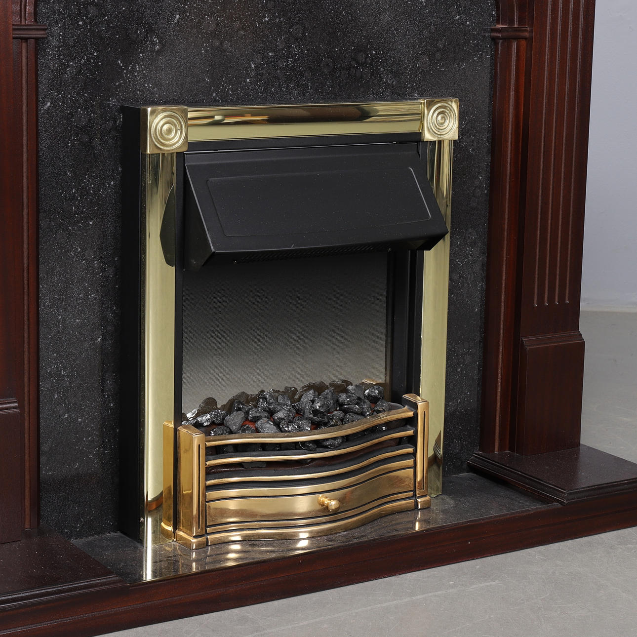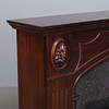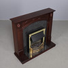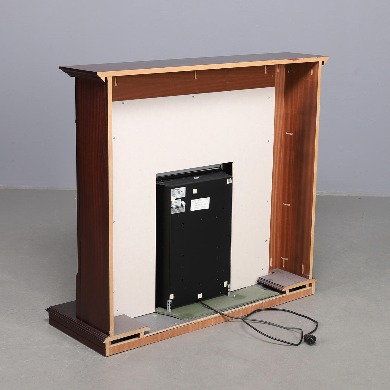 Spiselkrans i mahognyfärg och stenimitation med elektrisk insats, blåser varmluft och "glöder". Höjd 108 cm, bredd 120 cm, djup 25,5 cm.