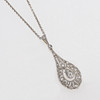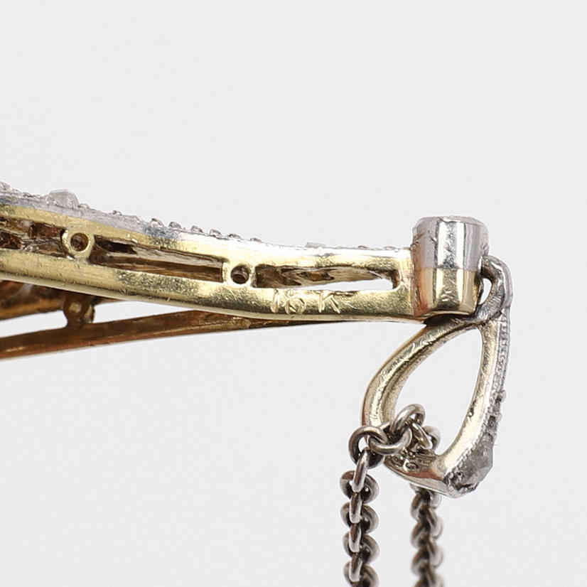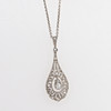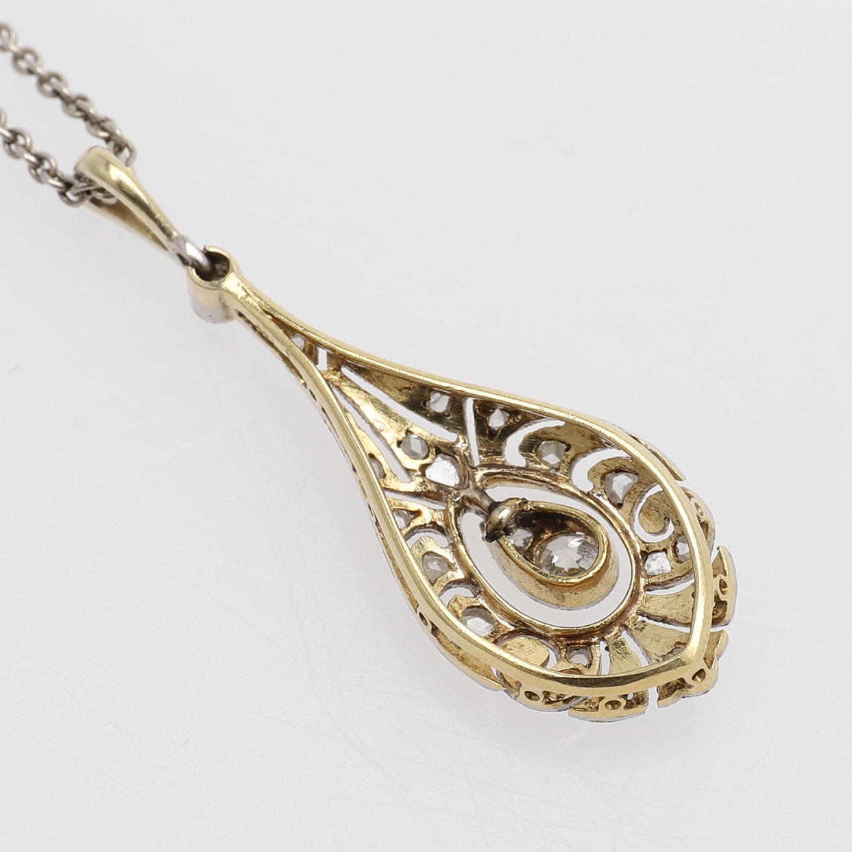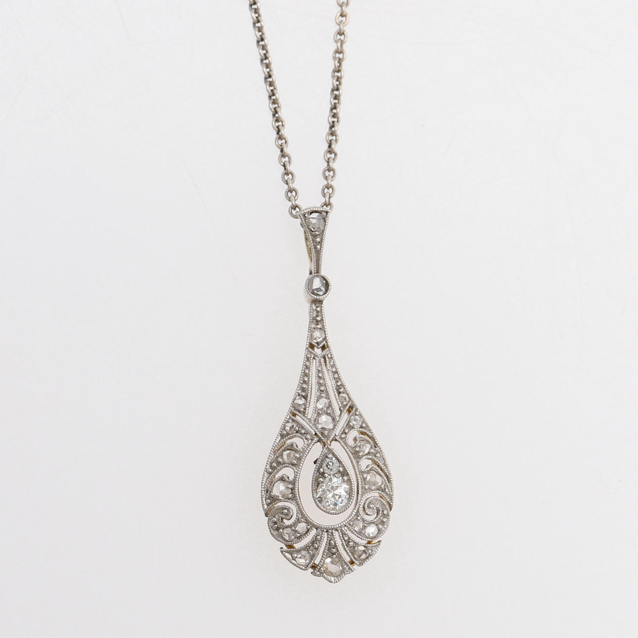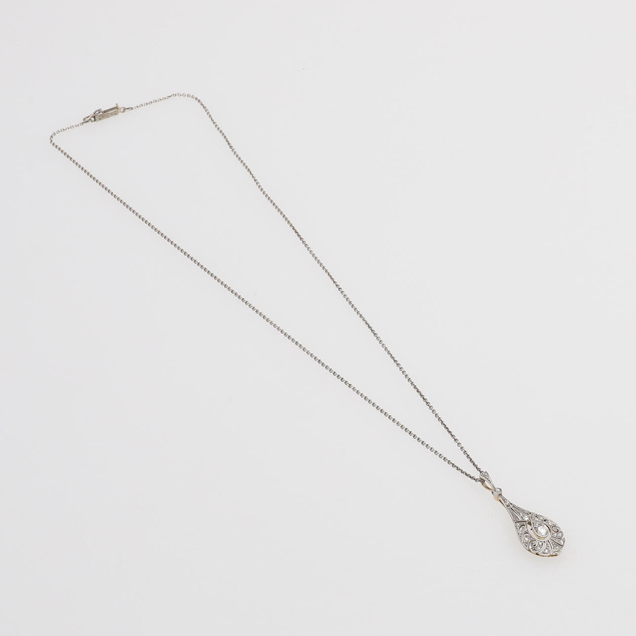 18k vitt guld med 21 gammal- och rosenslipade diamanter, 1900-talets första hälft, höjd ca 3 cm, vikt 1,9 gram. Samtida kedja av silver.