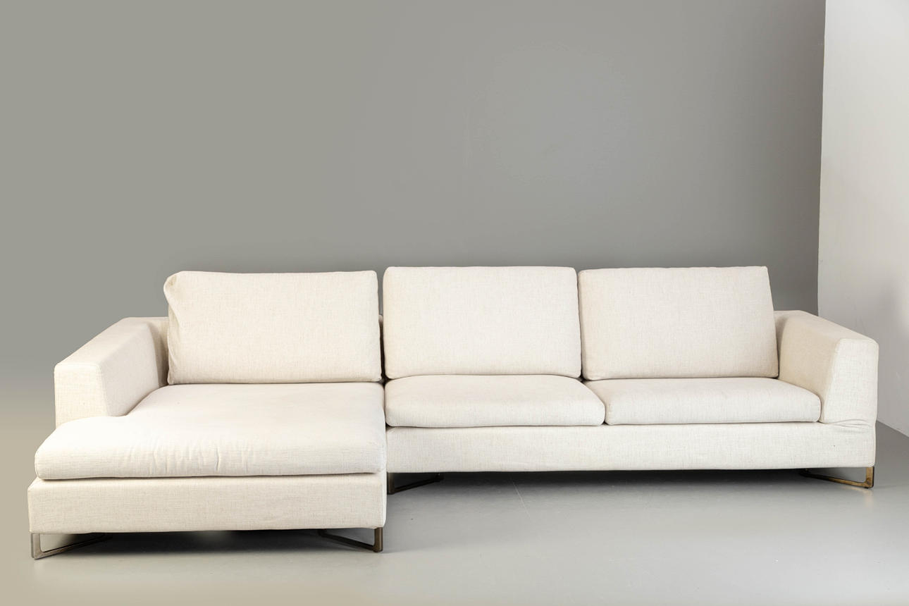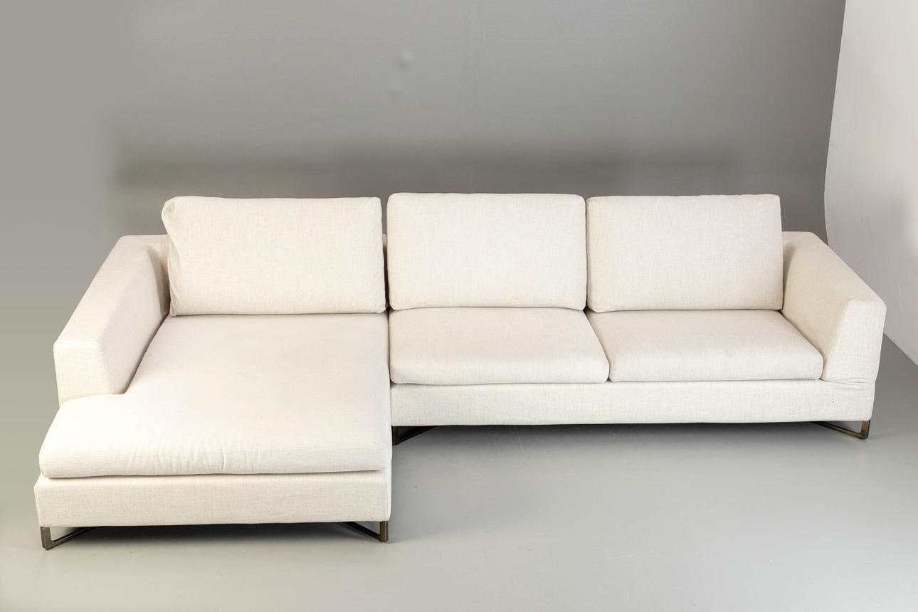 Italiensk design 2-delad hörnsoffa, helt klädd och täckt med beige tyg. Svarta kromade metallben BxD: 320x180cm.