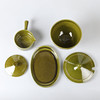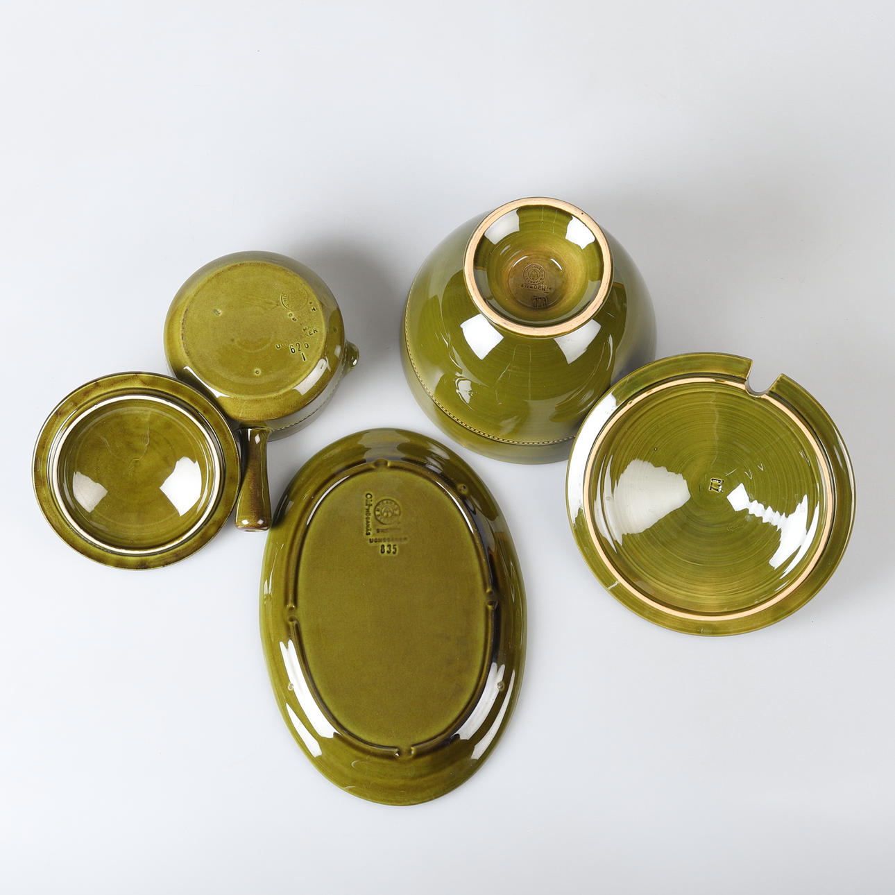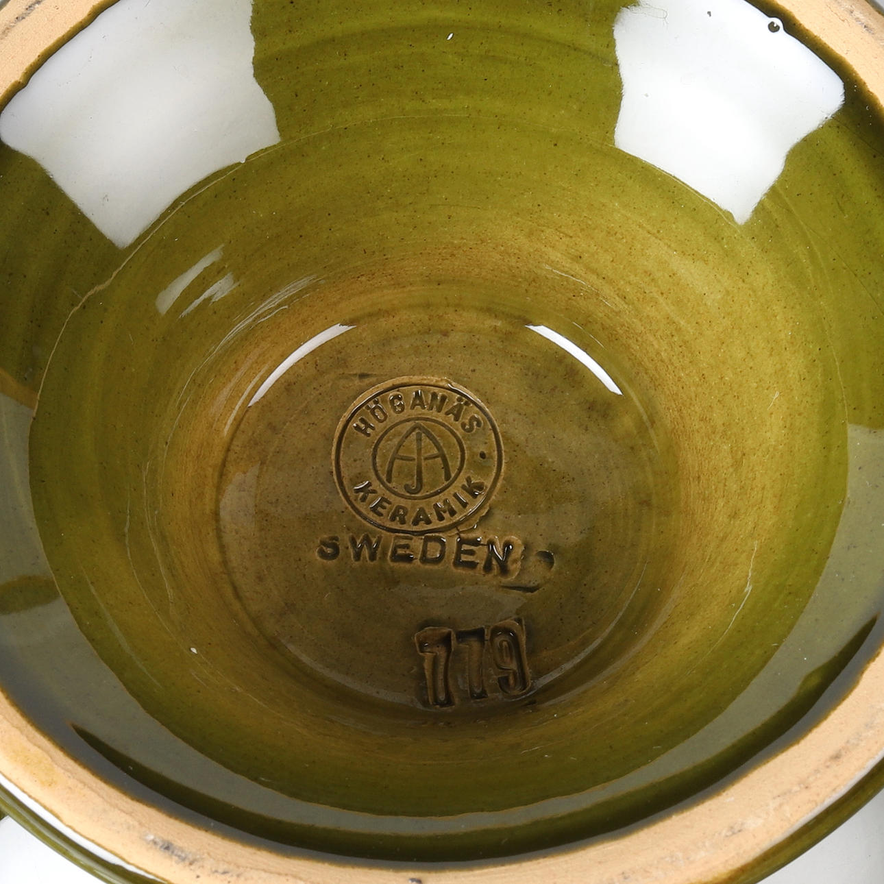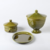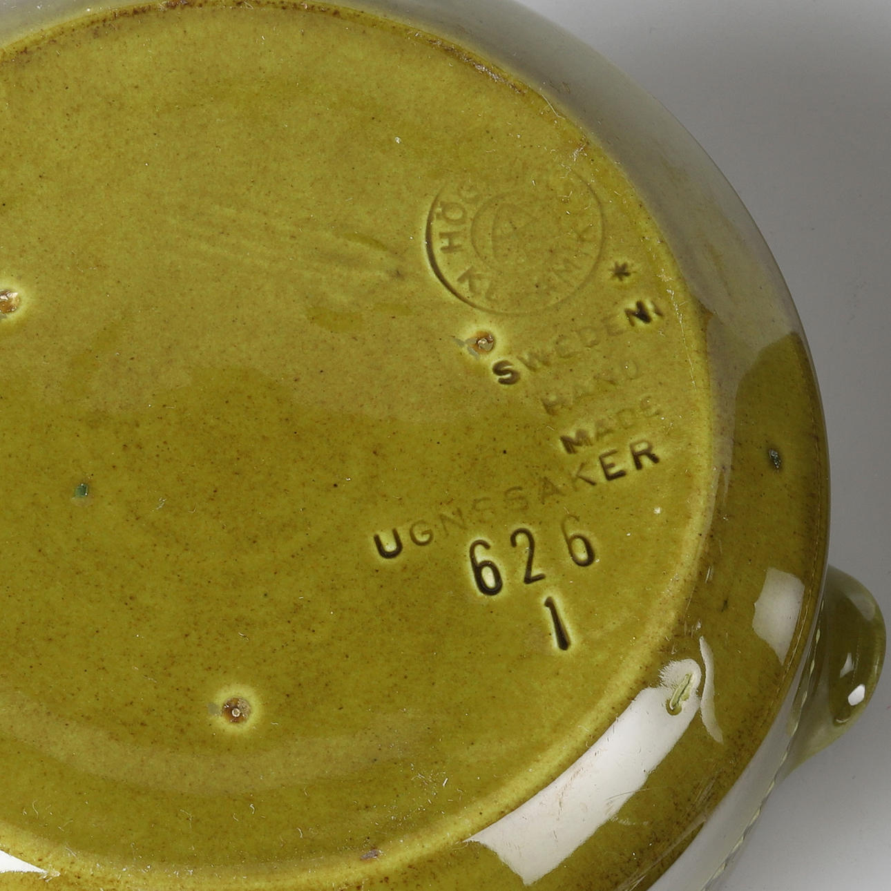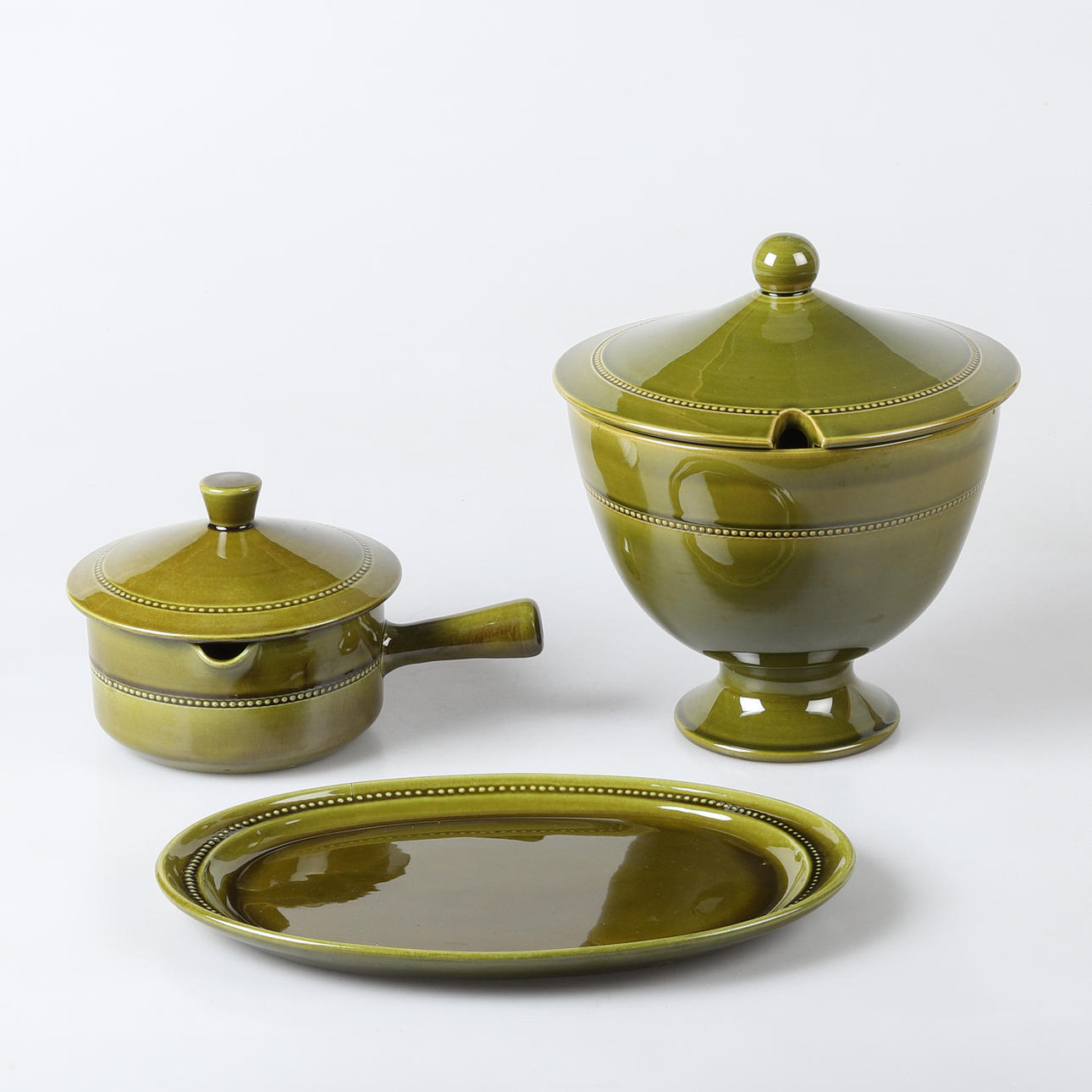 Terrin, höjd 17 cm, diameter 20,5 cm Lockkarott, höjd 7,5 cm, dia. 14 cm Serveringsfat, 30x20,5 cm.