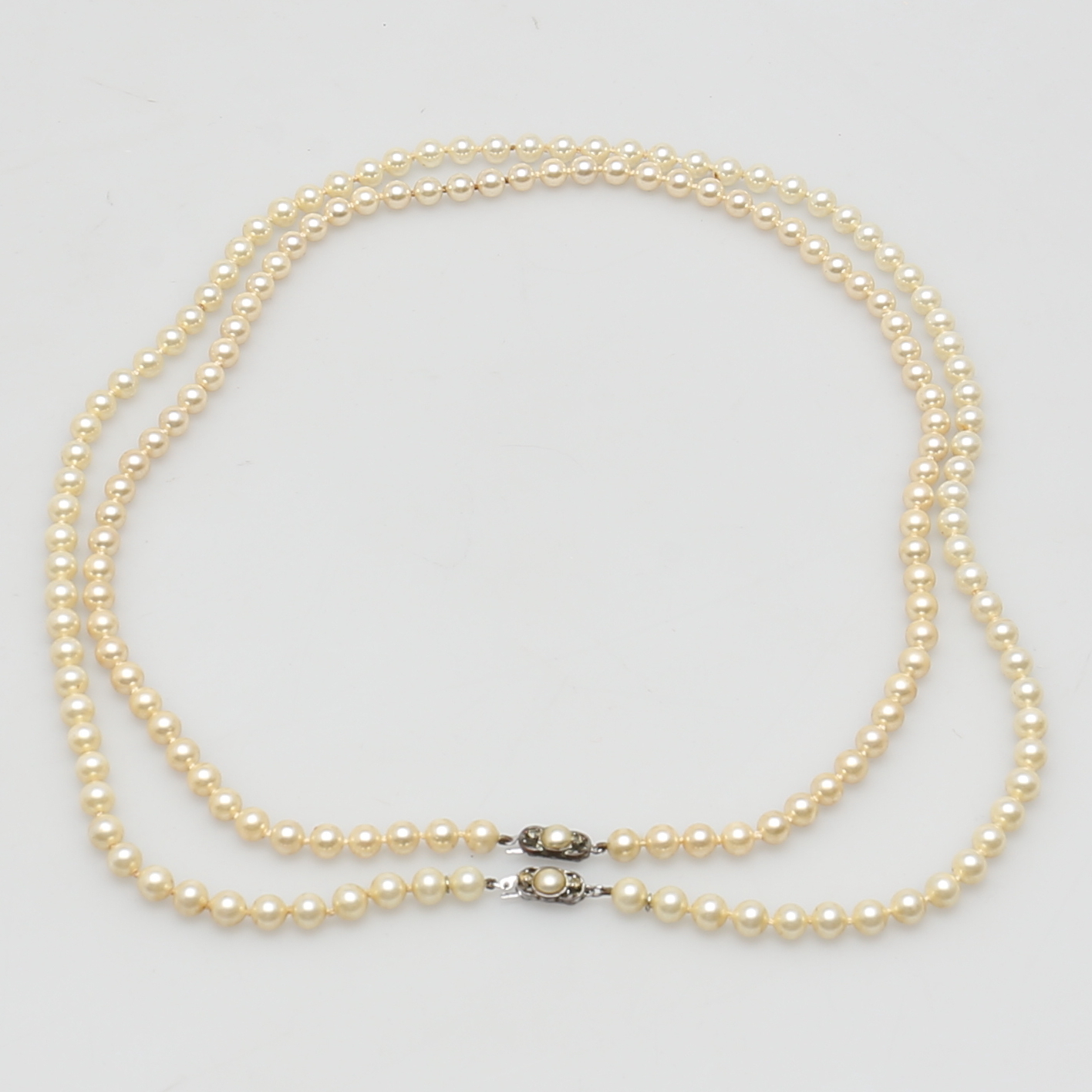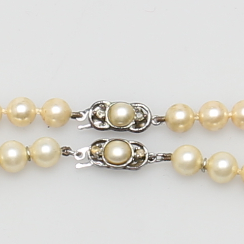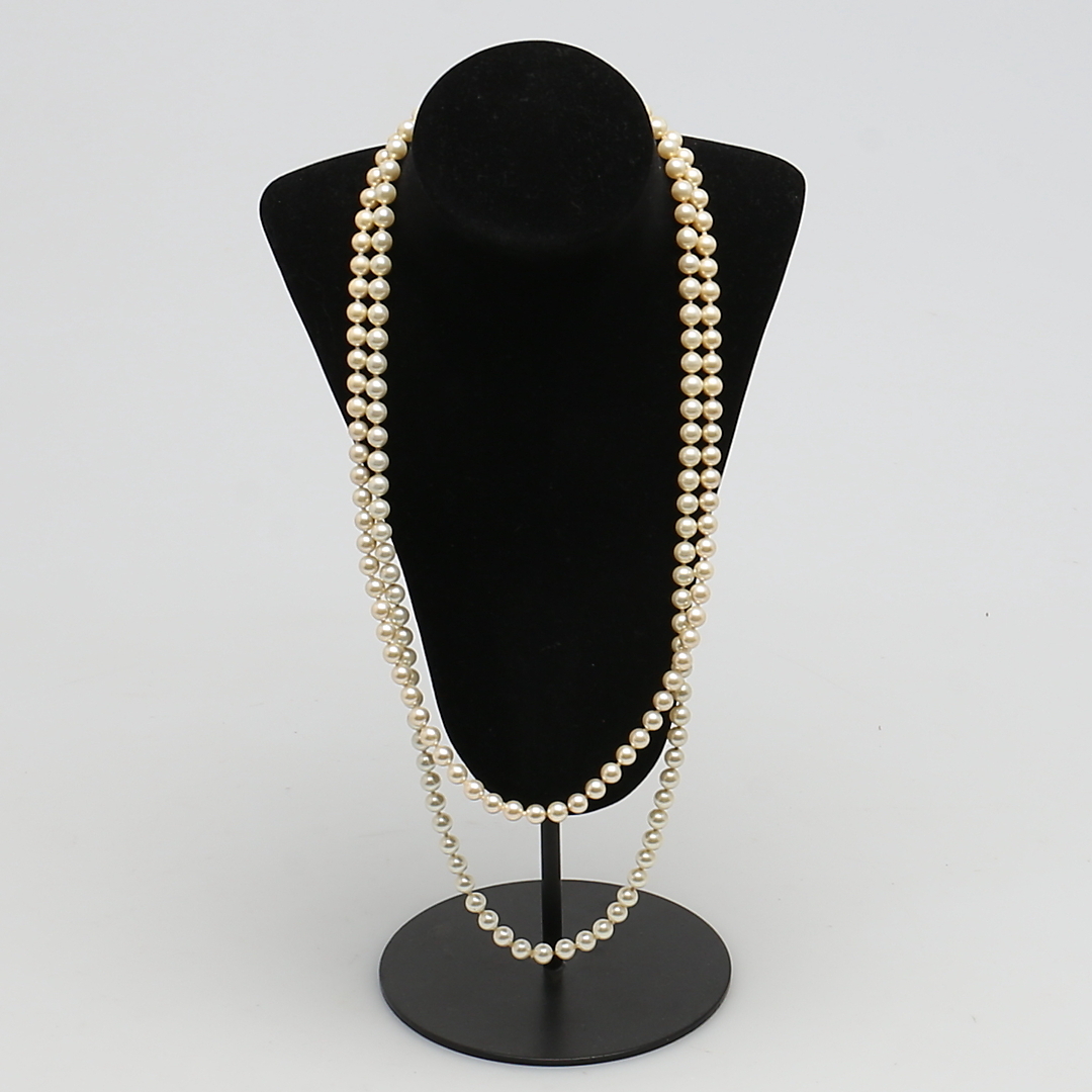 200222. PÄRLCOLLIER. 2 st. Odlade pärlor. Silverlås.