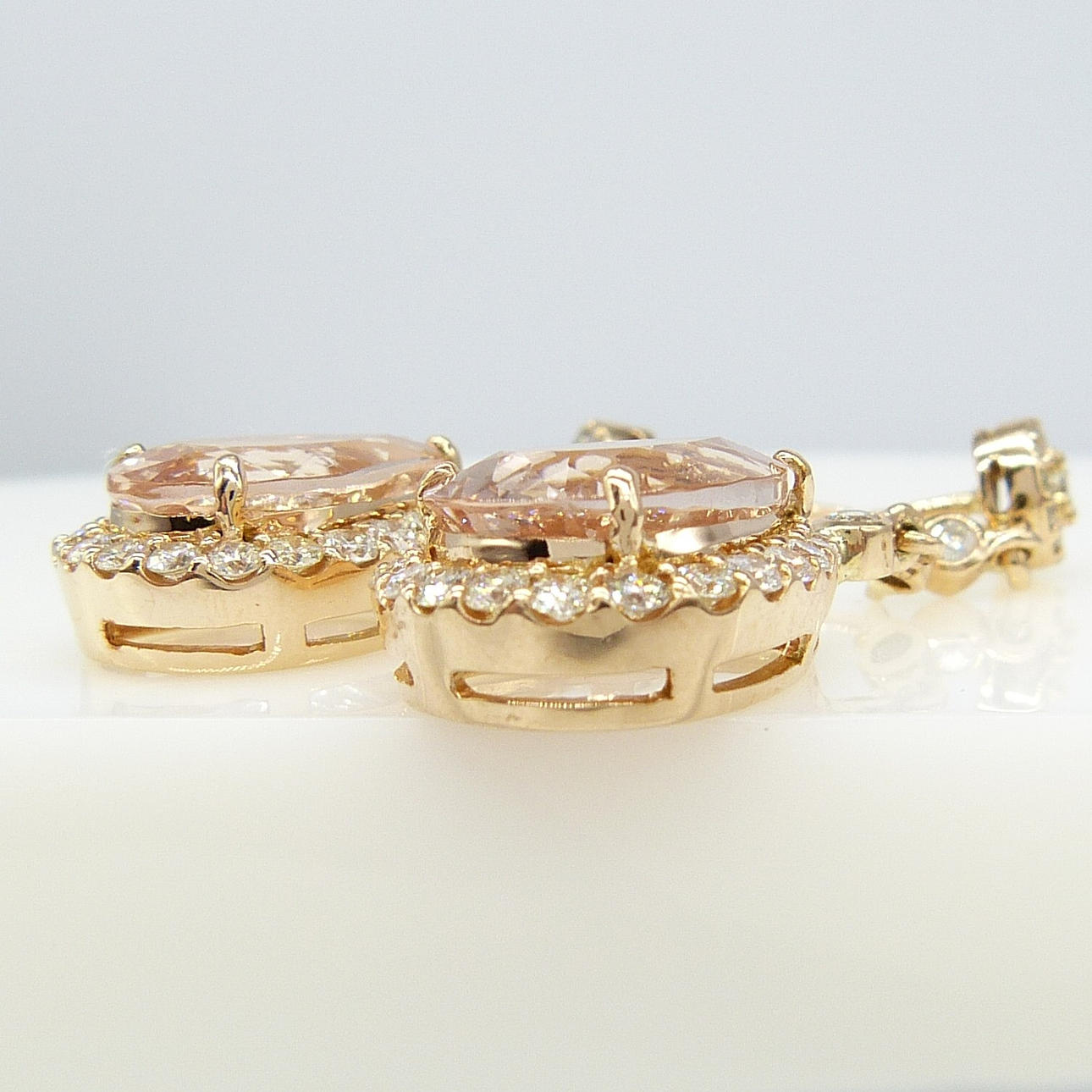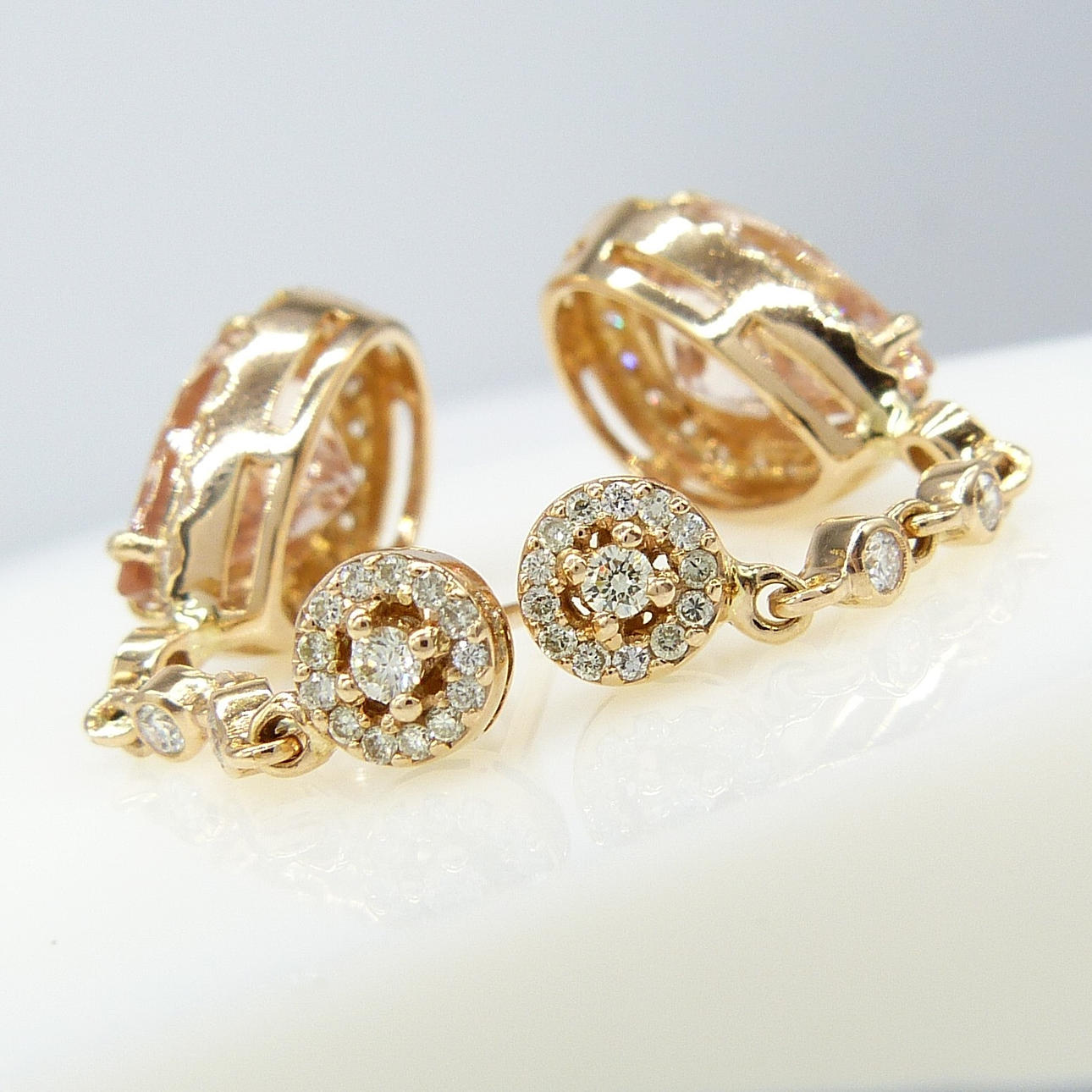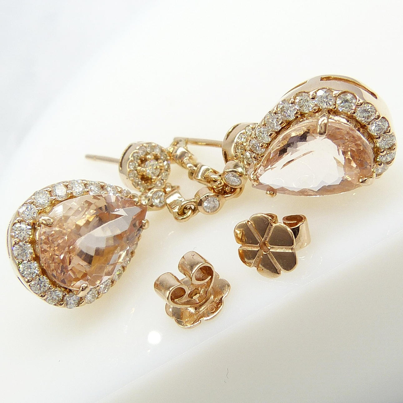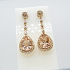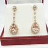 4-klo inställd på botten av varje örhänge är en enda päronskuren persika morganit ädelsten. Den sammanlagda vikten av båda morganiterna är 5,74 karat.