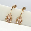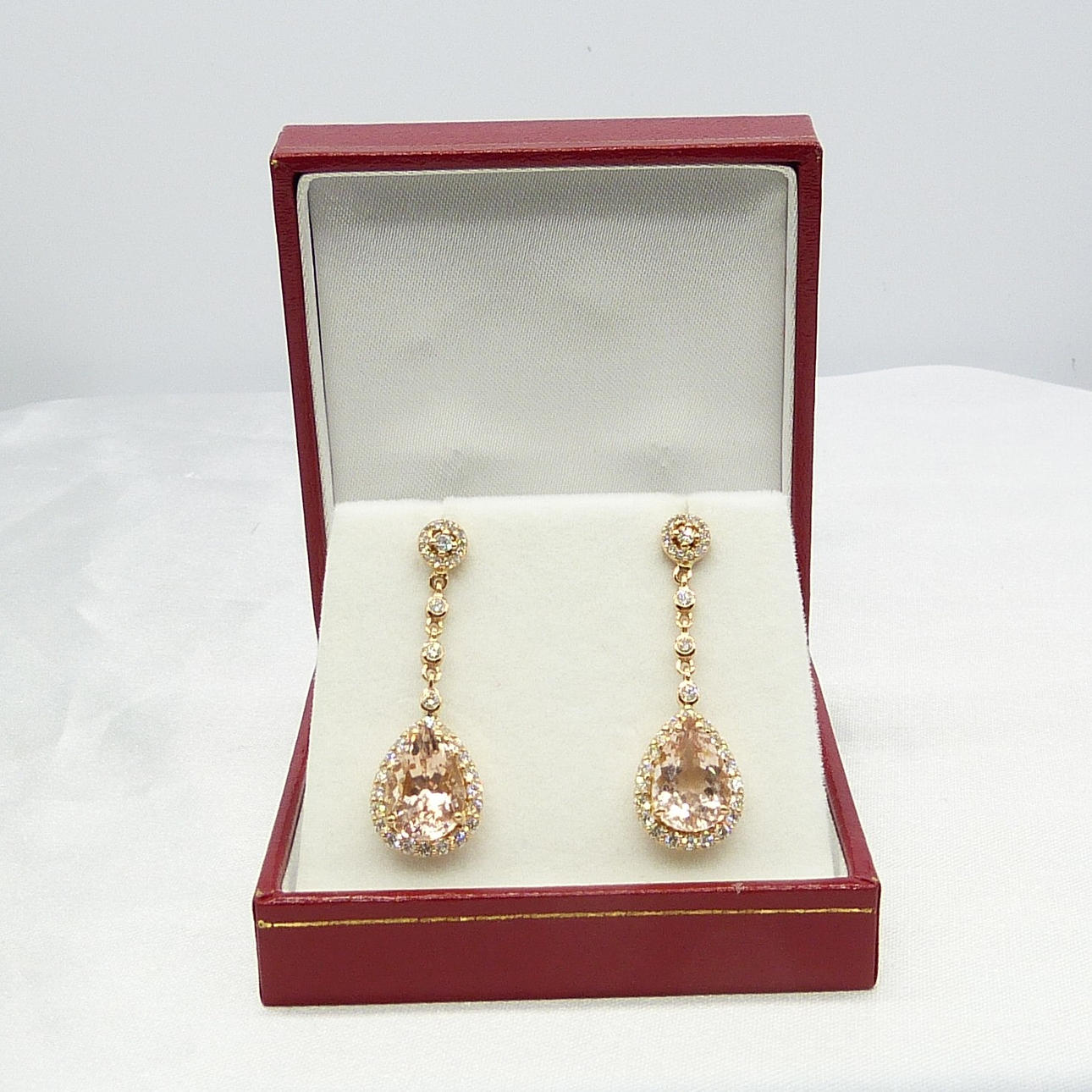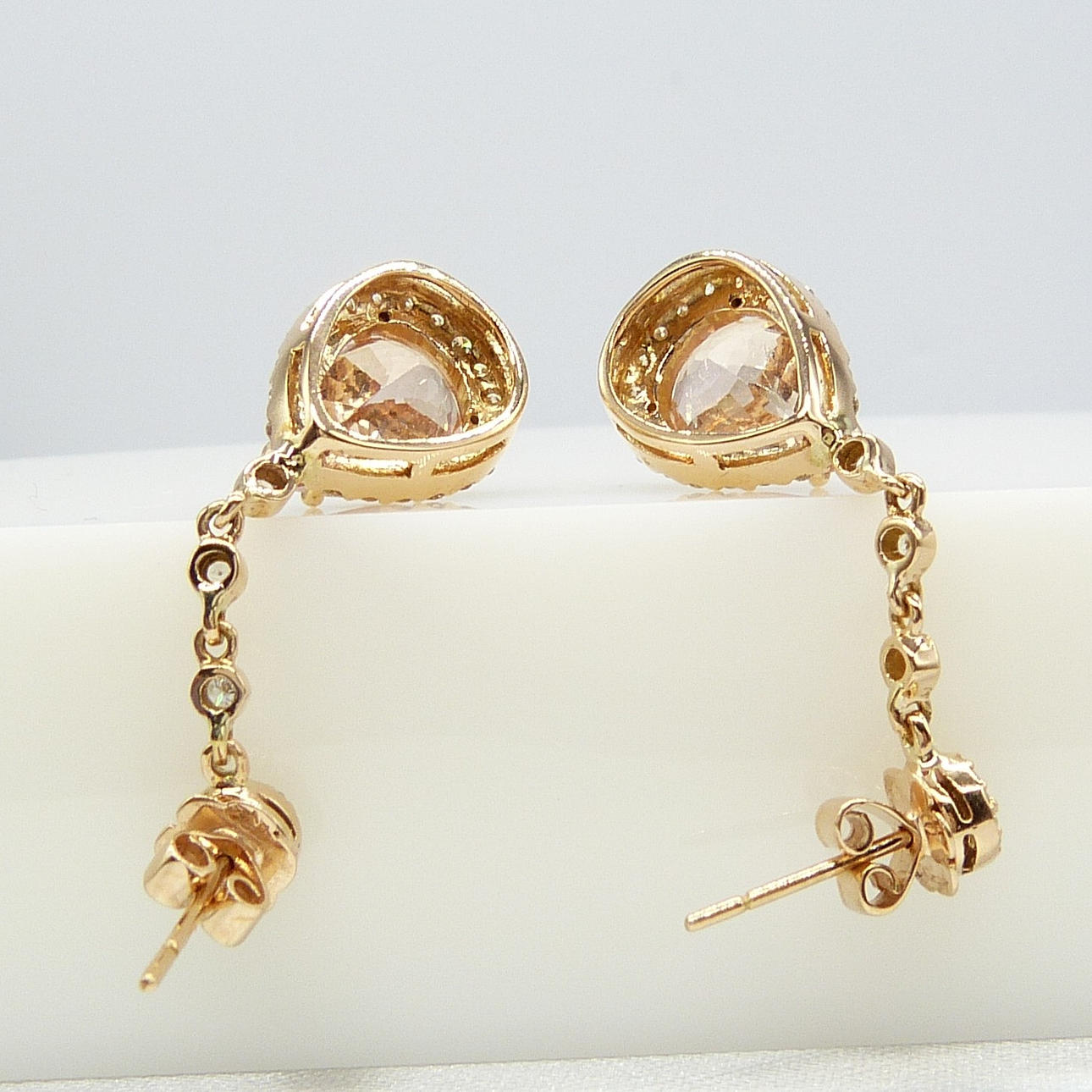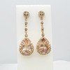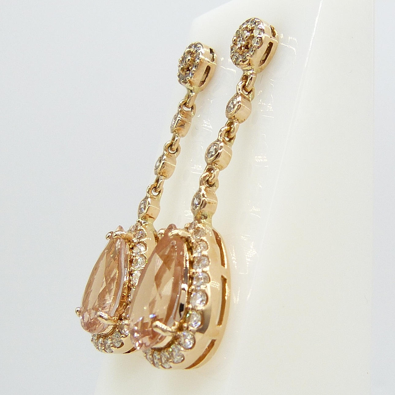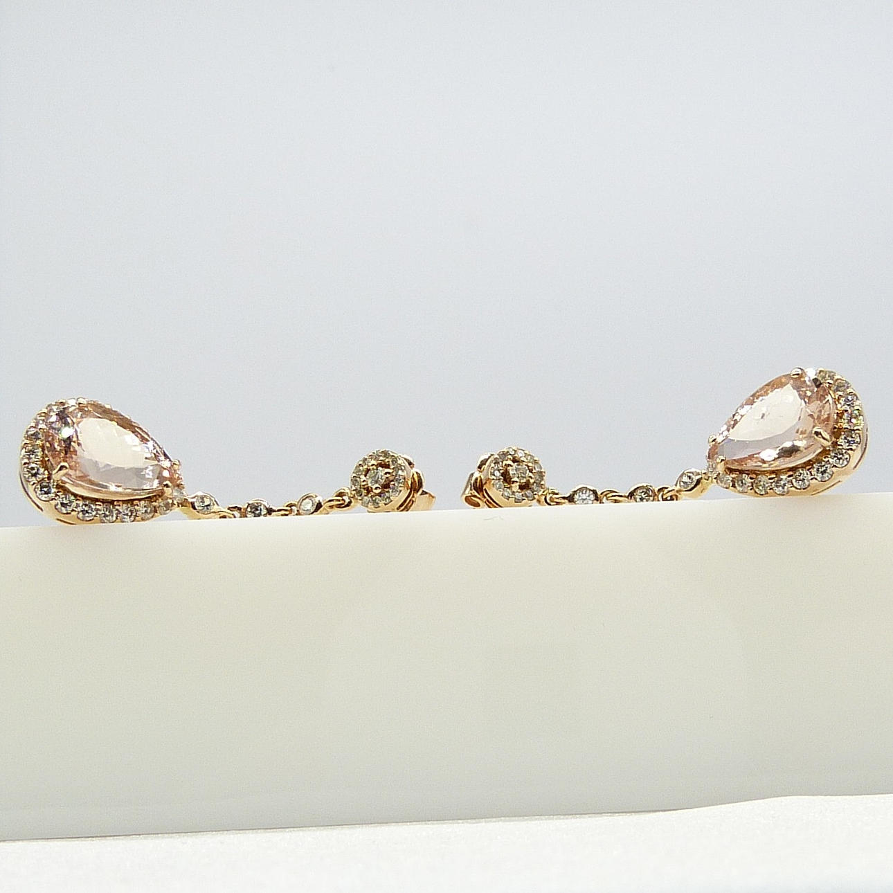 4-klo inställd på botten av varje örhänge är en enda päronskuren persika morganit ädelsten. Den sammanlagda vikten av båda morganiterna är 5,74 karat.