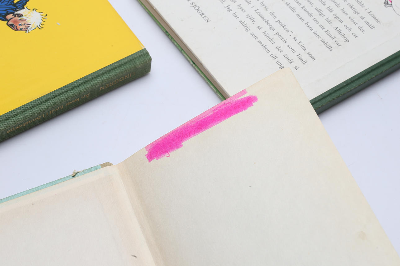 Påskrifter med penna. Pärmar med slitage och skador. Ej genomgångna. Ställvis färglagda illustrationer i Bara roligt i Bullerbyn.
