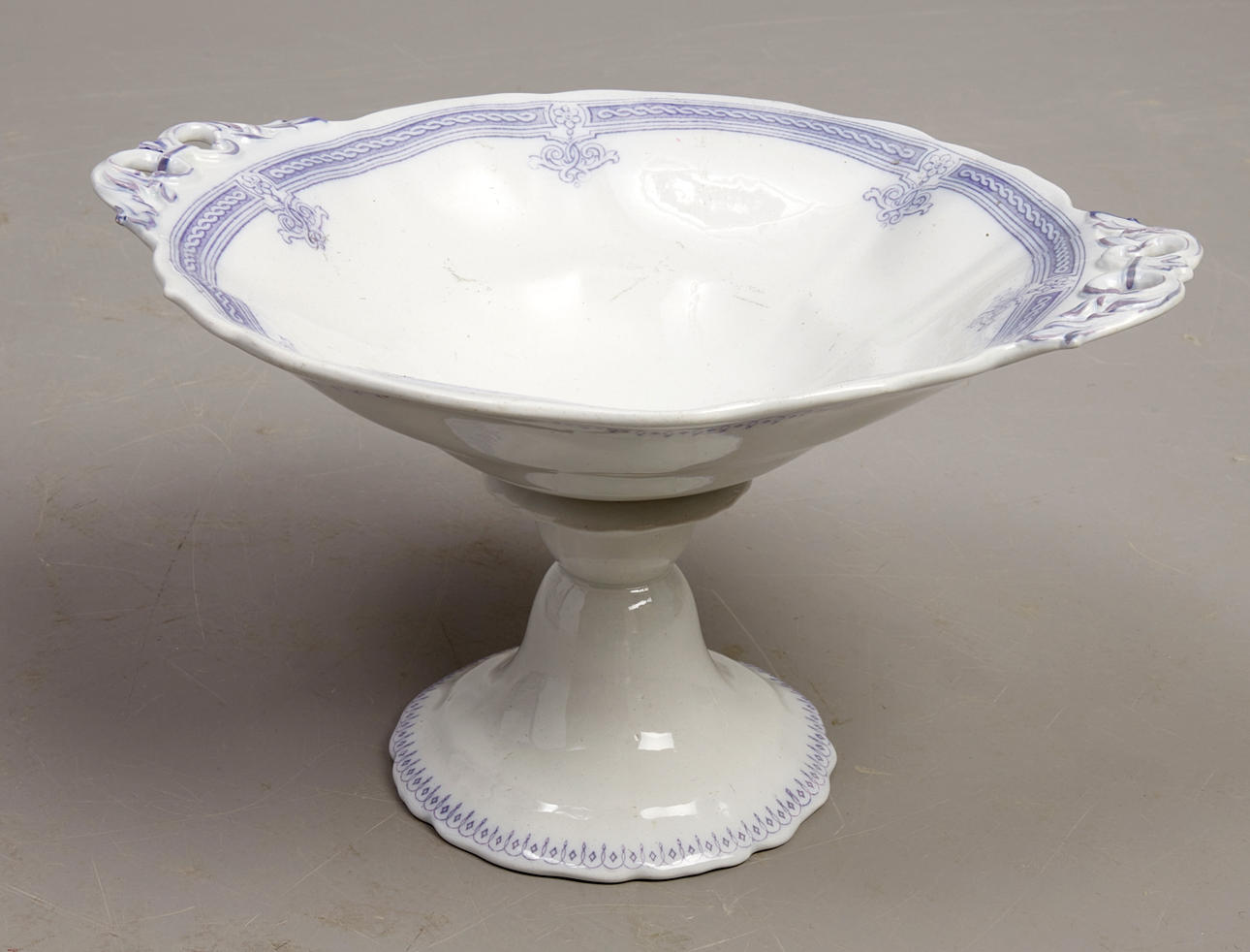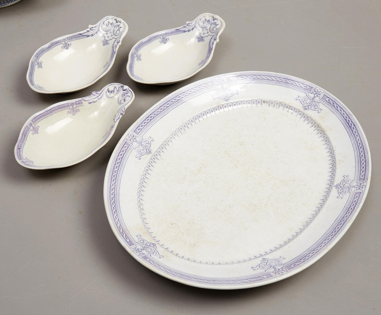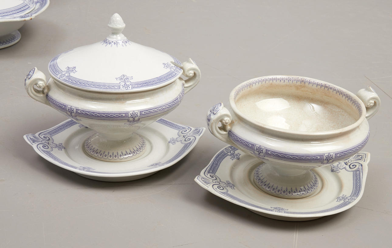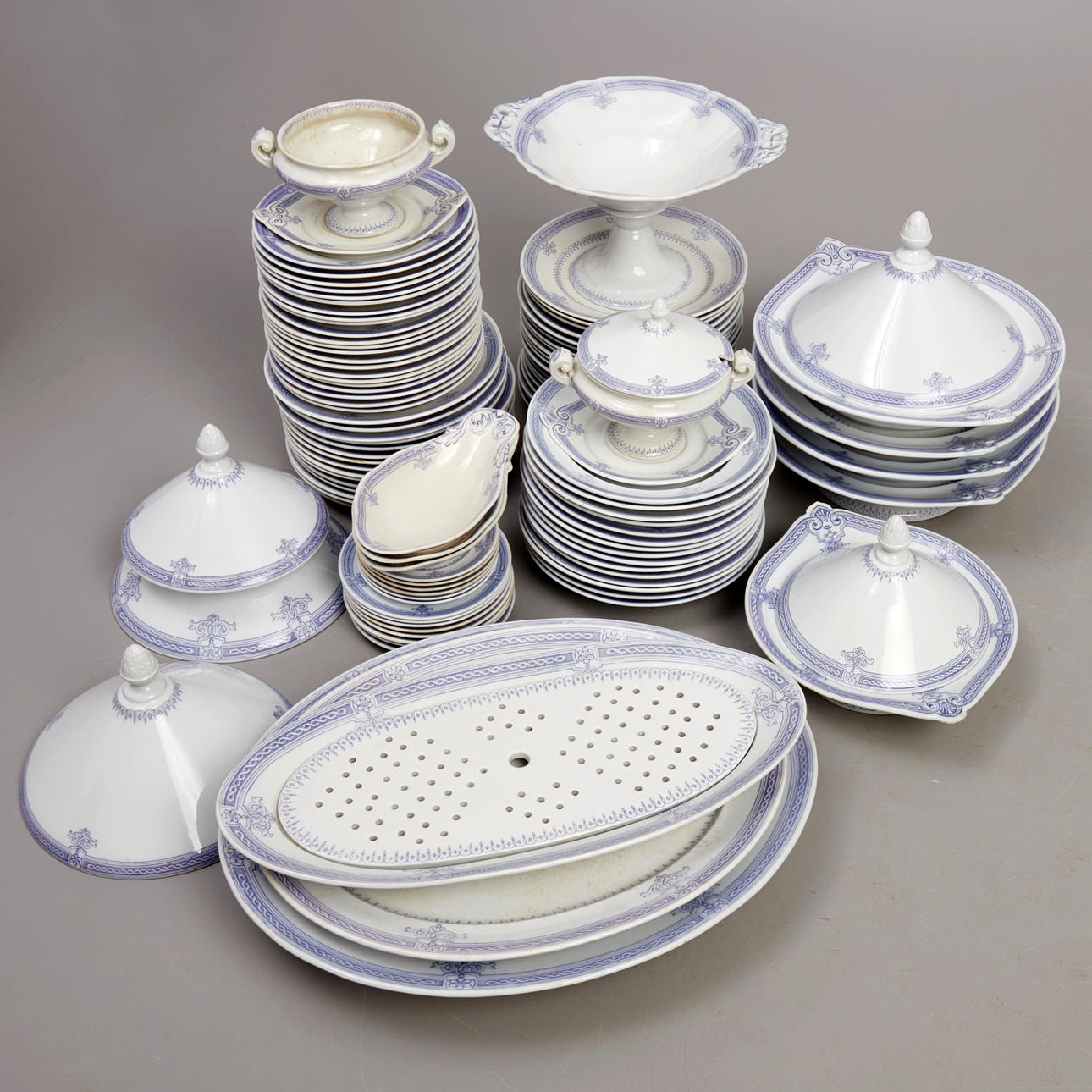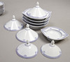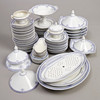 35 mattallrikar 25cm, 15 djupa tallrikar, 24cm, 22 förrättstallrikar 21,5cm, 8 assietter 16,5cm, 6 fat 13,5cm, 4 uppläggningskarotter varav 3 med lock, 1 mindre d:o med lock, 2 uppläggningsfat 44, 50cm, fiskfat 48cm, skål på fot, 2 skålar med fat varav 1 med lock, 3 såsskålar.