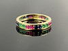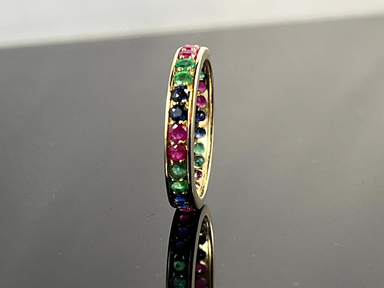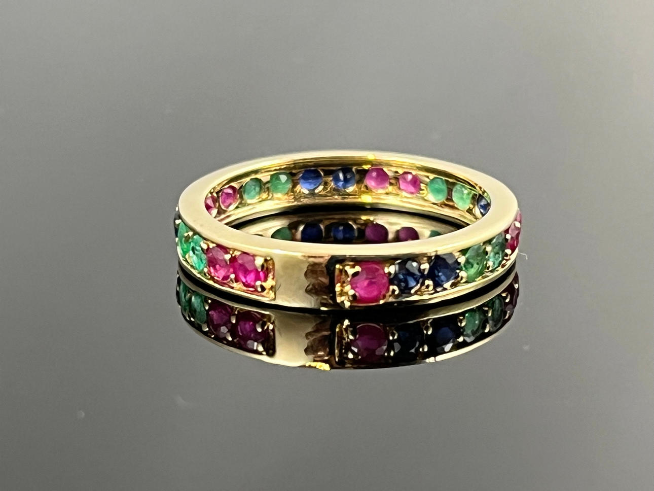 Typ: Memoire Ring Material: 585/000 gult guld Stenutsmyckning, 9 rubiner, 8 safirer, 8 smaragder, alla rundade fasetterade, skiftande färger Vikt: 2,4 g Ring storlek: 54.