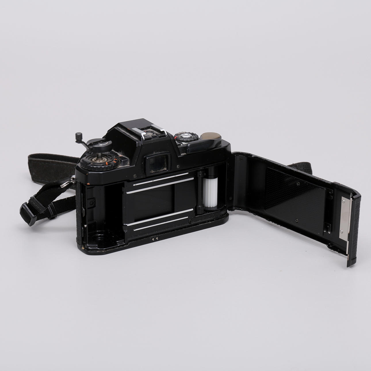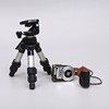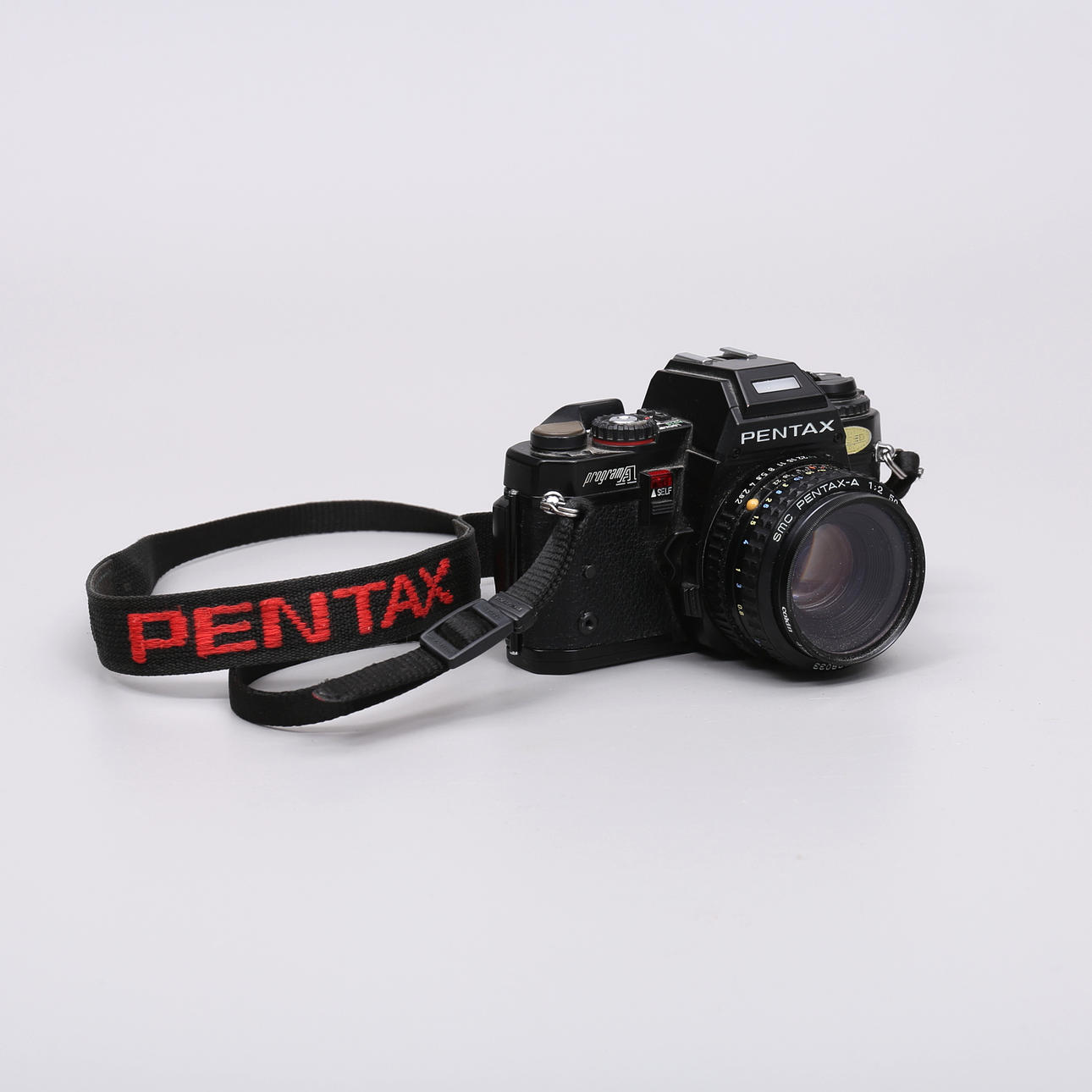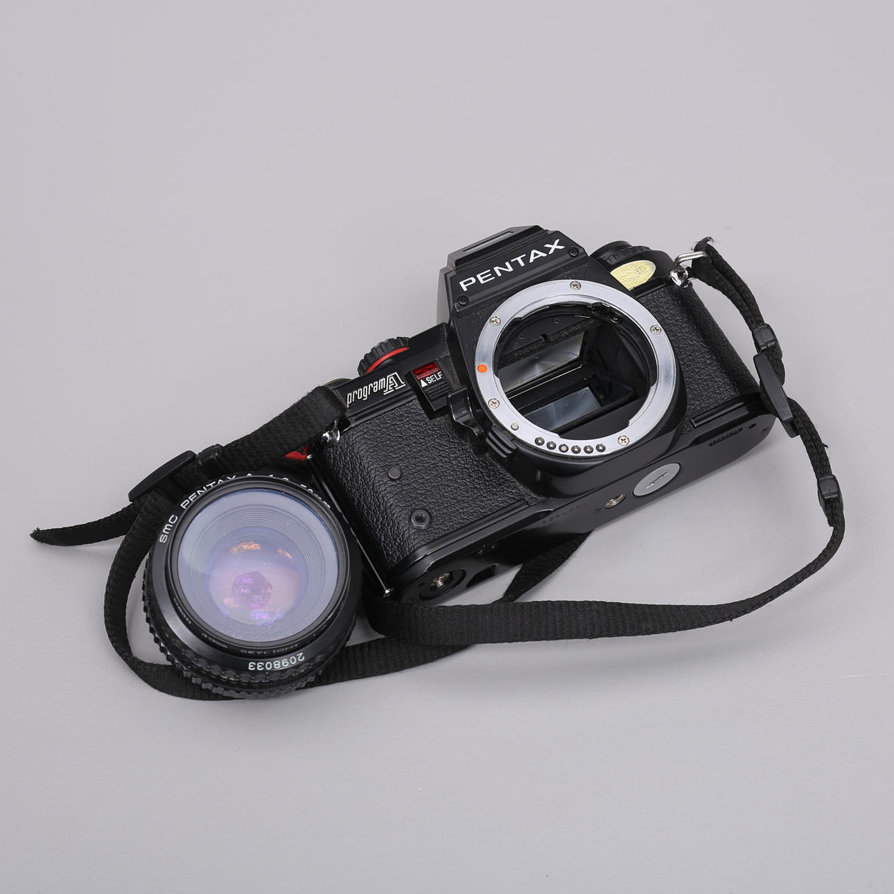 Kamera Pentax Program A med 50 mm objektiv. Vivitar teleconverter 2X. Sigma zoomobjektiv 80-200 mm. Kamerastativ. Ljusmätare Soligor.