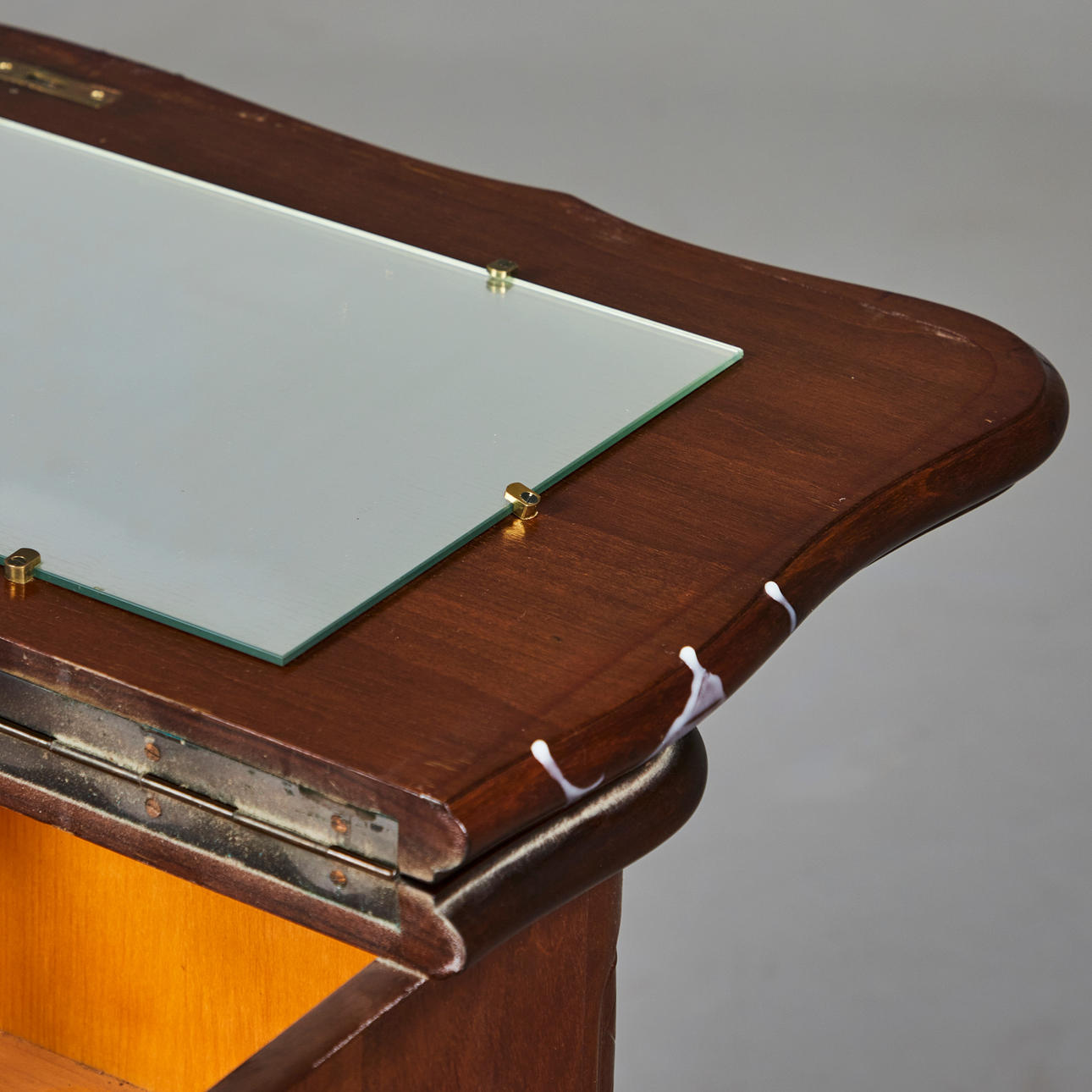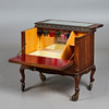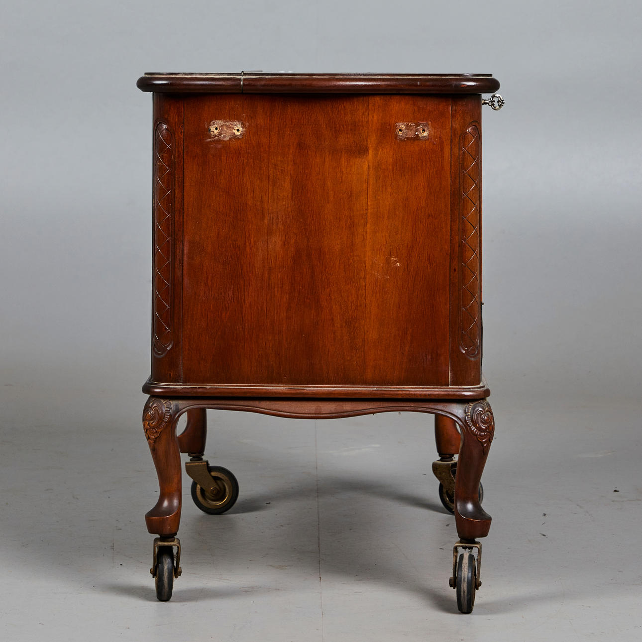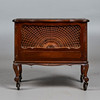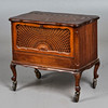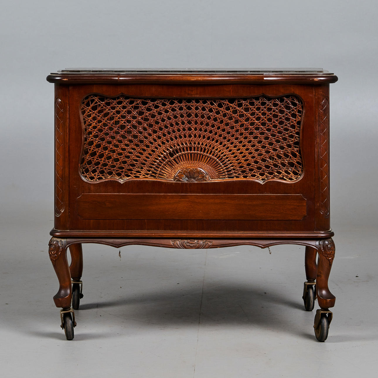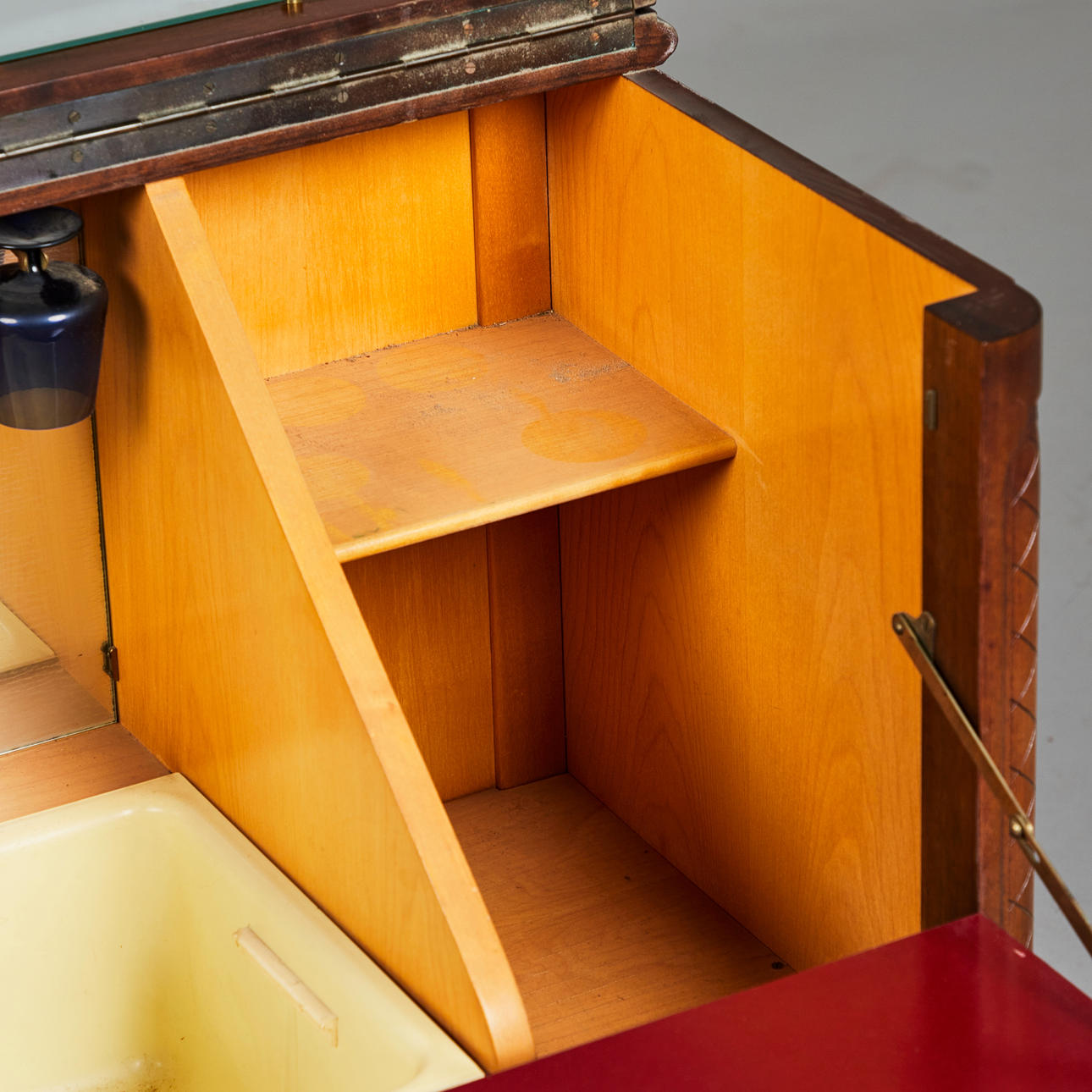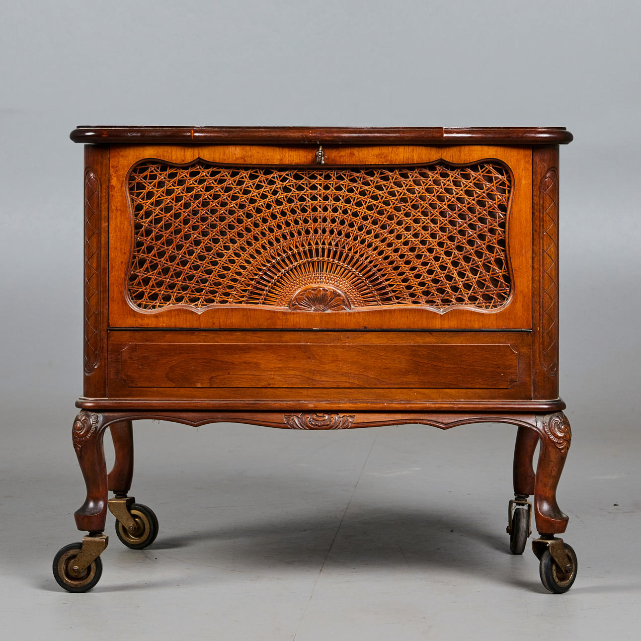 Hem bar/minibar, trä, korg, glas. Mini-bar med en träkropp med konvertibla ben, dekorerad med nät på sidorna, med ett låsbart gångjärnslock med böjda kanter på toppen, en rektangulär spegelyta i locket på insidan, samt sex dricksglas och en plastfrys, H.70cm, W.76cm, D.47cm.