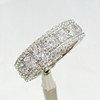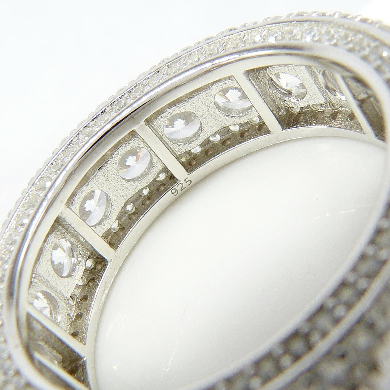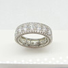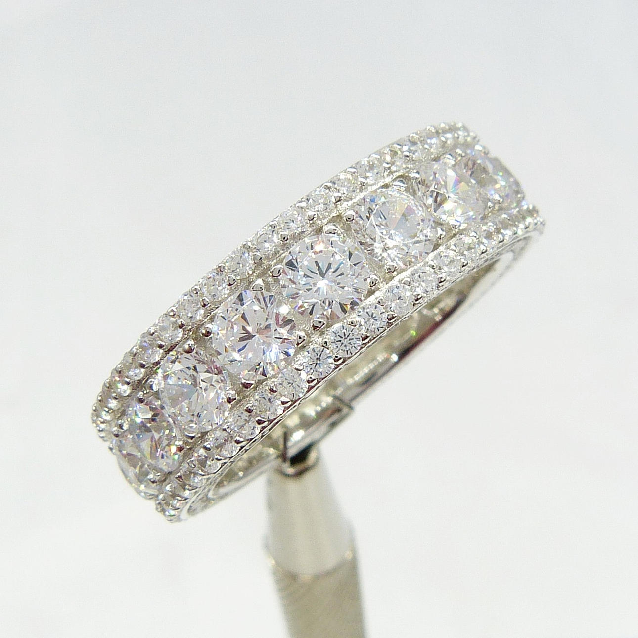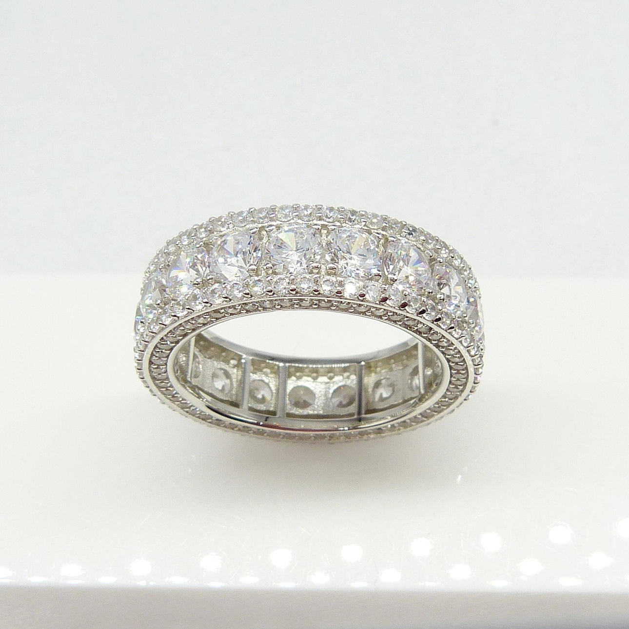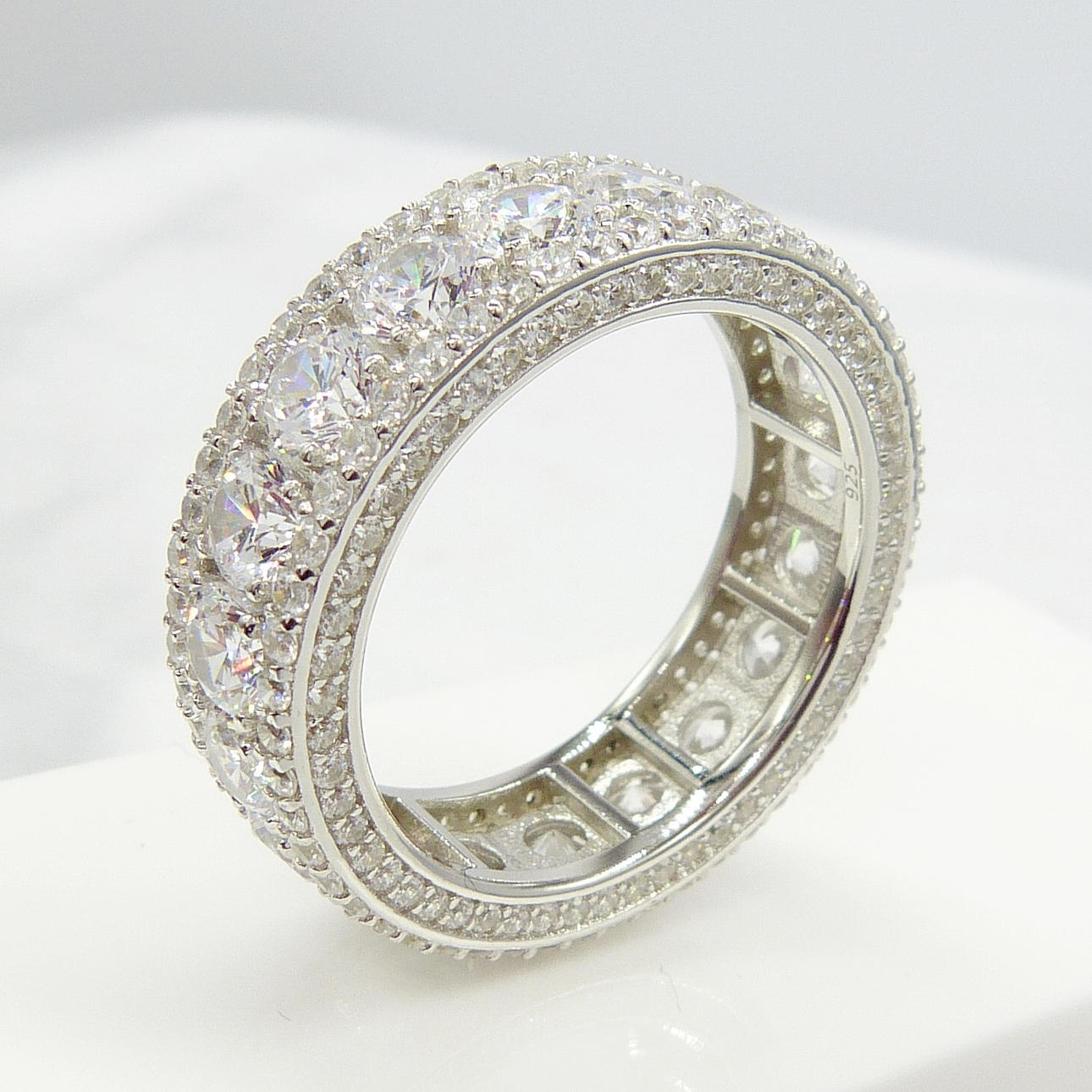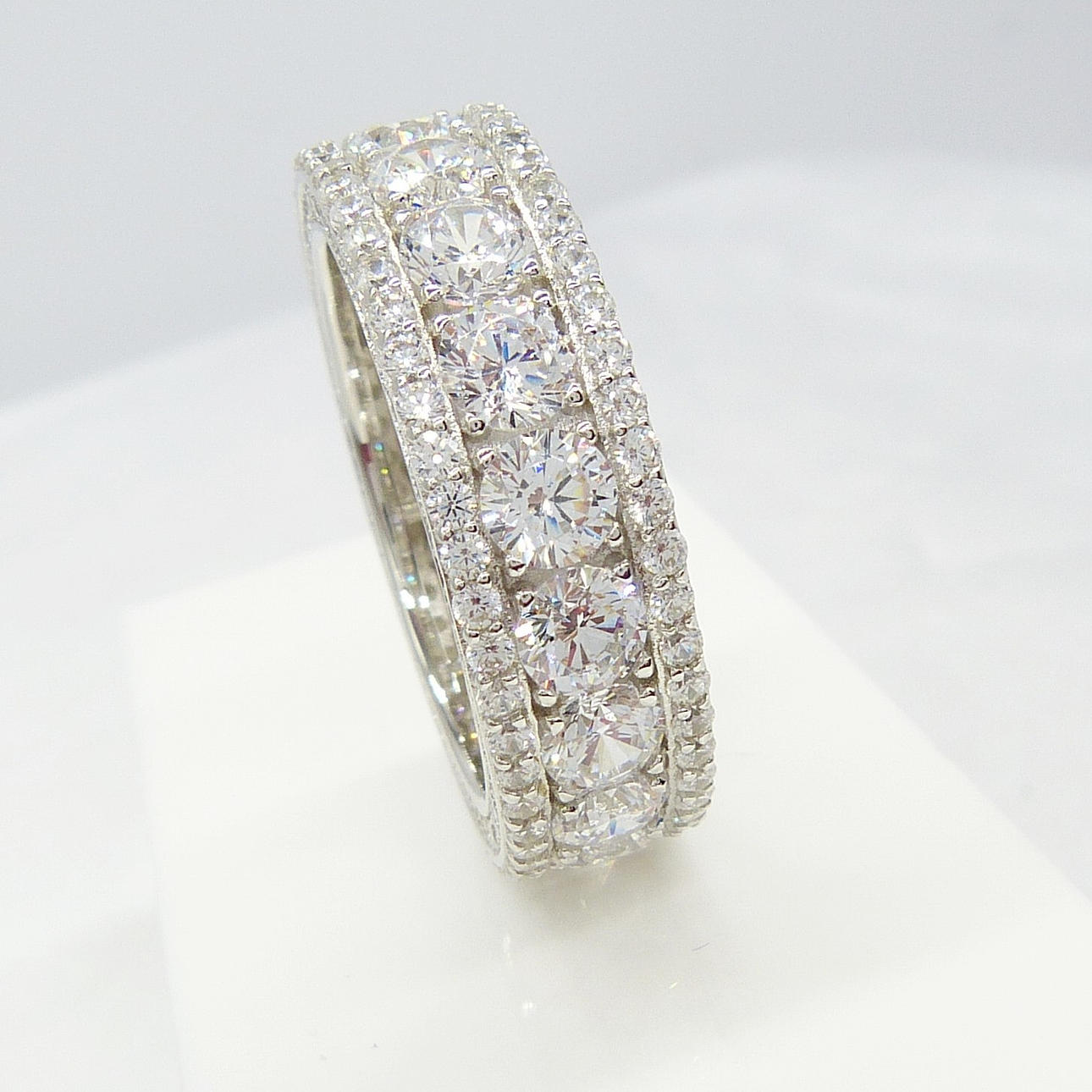 3 rader av cubic zirconia ligger runt denna ring, i en evighet stil. De största stenarna är i mitten.