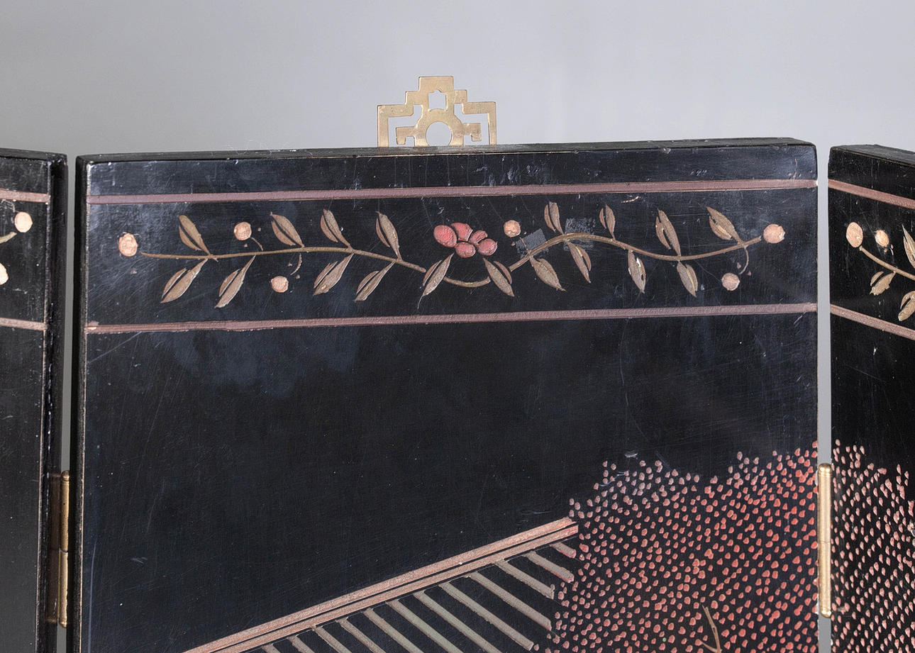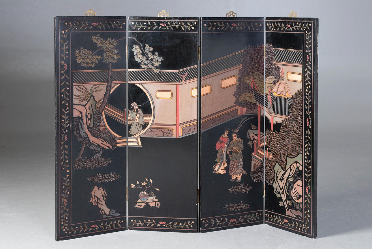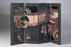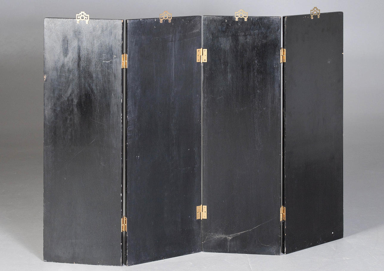 Svartlackerat trä med metallbeslag, 4 vikbara och justerbara paneler, framsida med figurativ skildring i gårdslandskap i gravyr, delvis målad, HxB: 91x122 cm.