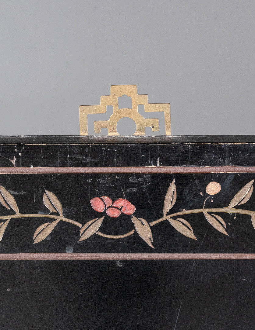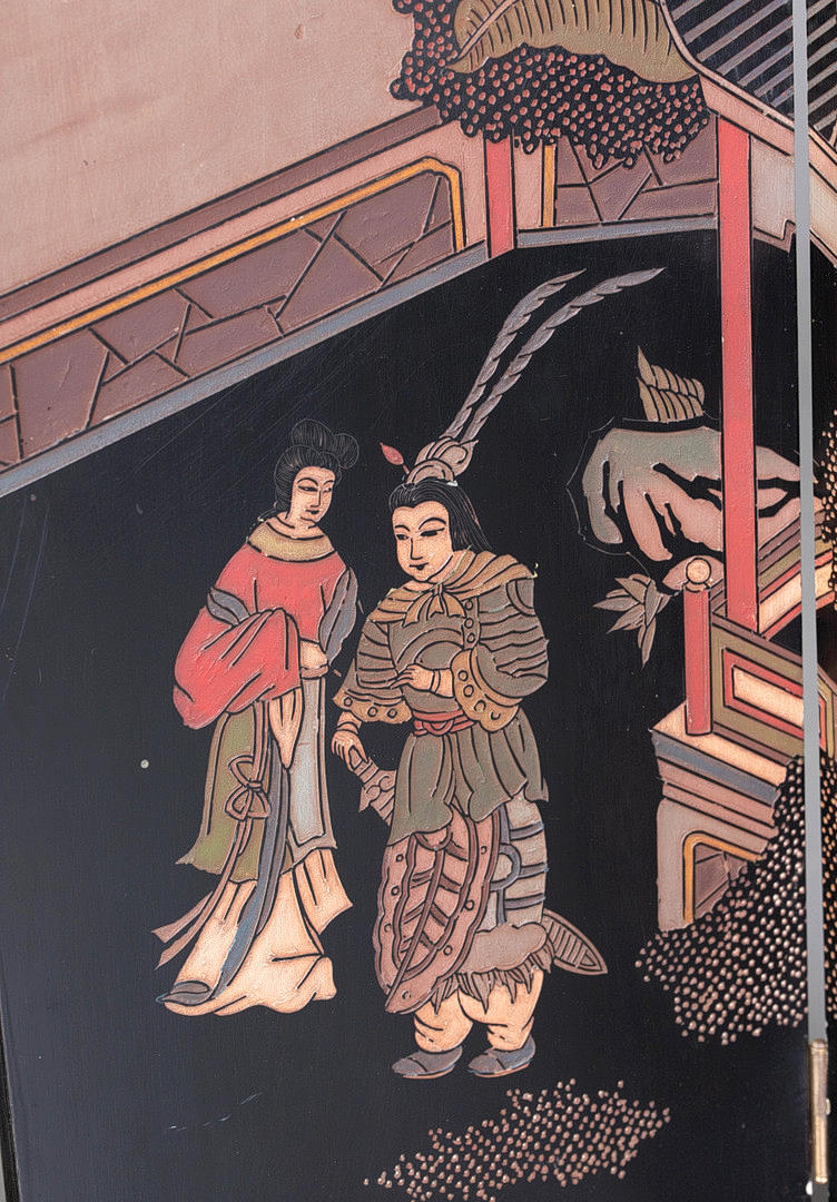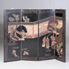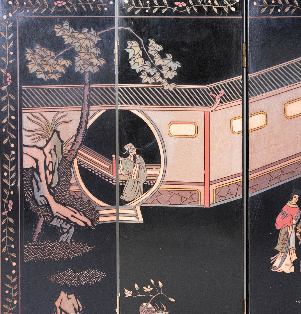 Svartlackerat trä med metallbeslag, 4 vikbara och justerbara paneler, framsida med figurativ skildring i gårdslandskap i gravyr, delvis målad, HxB: 91x122 cm.