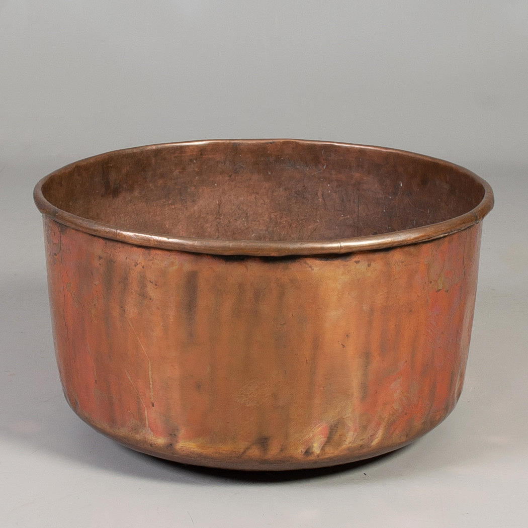Äldre stor, fin kopparbunke för t.ex ved, filtar eller plantering av växter. Höjd 35 cm och 62 i Ø.
