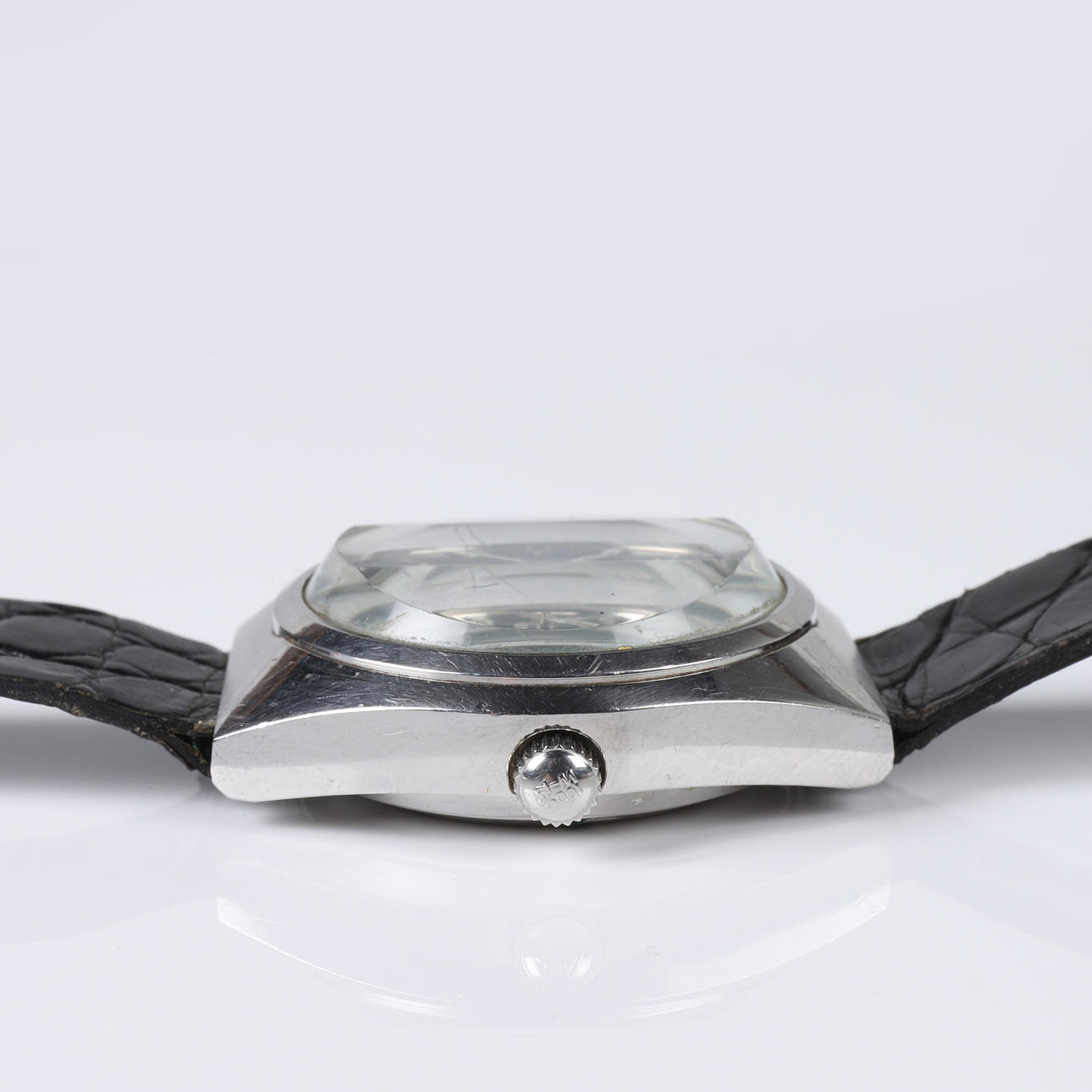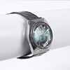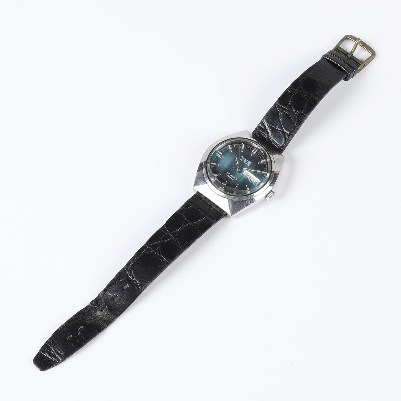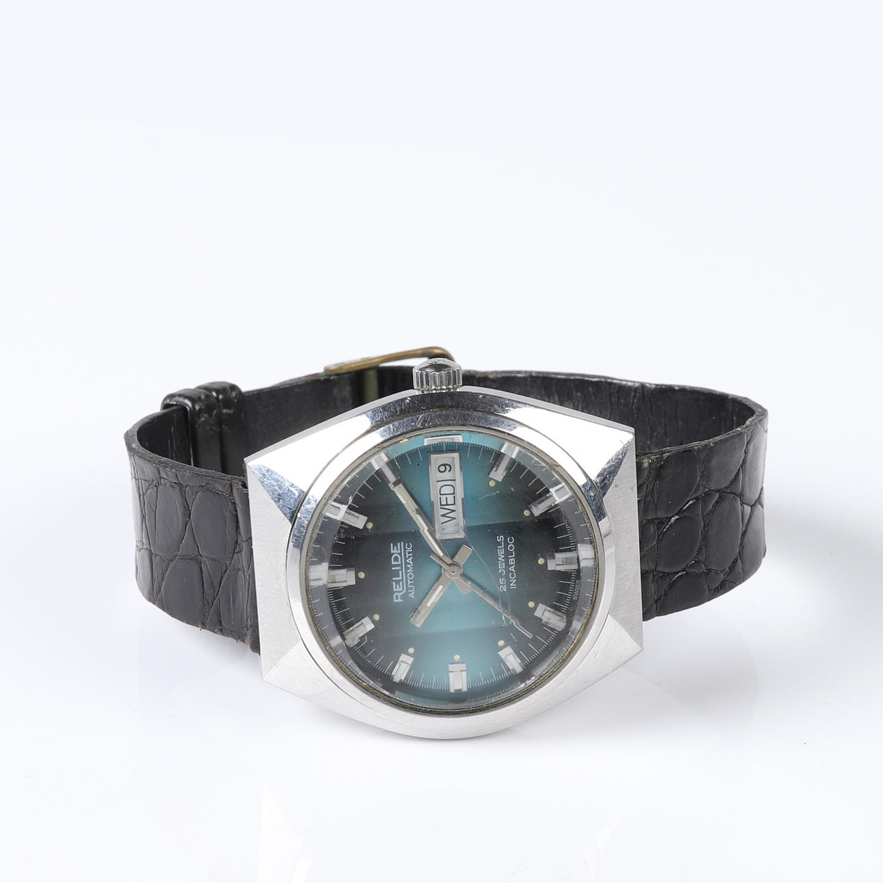 Ajax armbandsur med boett i stål, turkos urtavla med stavindex, dag- och datumvisning. Fasetterat glas Rem i krokodilpräglat läder.