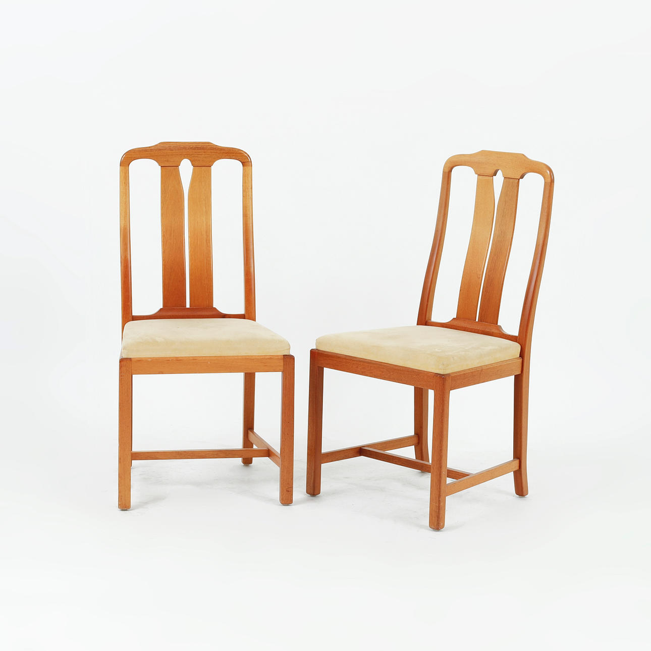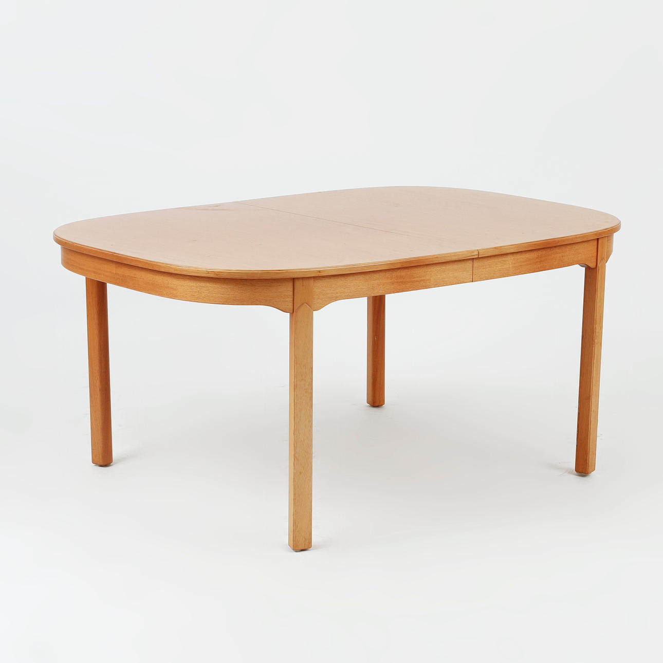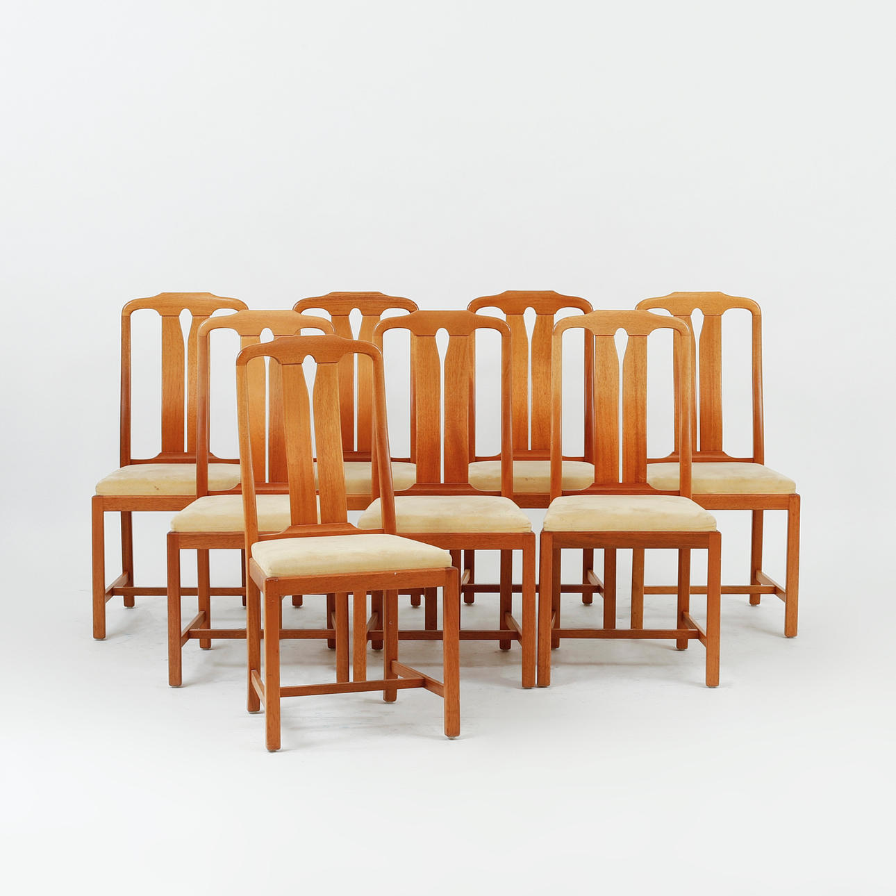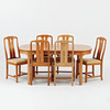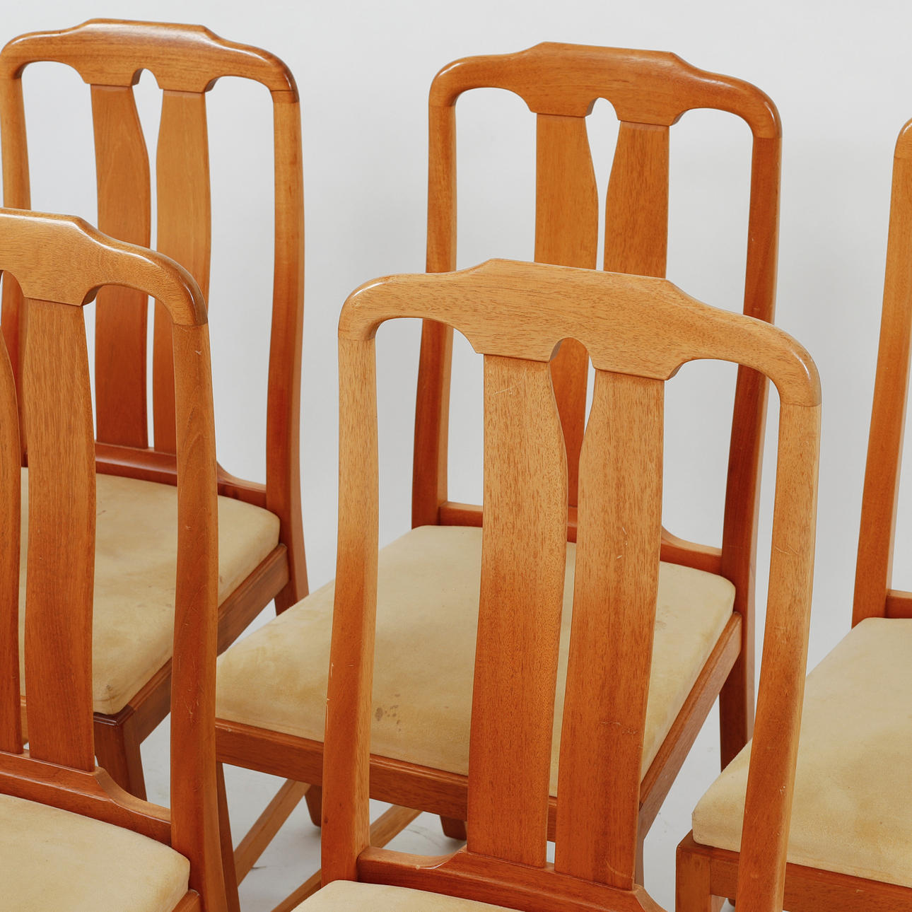 Valnöt, bord längd 161 cm + 3 iläggskivor á 58 cm, bredd 112 cm, höjd 75 cm, 8 stolar.