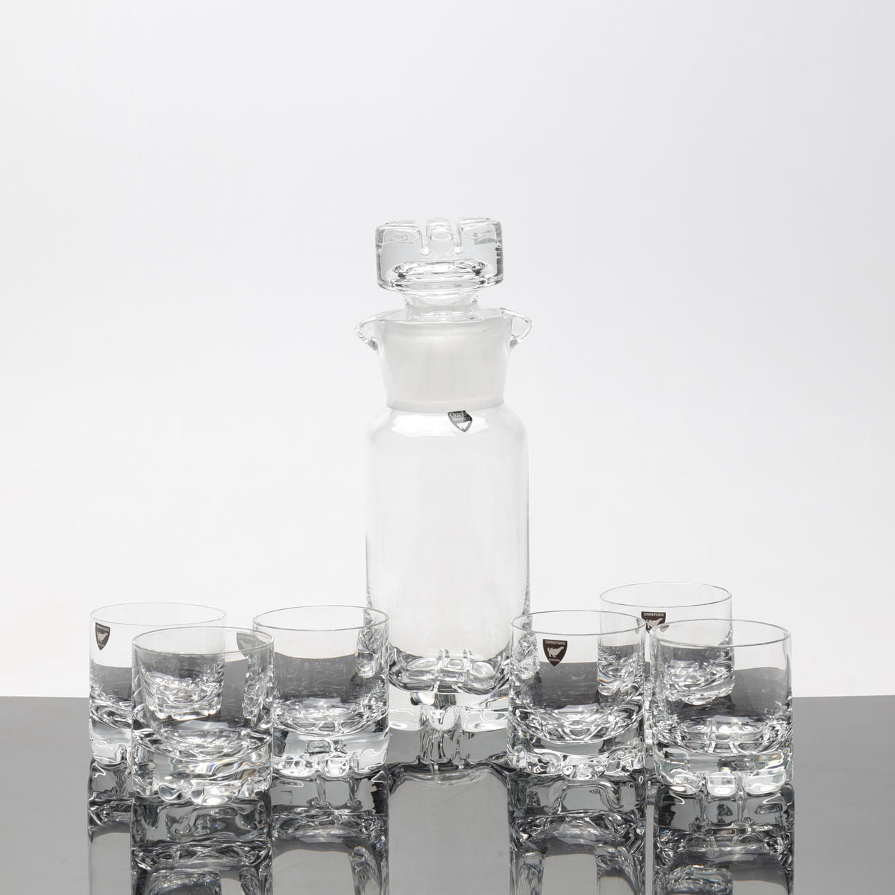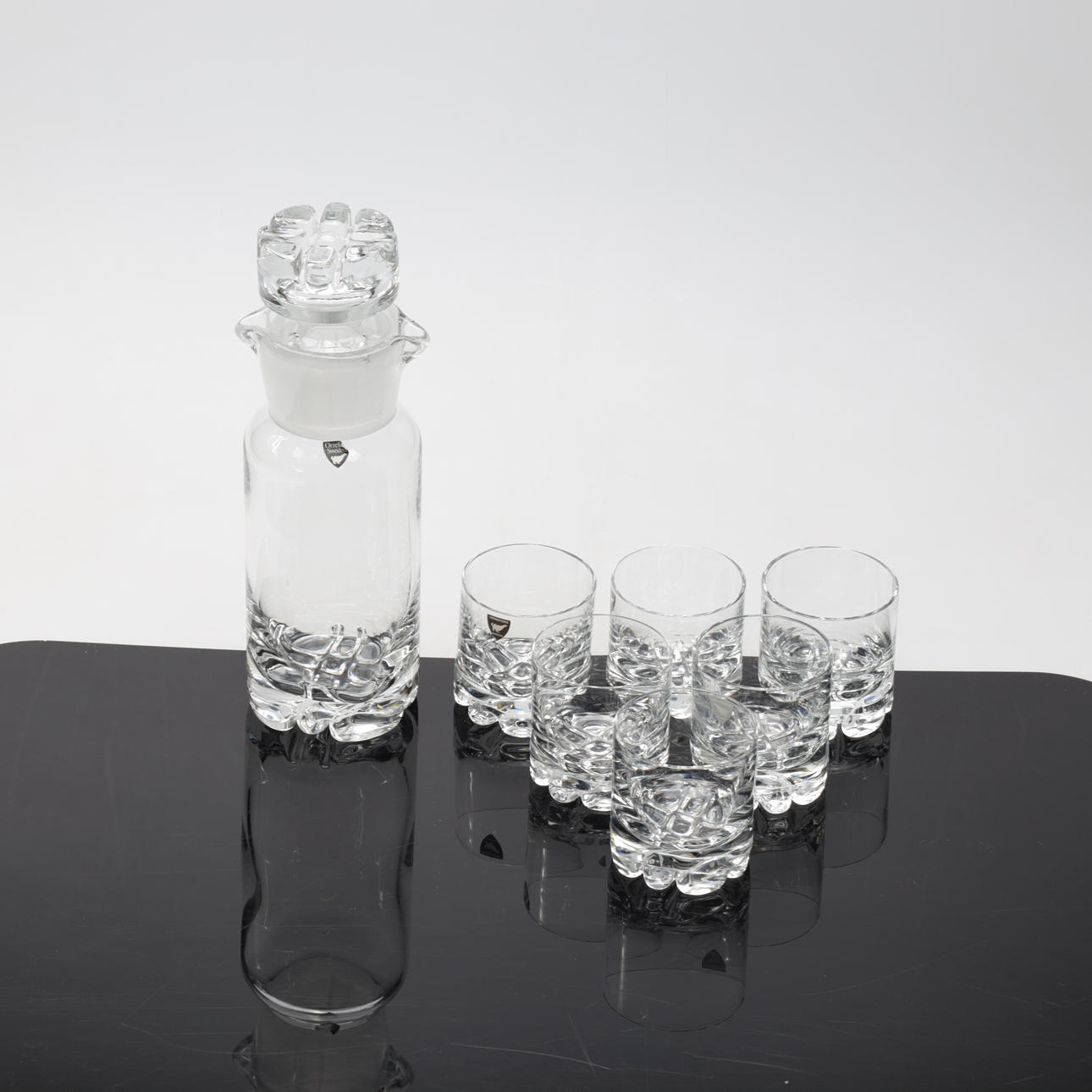 Karaff med 6 st glas. Höjd karaff ca 26 cm, glas ca 7 cm. Etikettmärkta.
