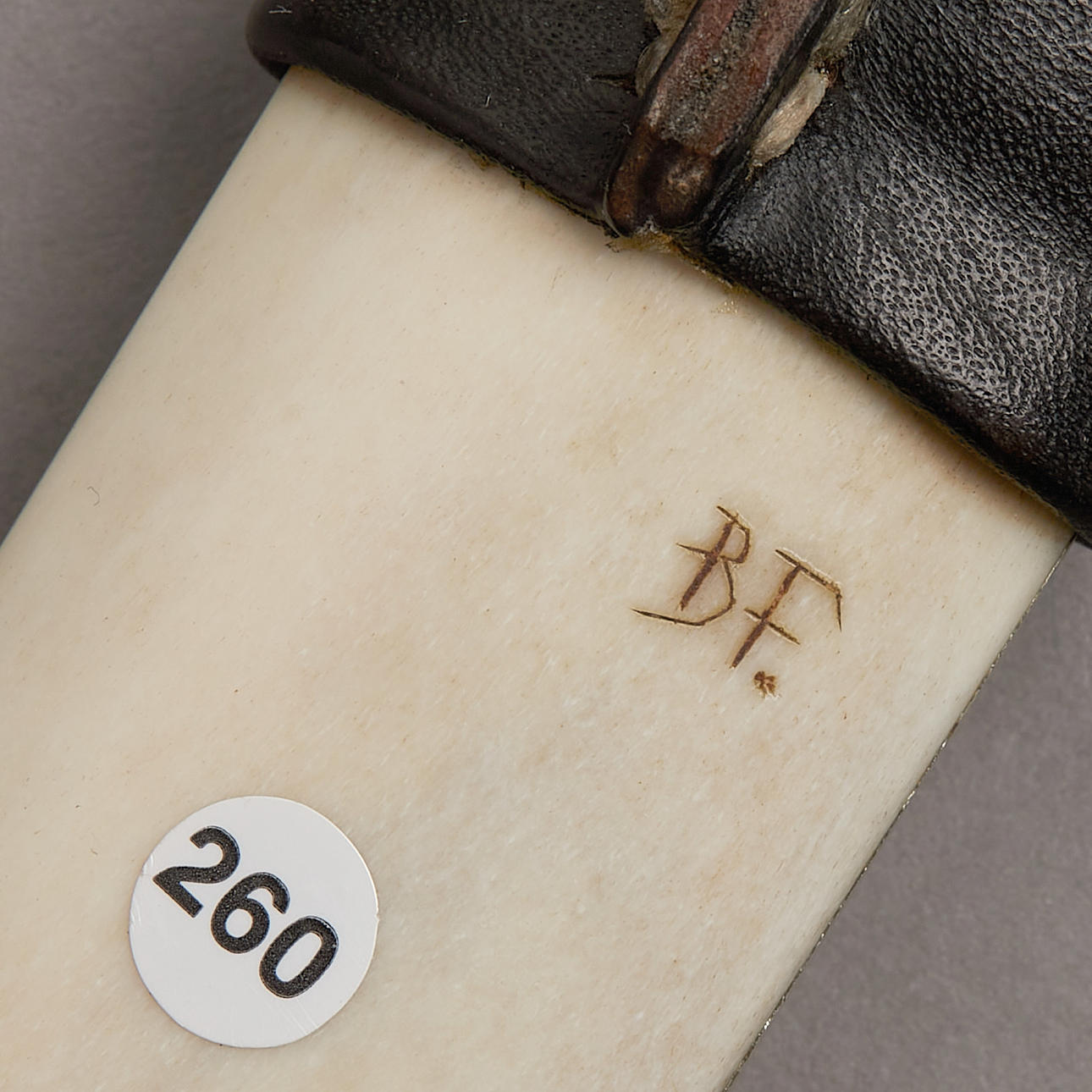 Graverad dekor med stiliserad blomma och geometrisk dekor, monogramsignerad, Roselli-blad, längd 21,5 cm.